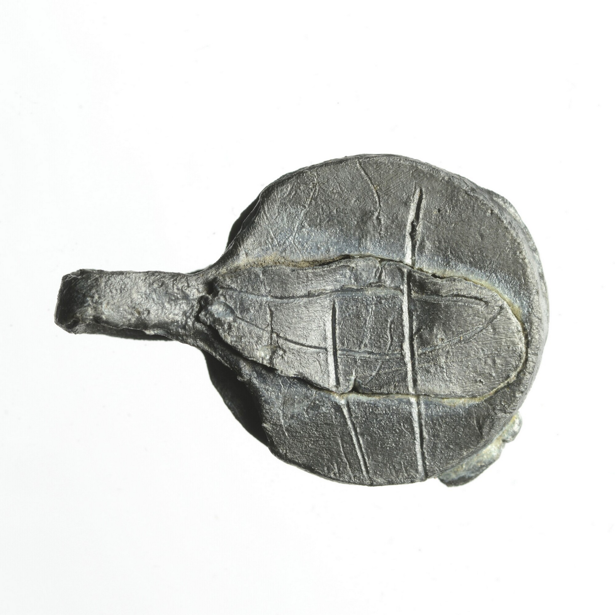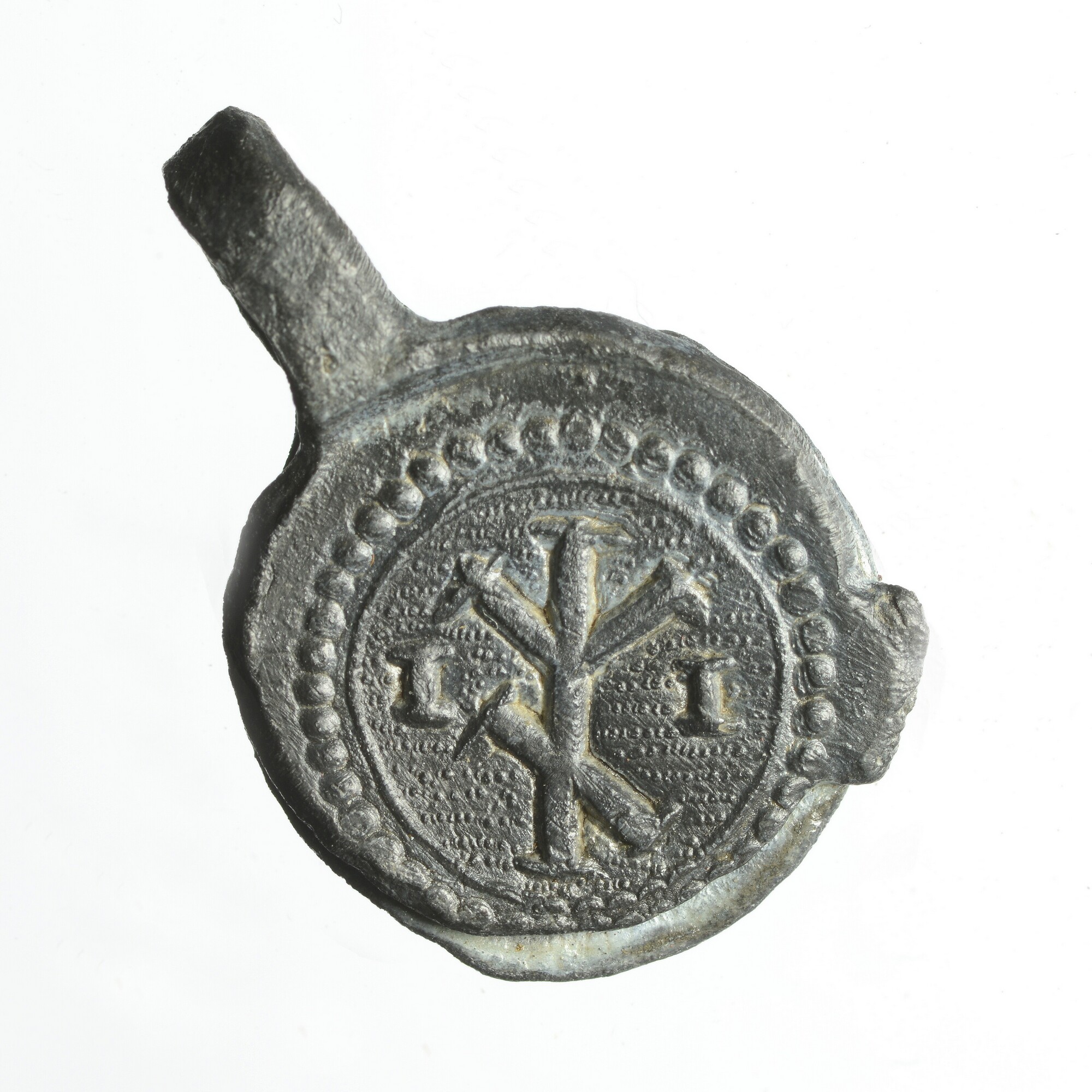 Textiellood/deelbewerkerslood; pb-tex; vz.: huismerk en initialen II; kz.: ingekraste strepen (telmerk)