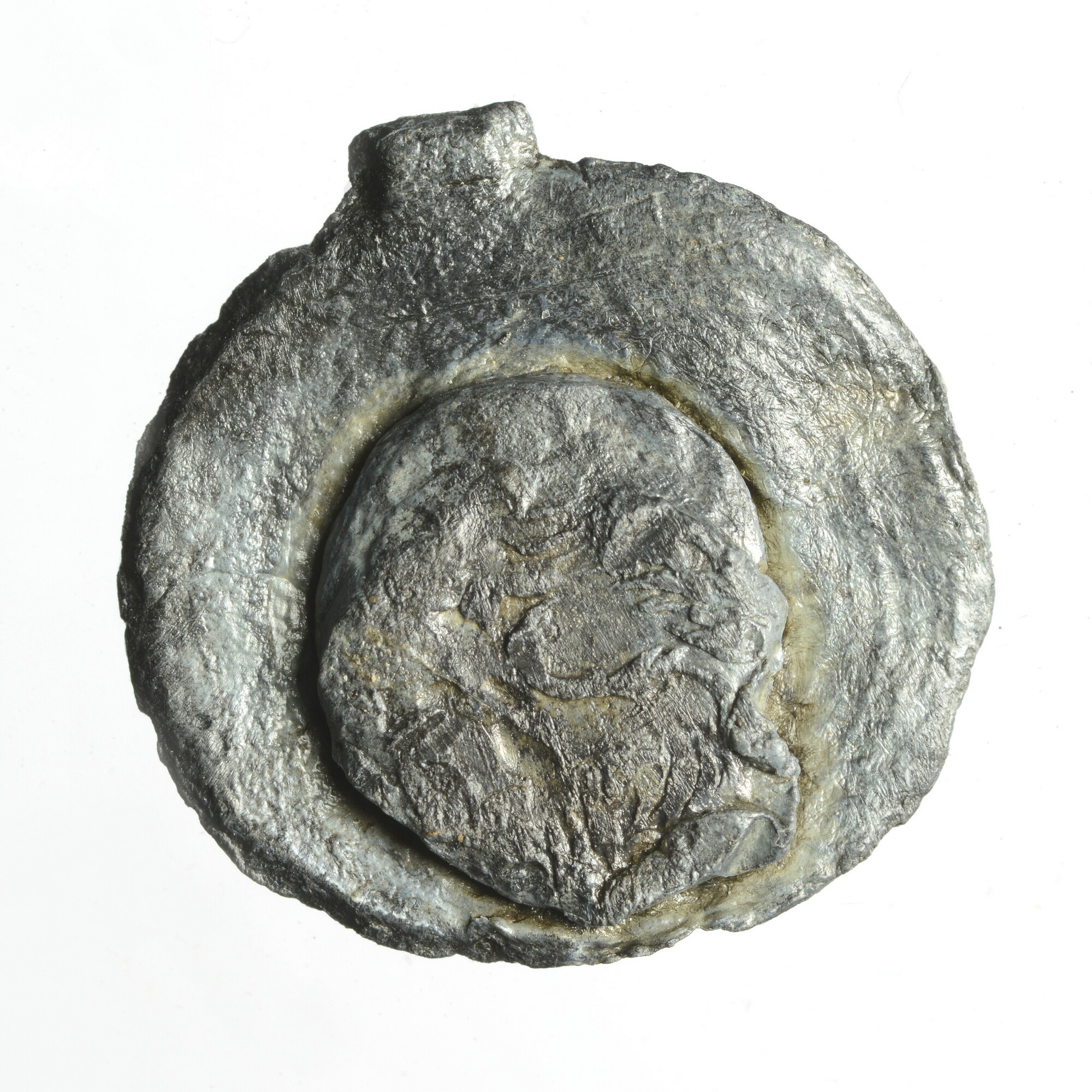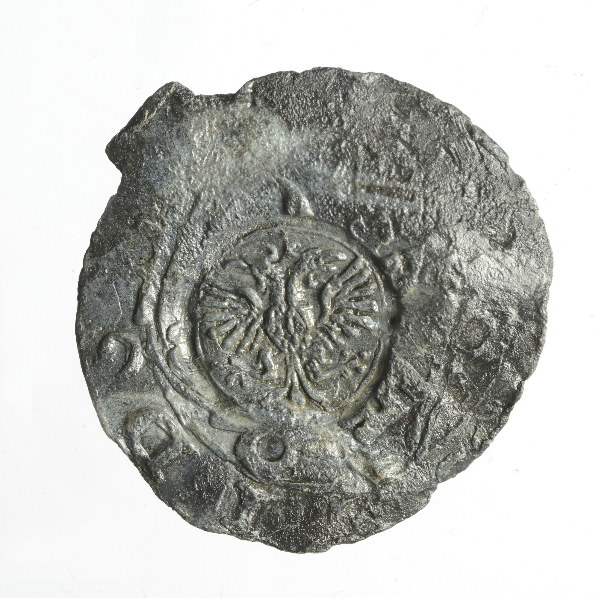 Textiellood Leiden; pb-tex; vz.: grote klop met dubbelkoppige adelaar (mogelijk over sleutels Leiden?) + tekst ..IDS..; kz.: indet. (incompleet)