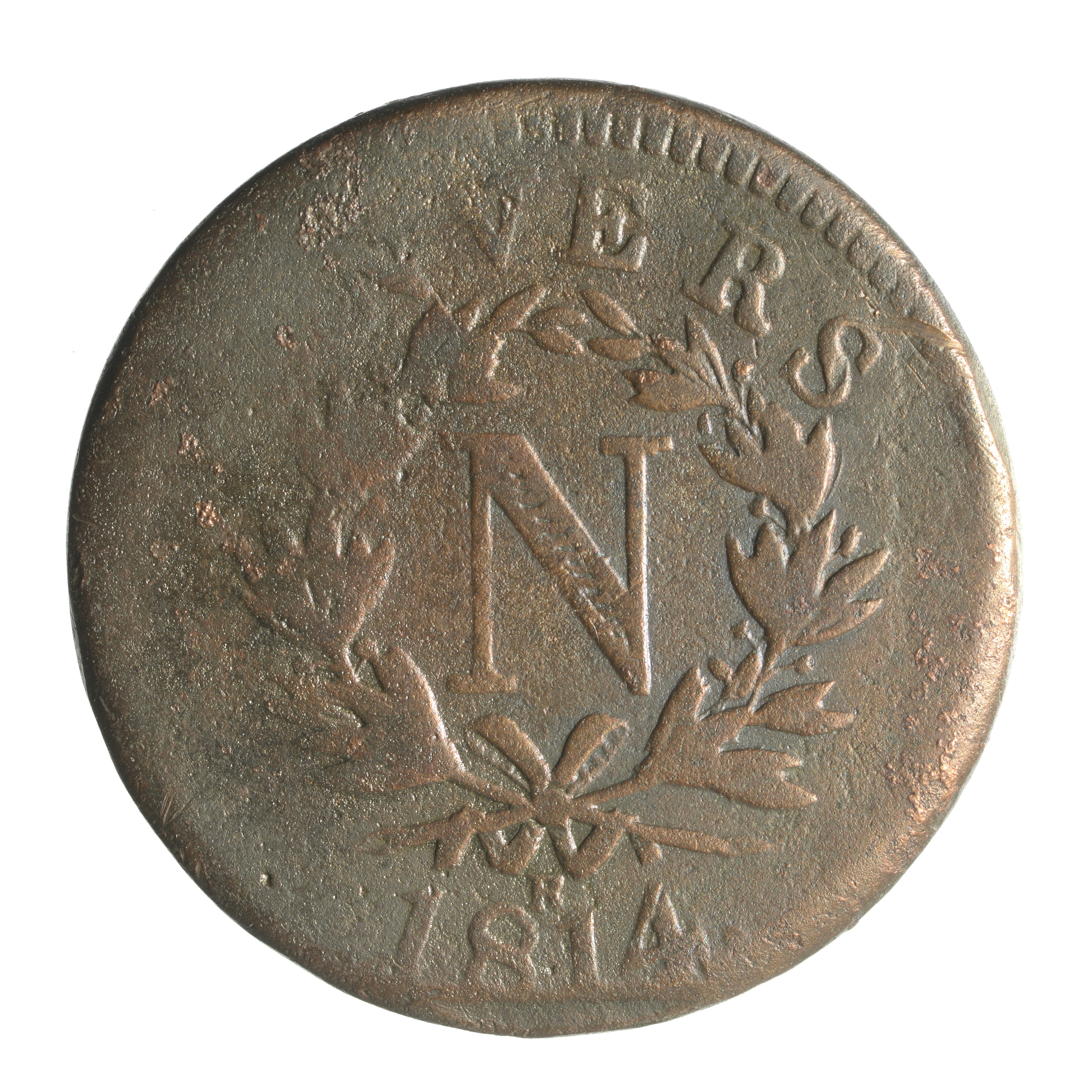 Noodmunt; 10 Centiem; Stad Antwerpen; vz.: monogram ‘N’ (Napoleon) binnen bladerkrans, onder de strik van de bladerkrans het signatuur R (Ricquier), omschrift: ANVERS 1814; kz.: MONNAIE OBSIDIONALE, 10 CENT.; muntplaats: Antwerpen, muntatelier Wolschot; graveur: F.J. Ricquier; datering: 01-04-1814 t/m 18-04-1814; gewicht: 25.15 gram