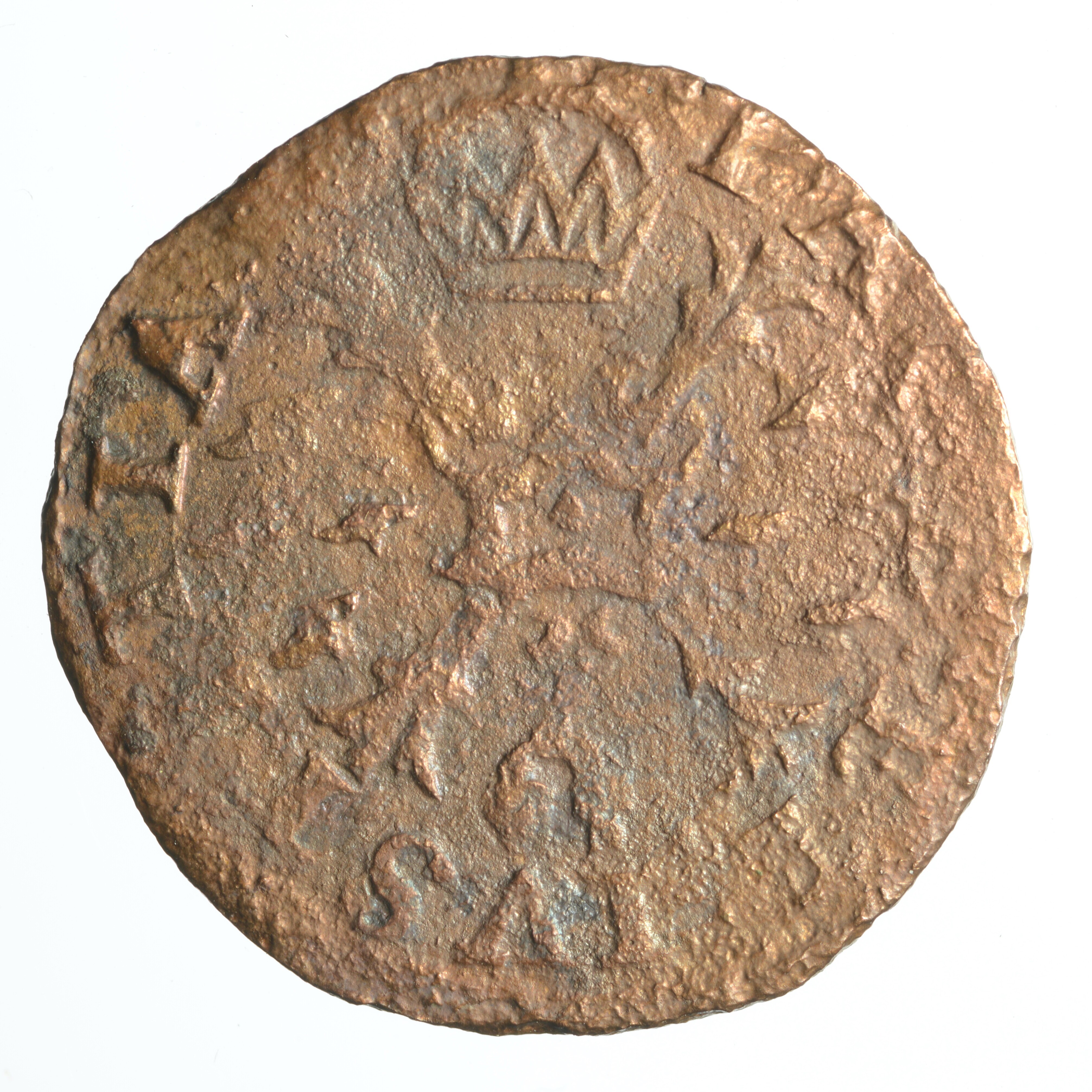 Statenduit; Hertogdom Brabant (1183-1795); Philips II (1555-1598)I; vz.: wapenschild Oostenrijk-Bourgondië, omschrift: PHS.D:G.HISP.Z.REX.DVX.BRA; kz.: gekroond vuurijzer op takkenkruis, omschrift: PACE.ET.IVSTITIA; muntplaats: Antwerpen; gewicht: 2.99 gram
