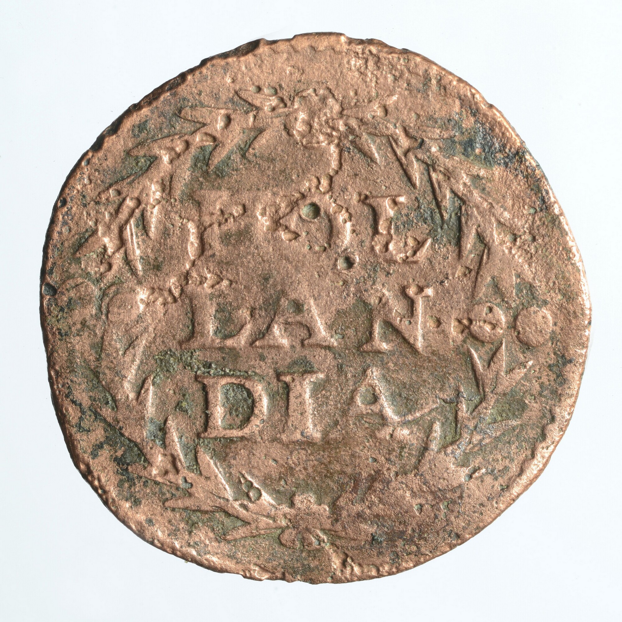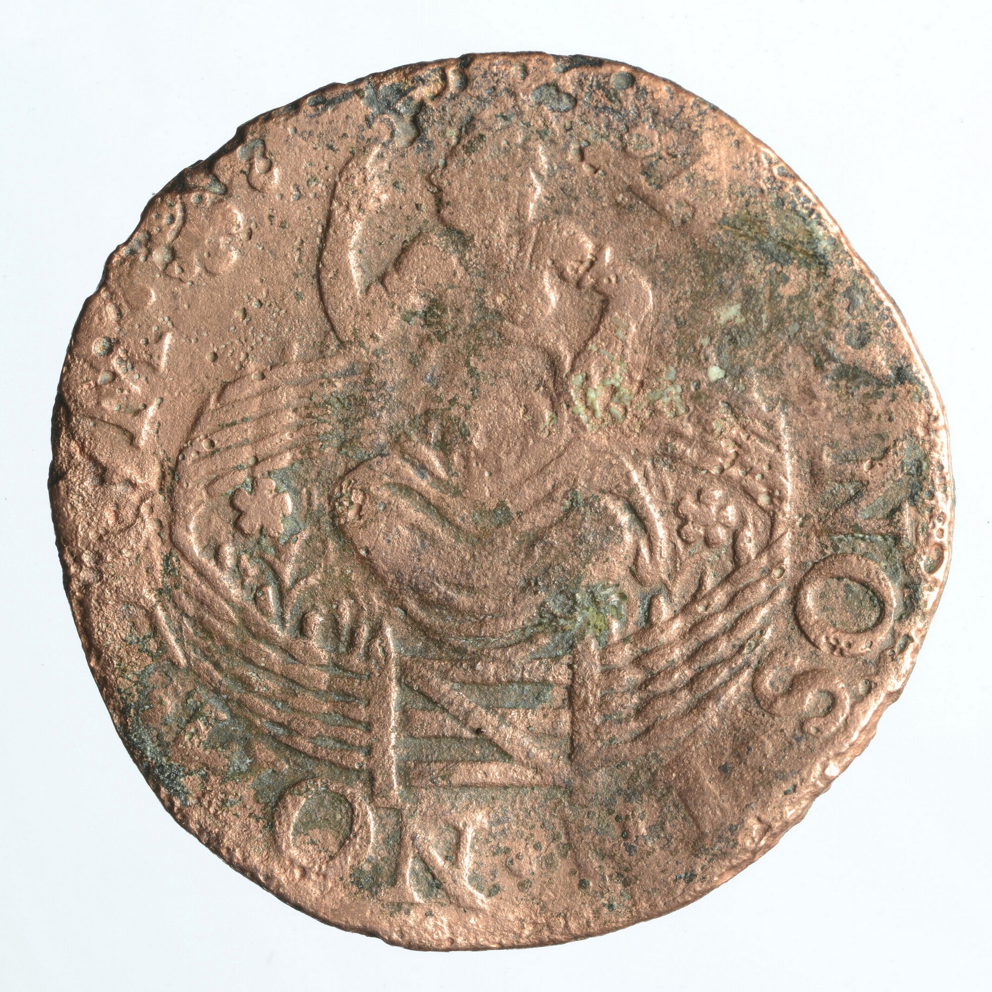 Duit; Holland Provincie (1581-1795); vz.: een tulpkrans met daarin de tekst HOL LAN DIA in drie regels; kz.: de Hollandse maagd zittende in een gesloten tuin. Zij wijst met haar rechterhand naar een zonnige hemel als teken van het vertrouwen op de Heer en randtekst: .AVX. NOS. IN. NOM. DOM.; muntplaats: Dordrecht; gewicht: 3.28 gram