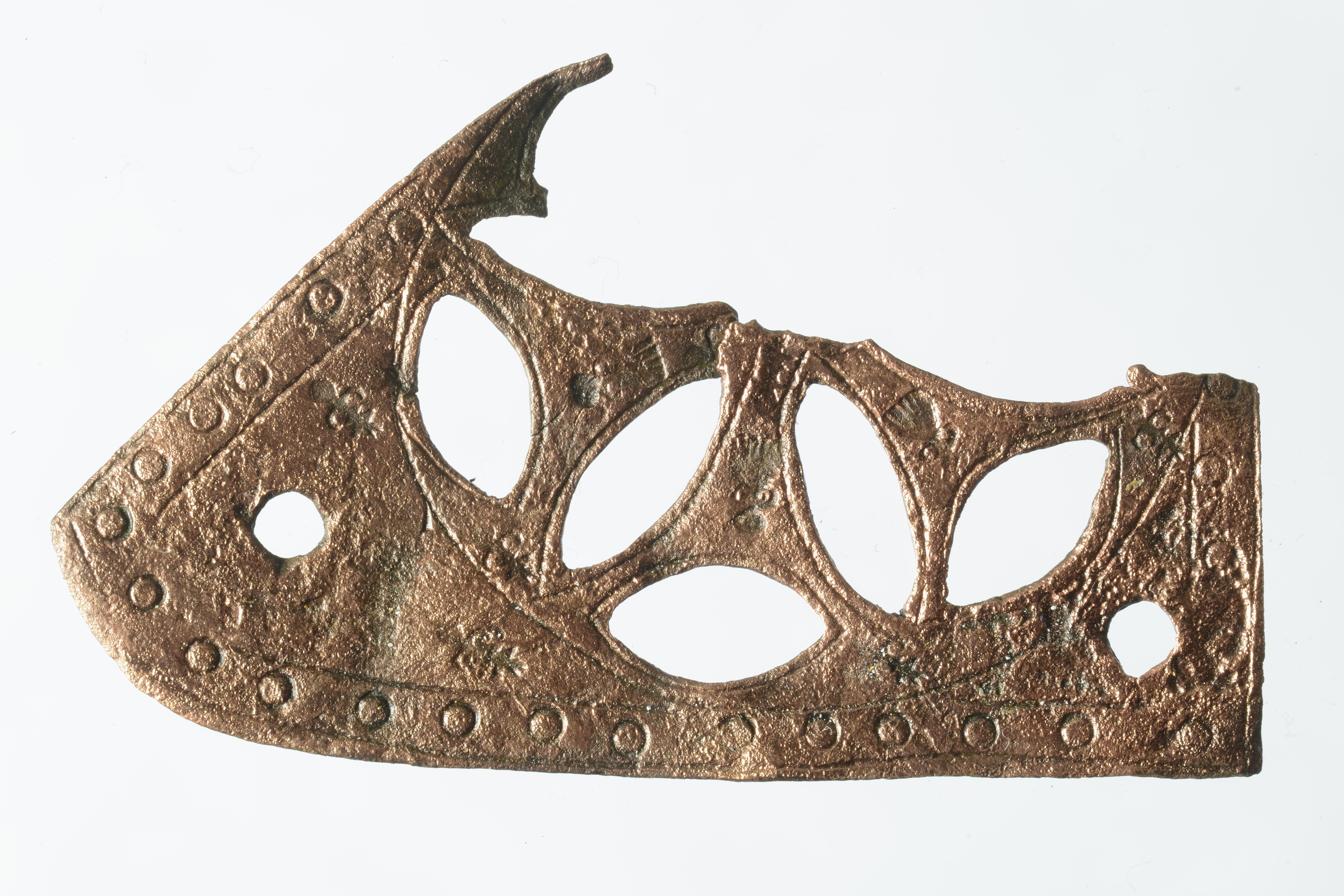 Beslagplaat?; rechthoekige plaat met uitsparingen, punt-cirkelversiering langs de rand en twee gaten; aantal kloppen met motieven van de Franse lelie en vrouwelijk figuur