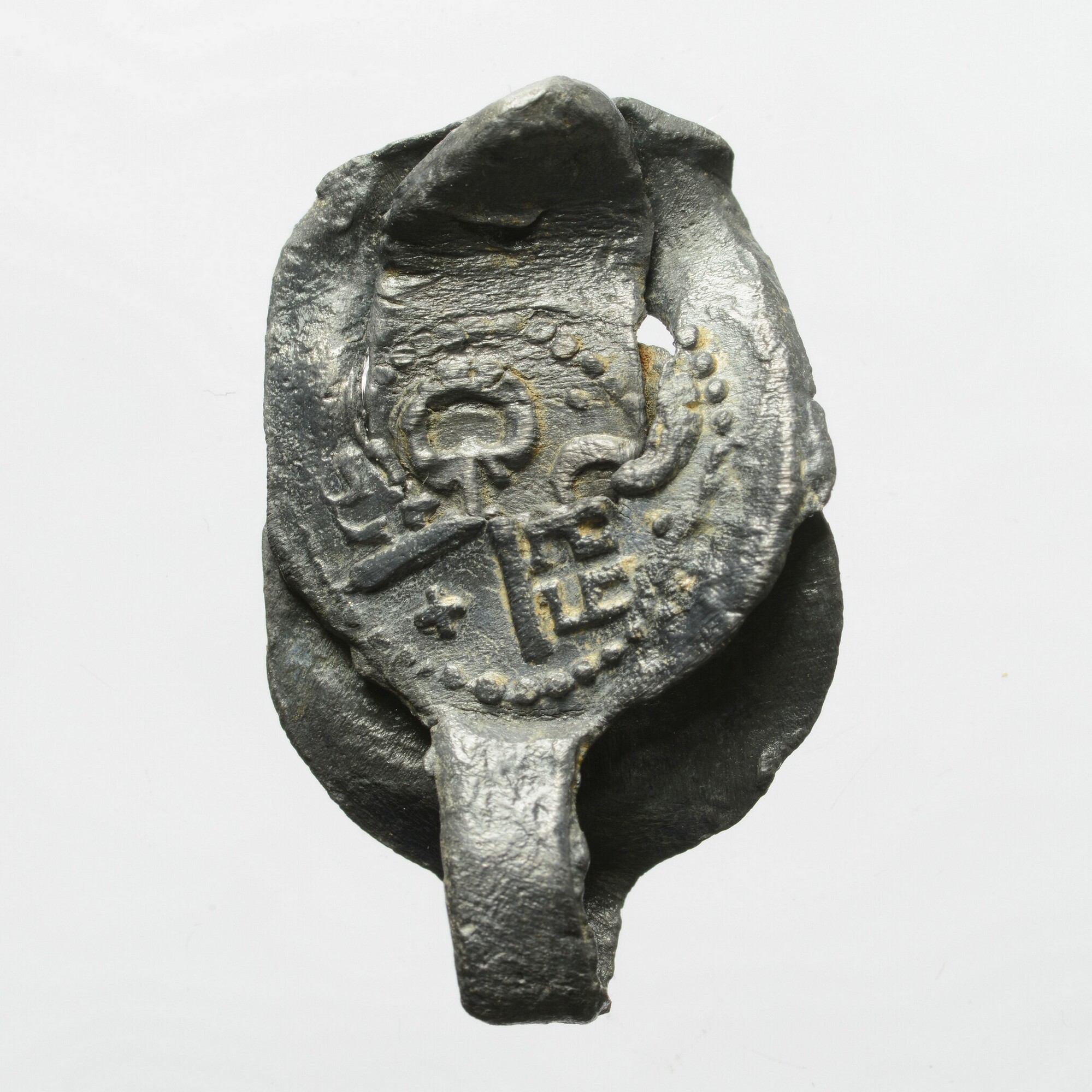 Textiellood; pb-tex; vz.: gekruisde sleutels, kz.: tekst: GHE BLAEVT MIT WE DE; herkomst: Leiden