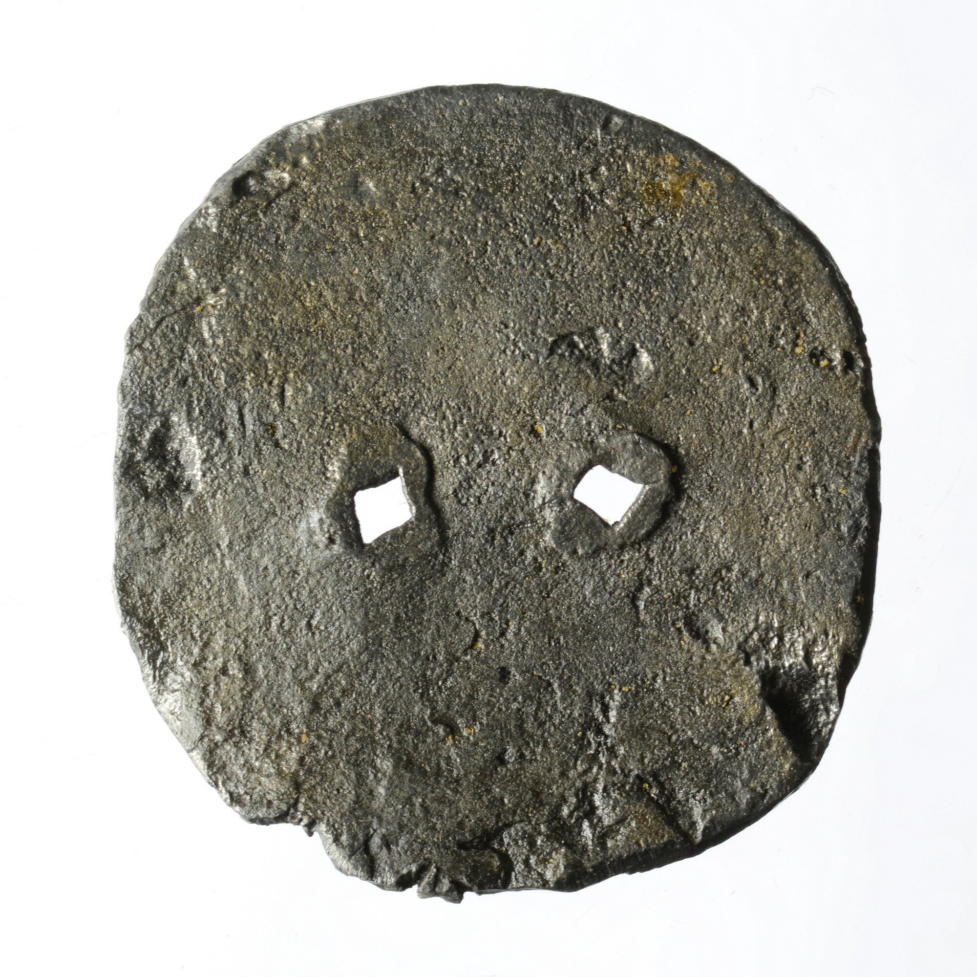 Snorrebot; ronde schijf met twee perforaties en gladde rand
