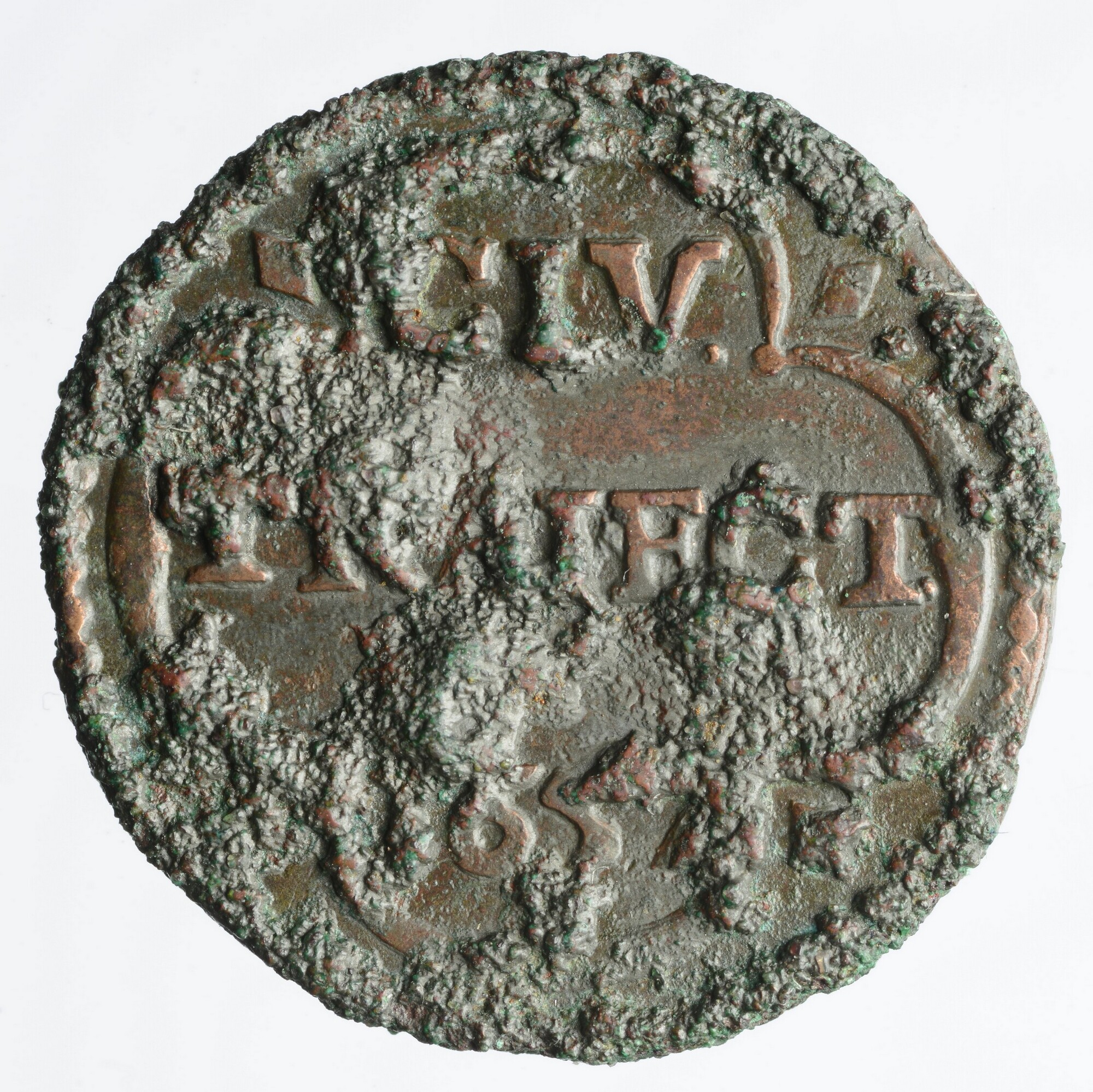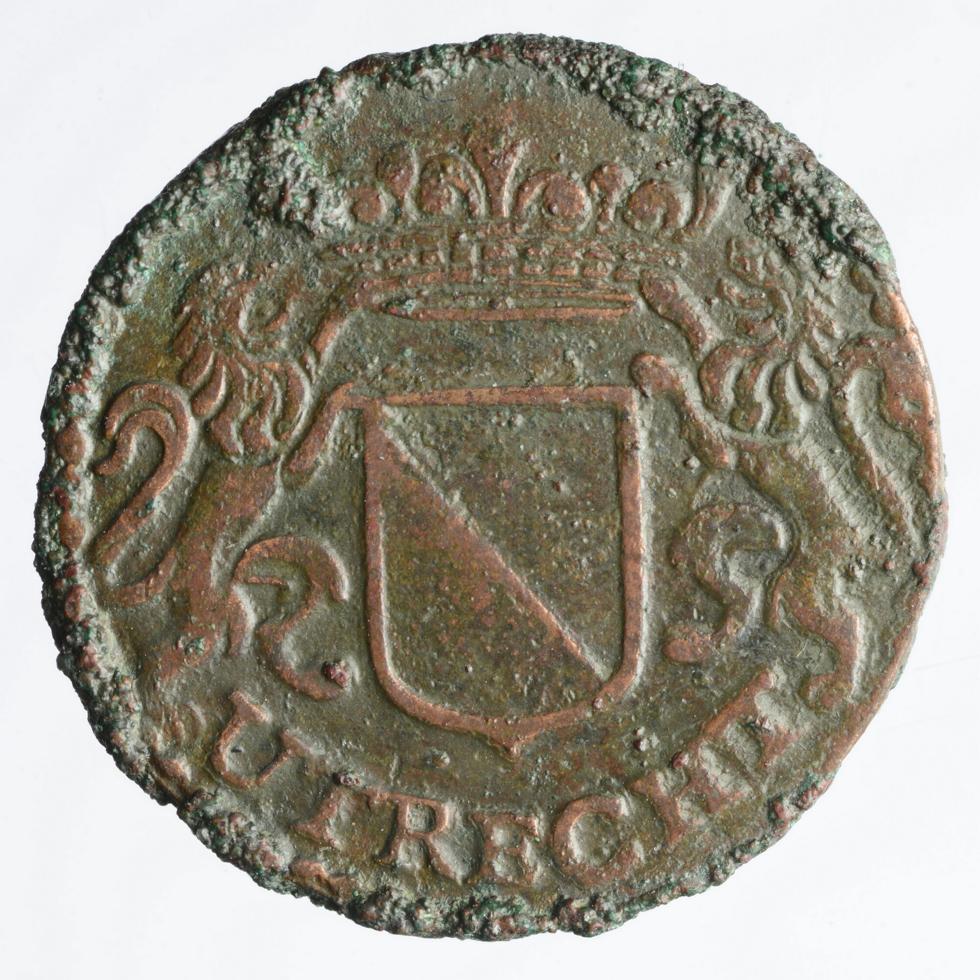Duit; Stad Utrecht (1581-1795); vz.: in drie regels: CIV / TRAIECT / 1657 binnen vierpas; kz.: gekroond en horizontaal gearceerd wapenschild gehouden door twee leeuwen, omschrift: UTRECHT; muntplaats: Utrecht; gewicht: 3.60 gram