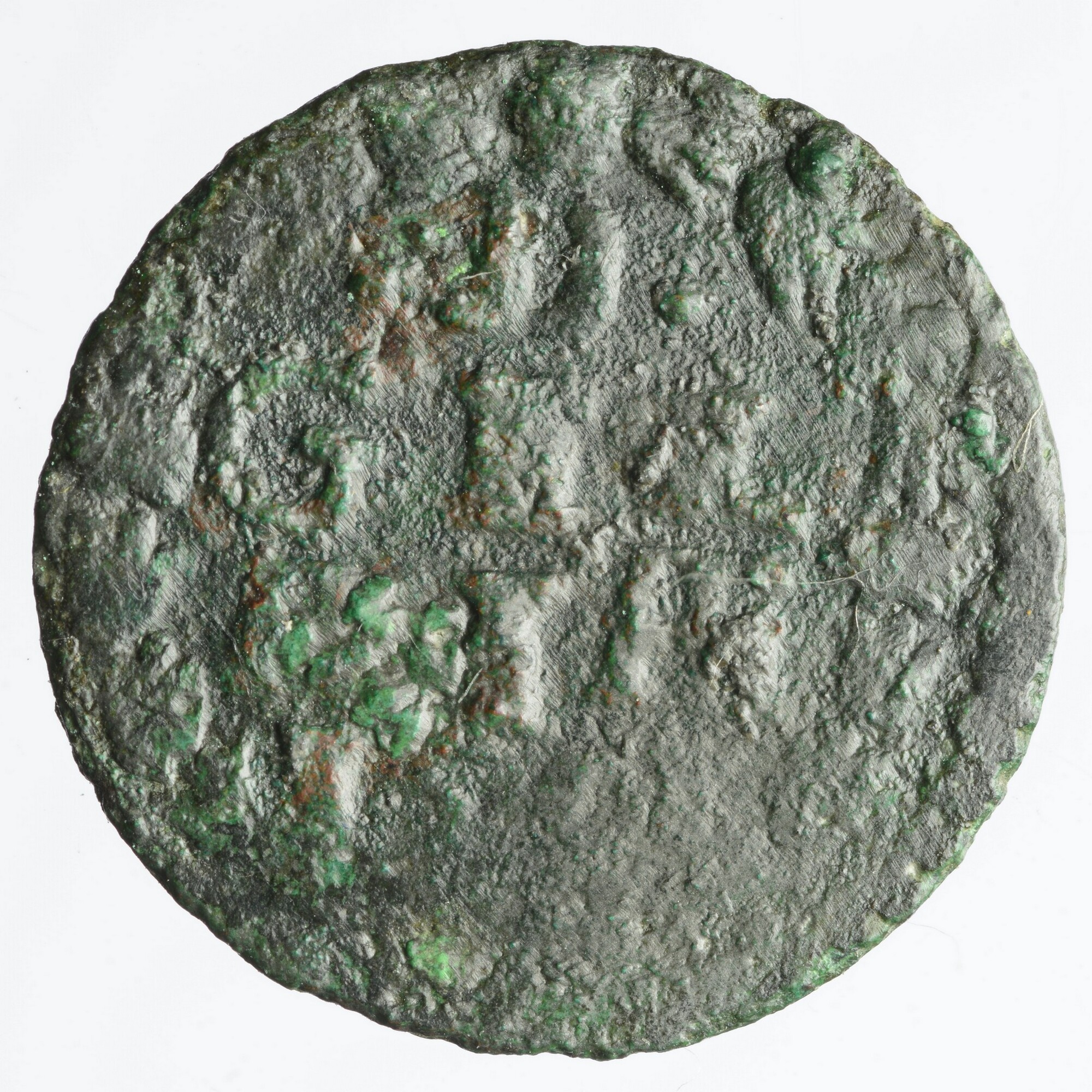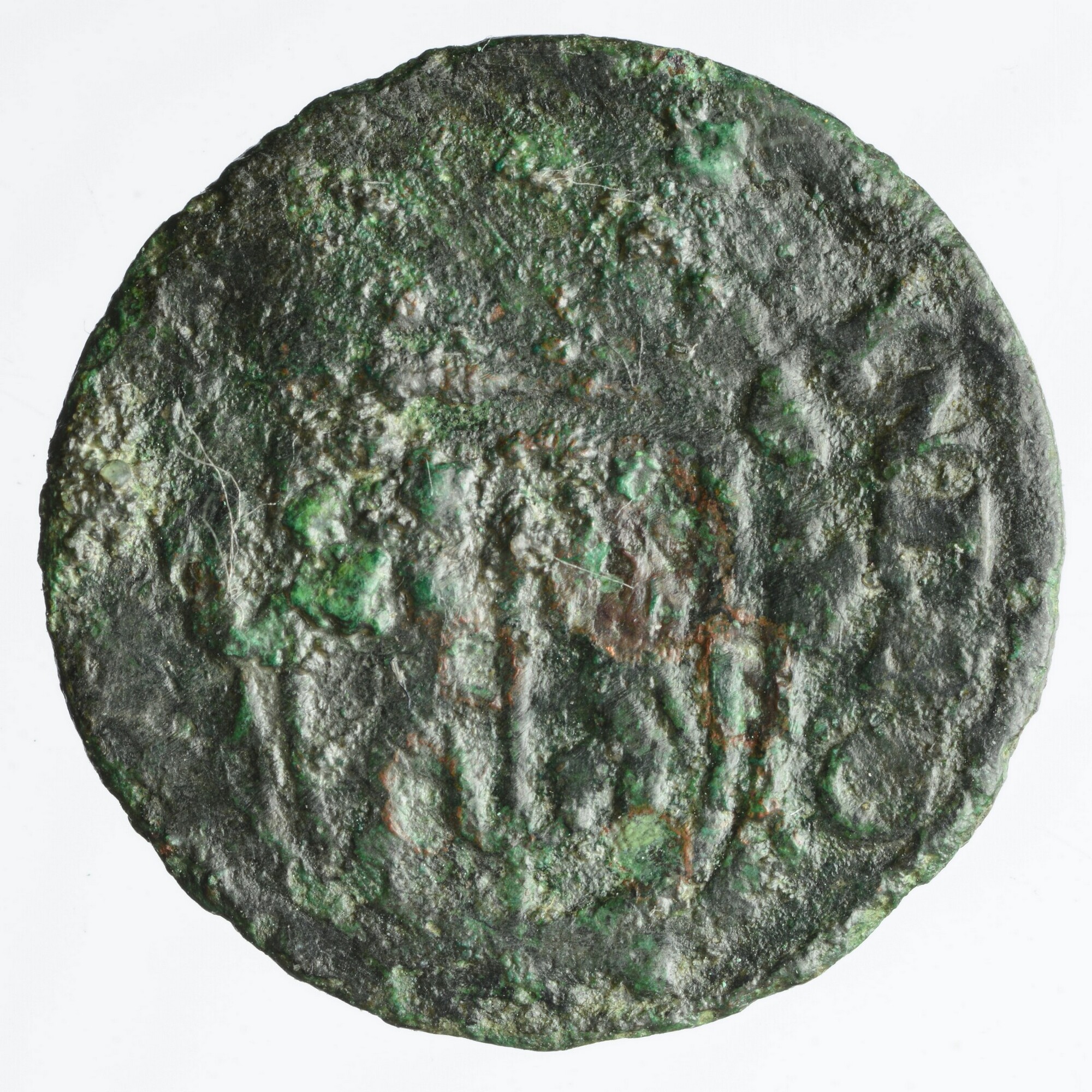 Duit; Provincie Gelderland (1581-1795); vz.: in vier regels: D / GEL / RIAE / 16(??) binnen bladerkrans; kz.: gekroond wapenschild van Gelderland, omschrift: IN.DEO.SP.NOST; gewicht: 1.91 gram