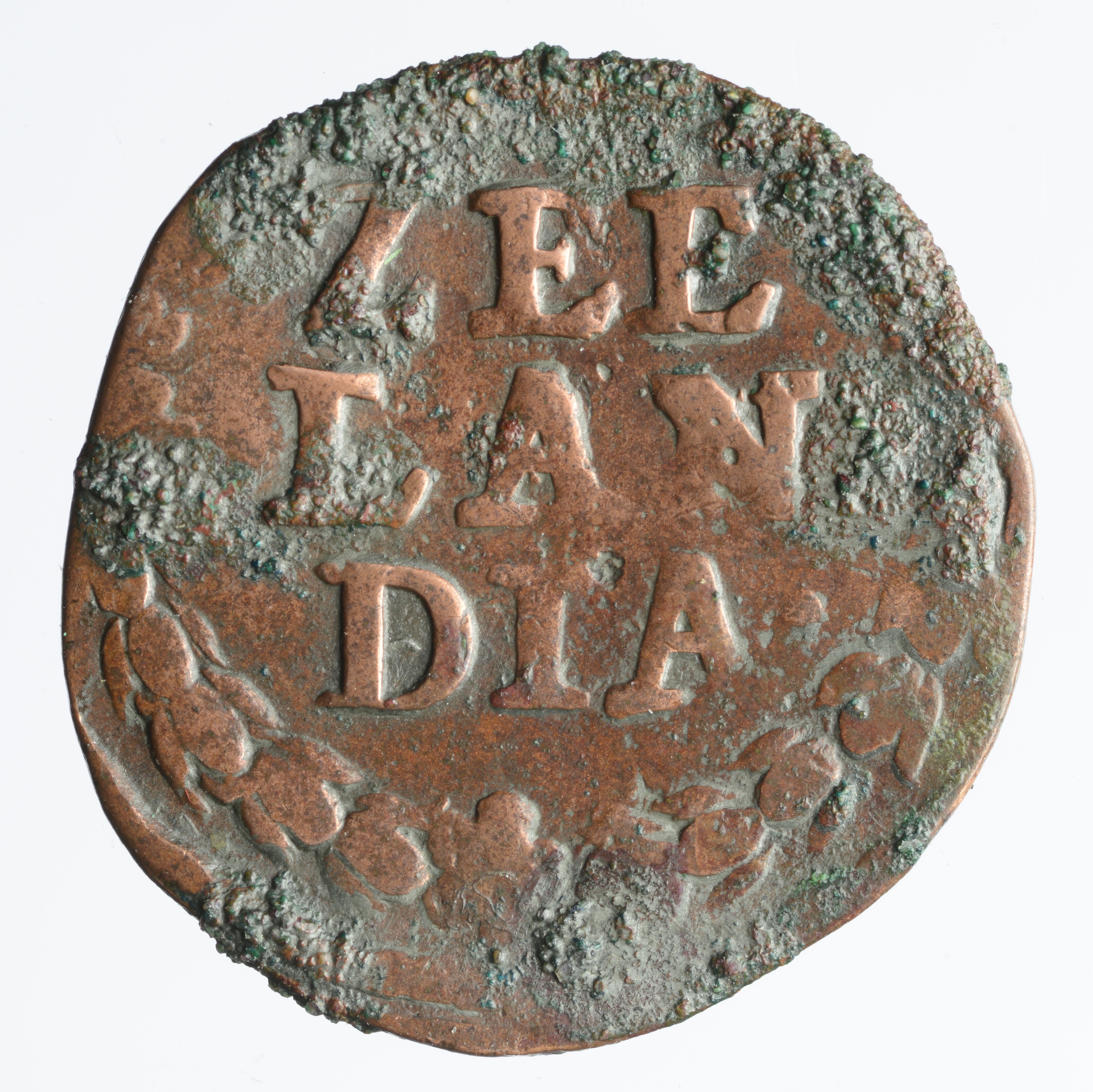 Duit; Provincie Zeeland (1581-1795); vz.: in drie regels ZEE / LAN / DIA binnen bladerkrans; kz..: Hollandse maagd in tuin, aan het hek van de tuin het wapenschild van Zeeland, omschrift LVCTOR.ET.EMERGO.166??; gewicht: 1.67 gram