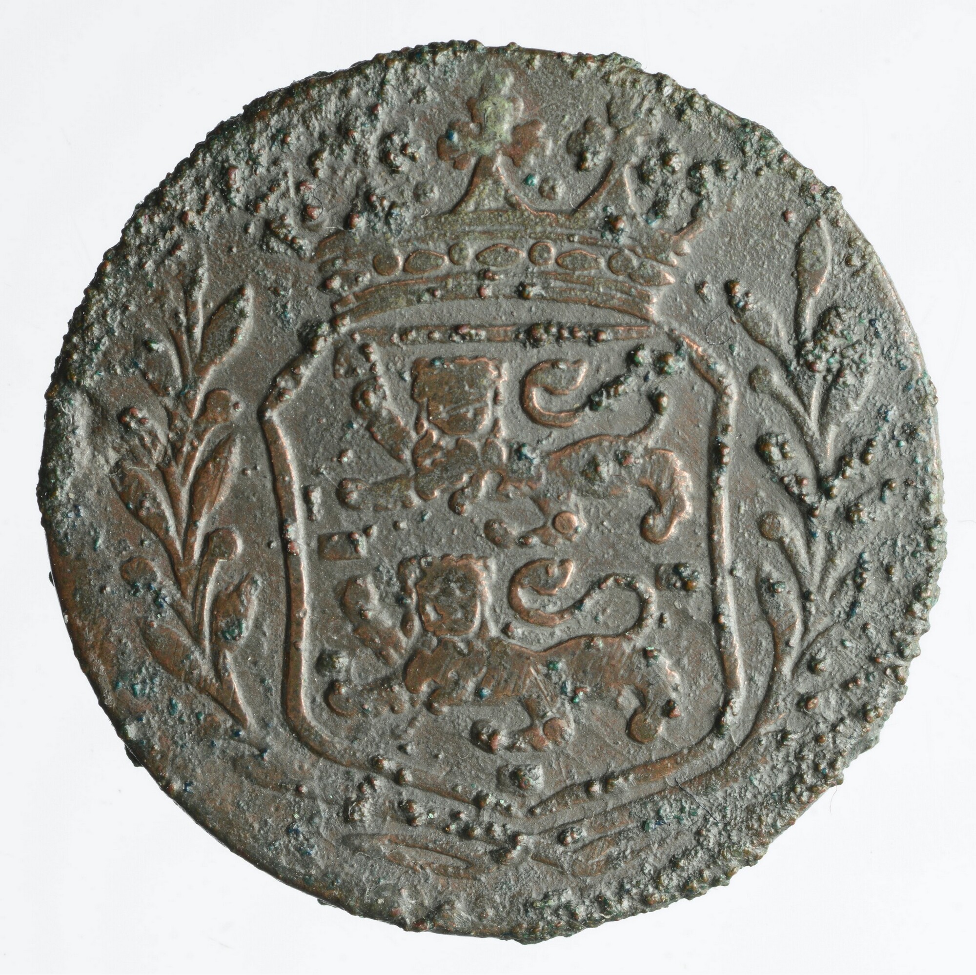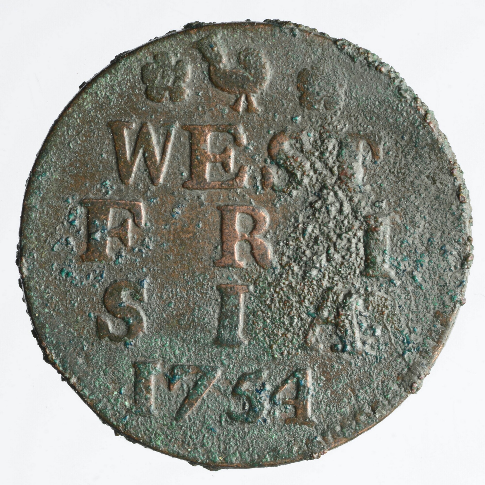 Duit; Provincie West-Friesland (1581-1795); vz.: muntmeesterteken haan tussen twee rozetten met daaronder in vier regels WEST / FRI / SIA / 1754; kz.: gekroond wapen van West-Friesland binnen bladerkrans; gewicht: 3.35 gram