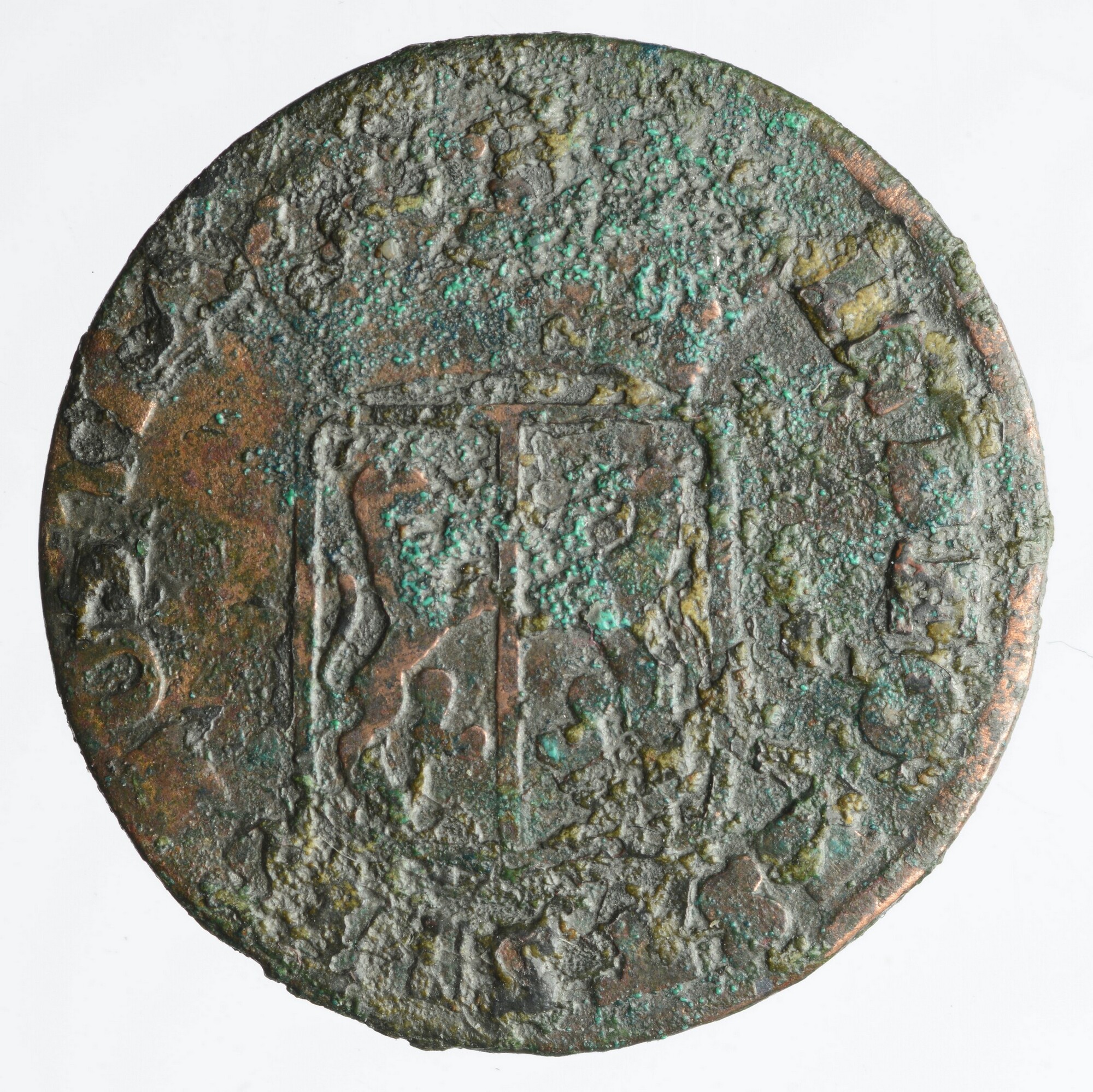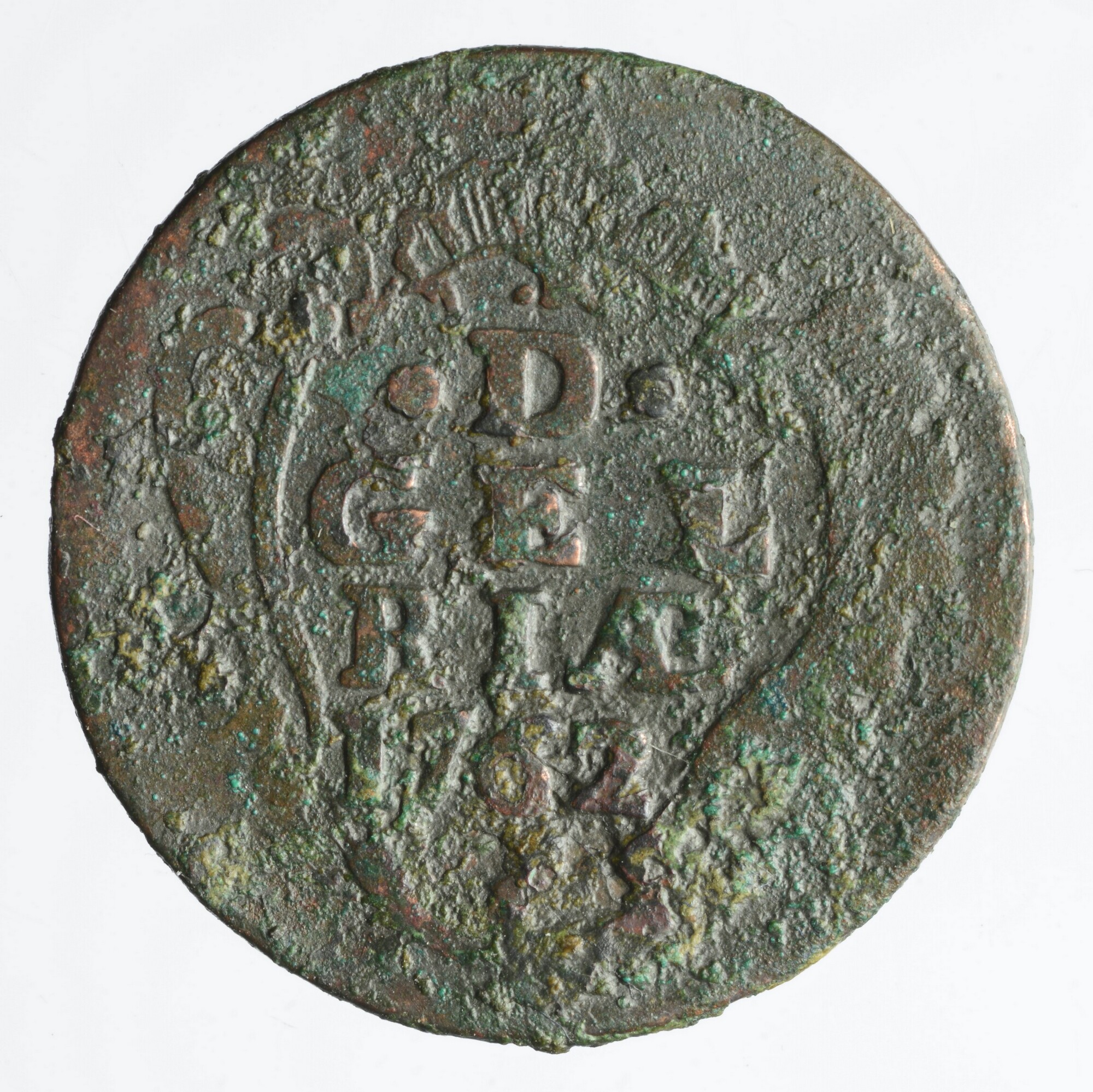 Duit; Provincie Gelderland (1581-1795); vz.: in vier regels .D. / GEL / RIAE / 1762 binnen rococo versiering; kz.: gekroond wapen van Gelderland, omschrift: IN DEO EST SPES NOSTRA; gewicht: 2.95 gram