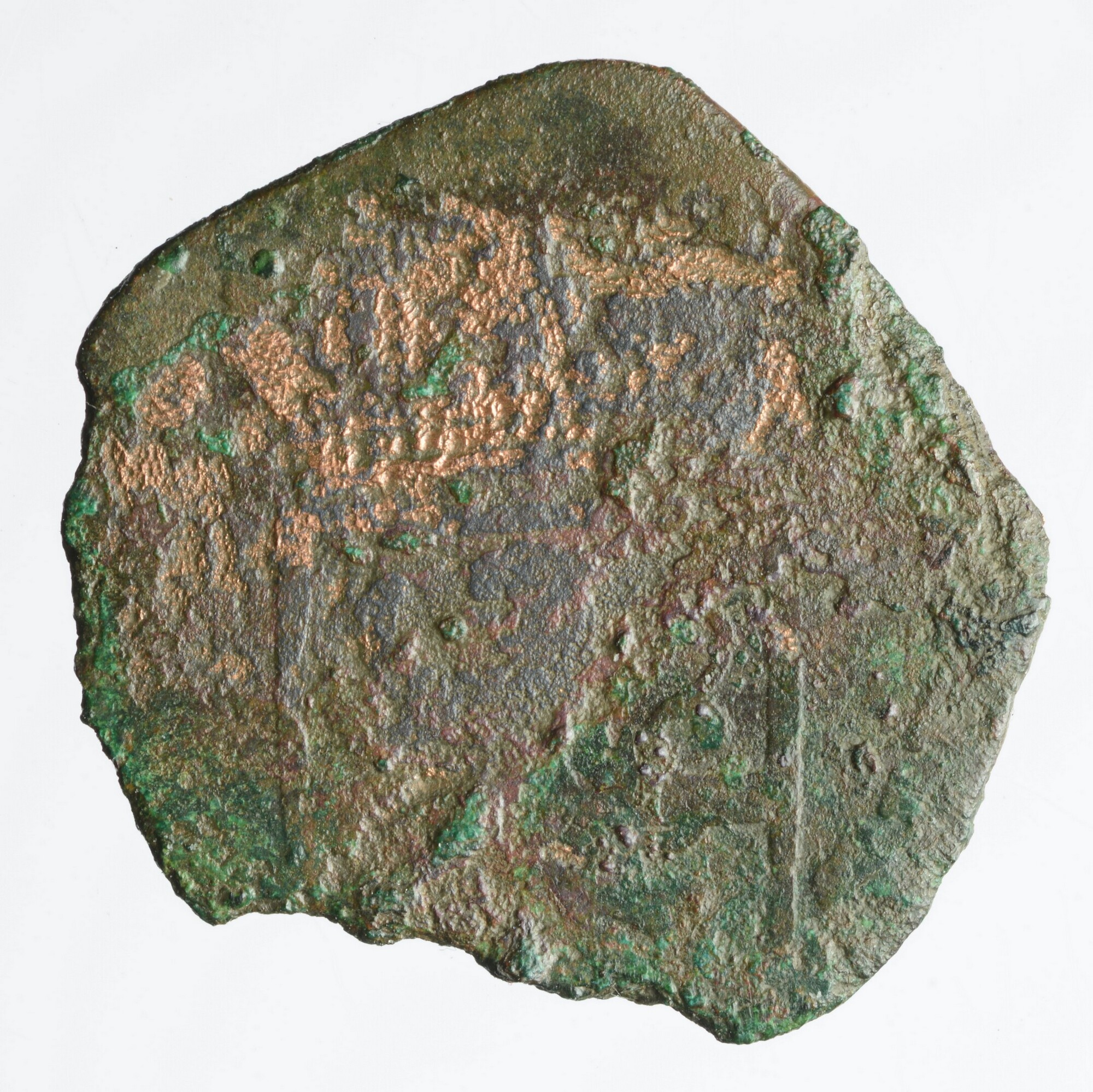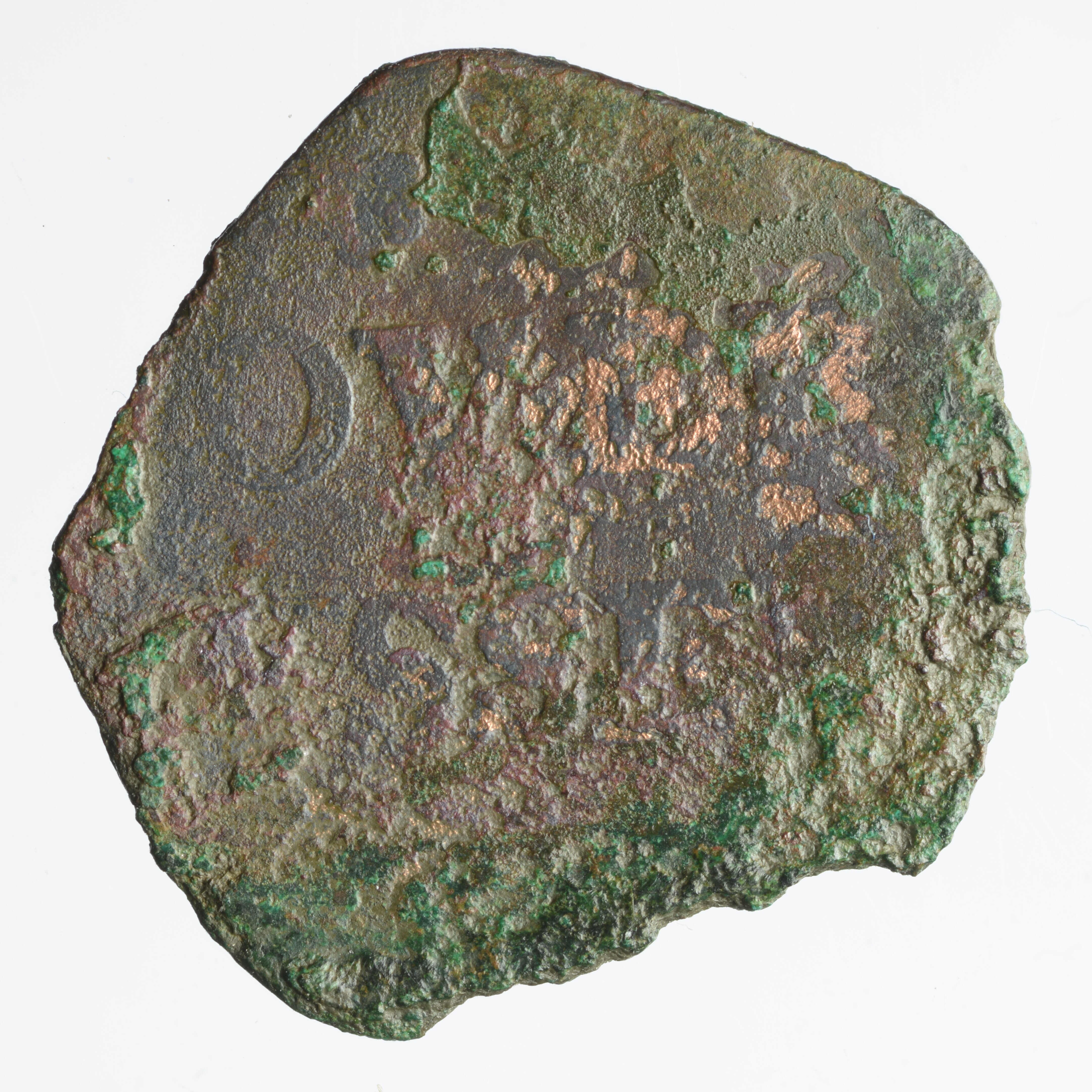 Duit; Provincie Overijssel (1581-1795); vz.: muntmeesterteken tussen twee rozetten (onleesbaar) met daaronder in drie regels OVER / YSSEL / jaartal; kz.: gekroond wapen van Overijssel met golvende lijn, omschrift: onleesbaar; gewicht: 1.72 gram