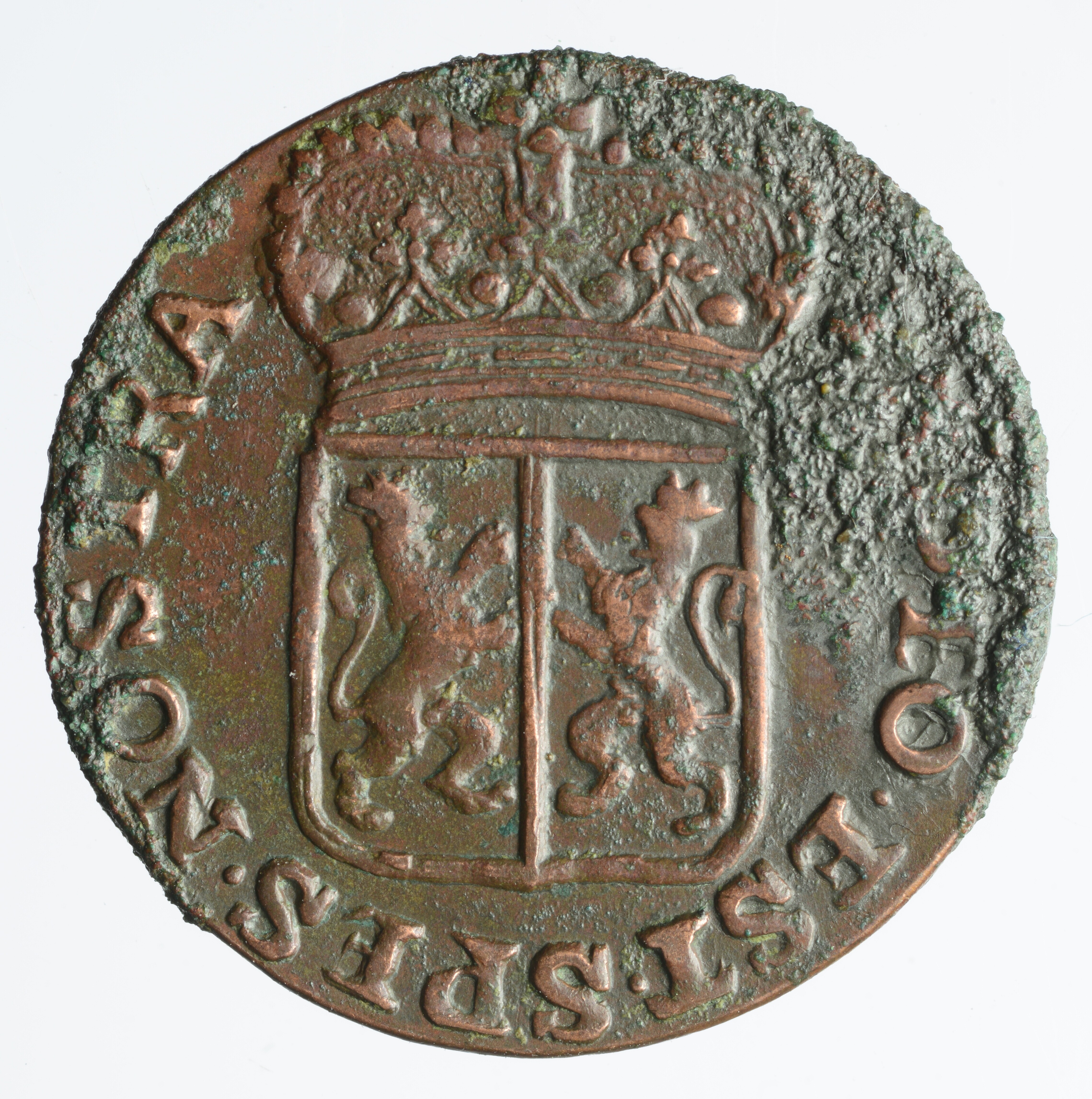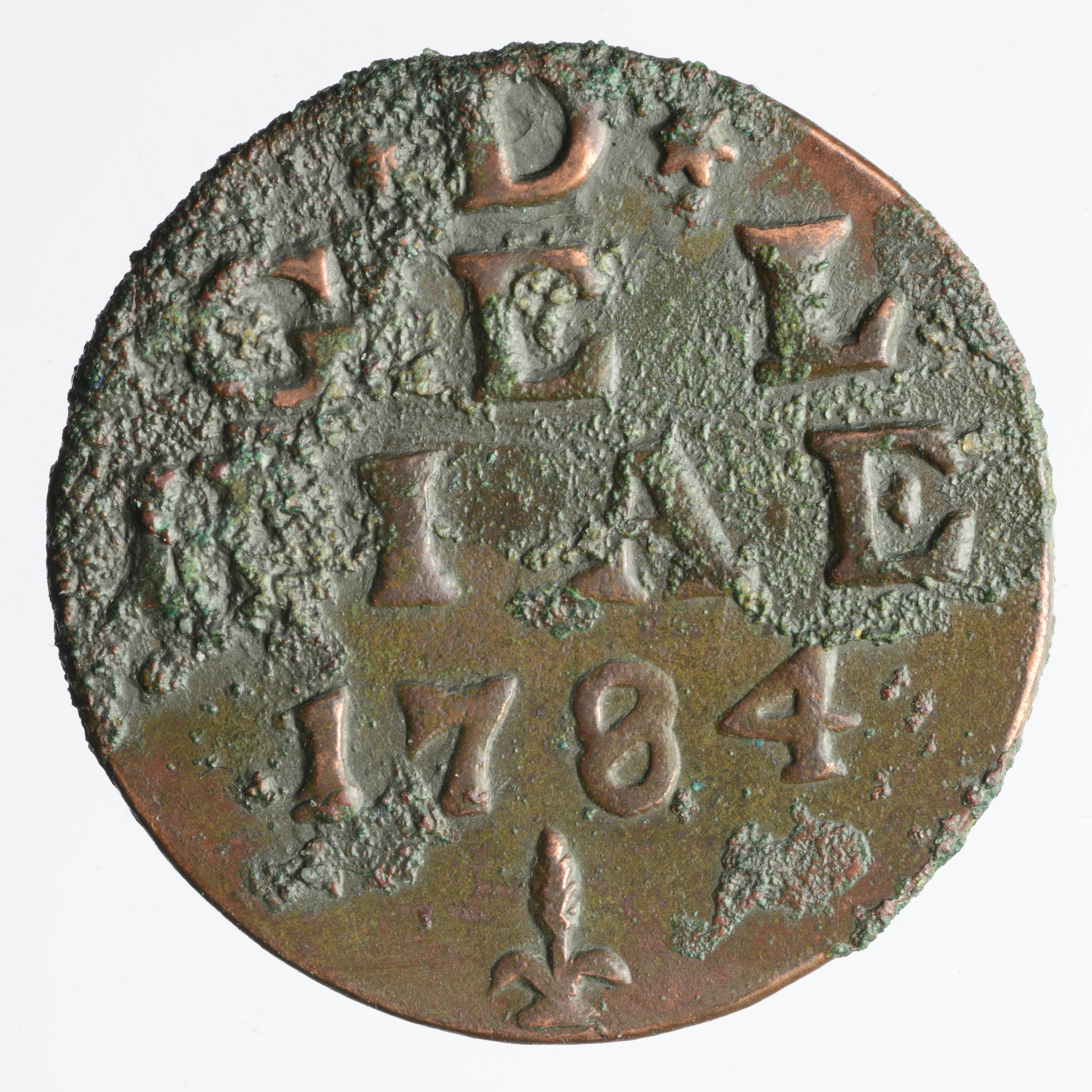 Duit; Provincie Gelderland(1581-1795); vz.: in vier regels D / GEL / RIA / 1784 en daaronder het muntmeesterteken korenaar; kz.: gekroond wapen van Gelderland, omschrift: IN DEO EST SPES NOSTRA; gewicht: 3.08 gram