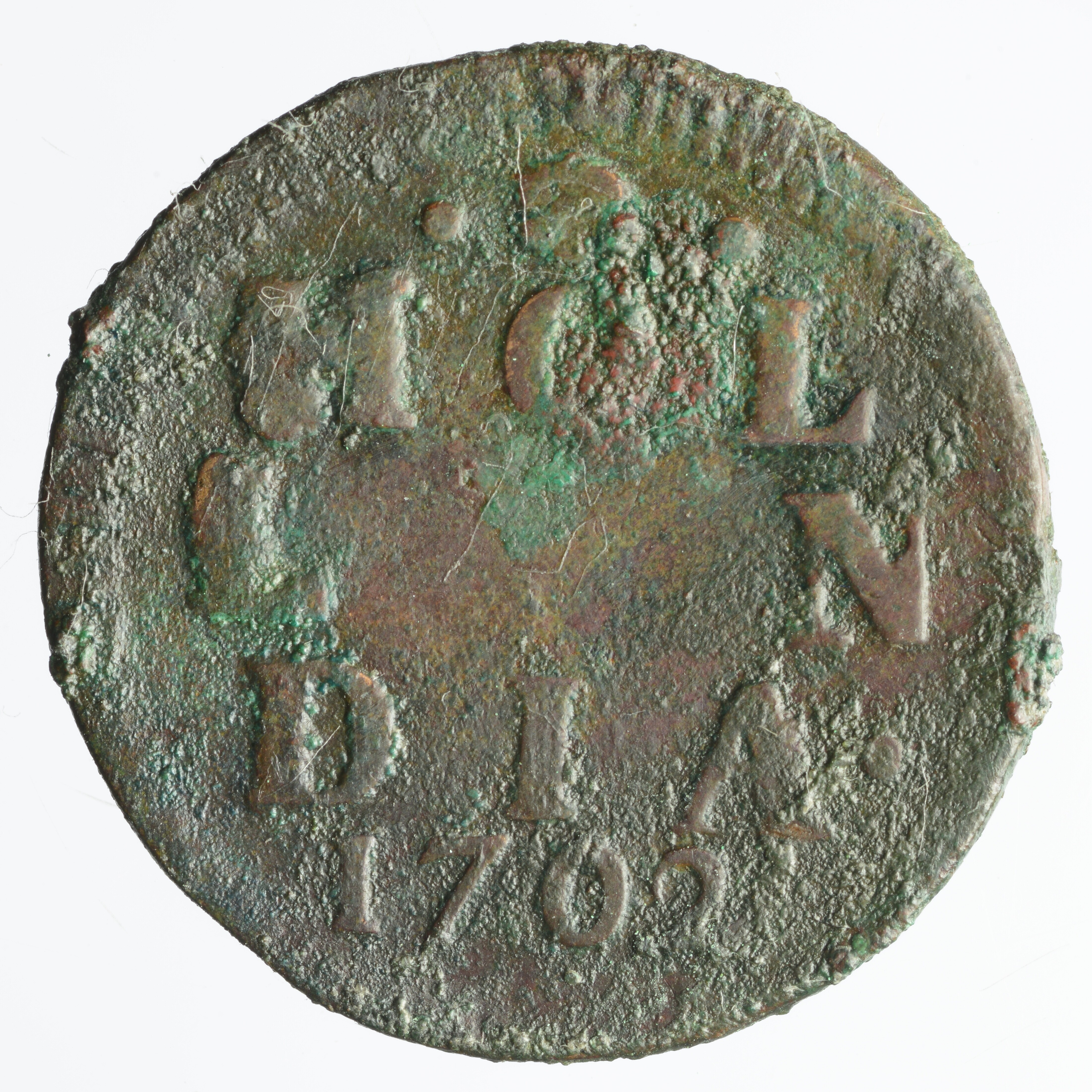 Duit; Provincie Holland (1581-1795); vz.: in vier regels HOL / LAN / DIA / 1702; kz.: Hollandse leeuw met vrijheidshoed in gesloten Hollandse tuin; gewicht: 3.01 gram