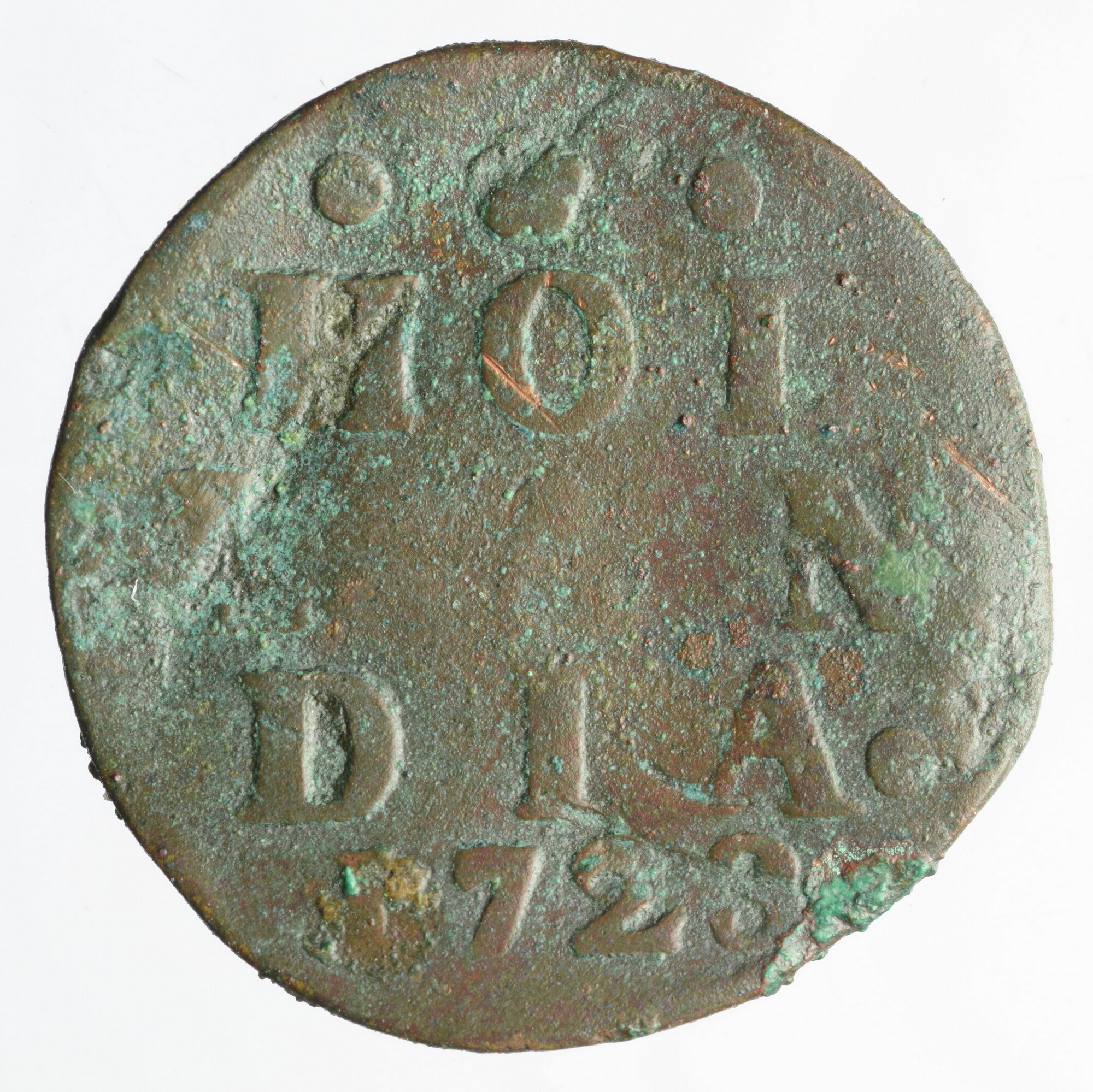 Duit; Provincie Holland (1581-1795); vz.: in vier regels HOL / LAN / DIA / 1723; kz.: Hollandse leeuw met vrijheidshoed in gesloten Hollandse tuin; gewicht: 2.86 gram