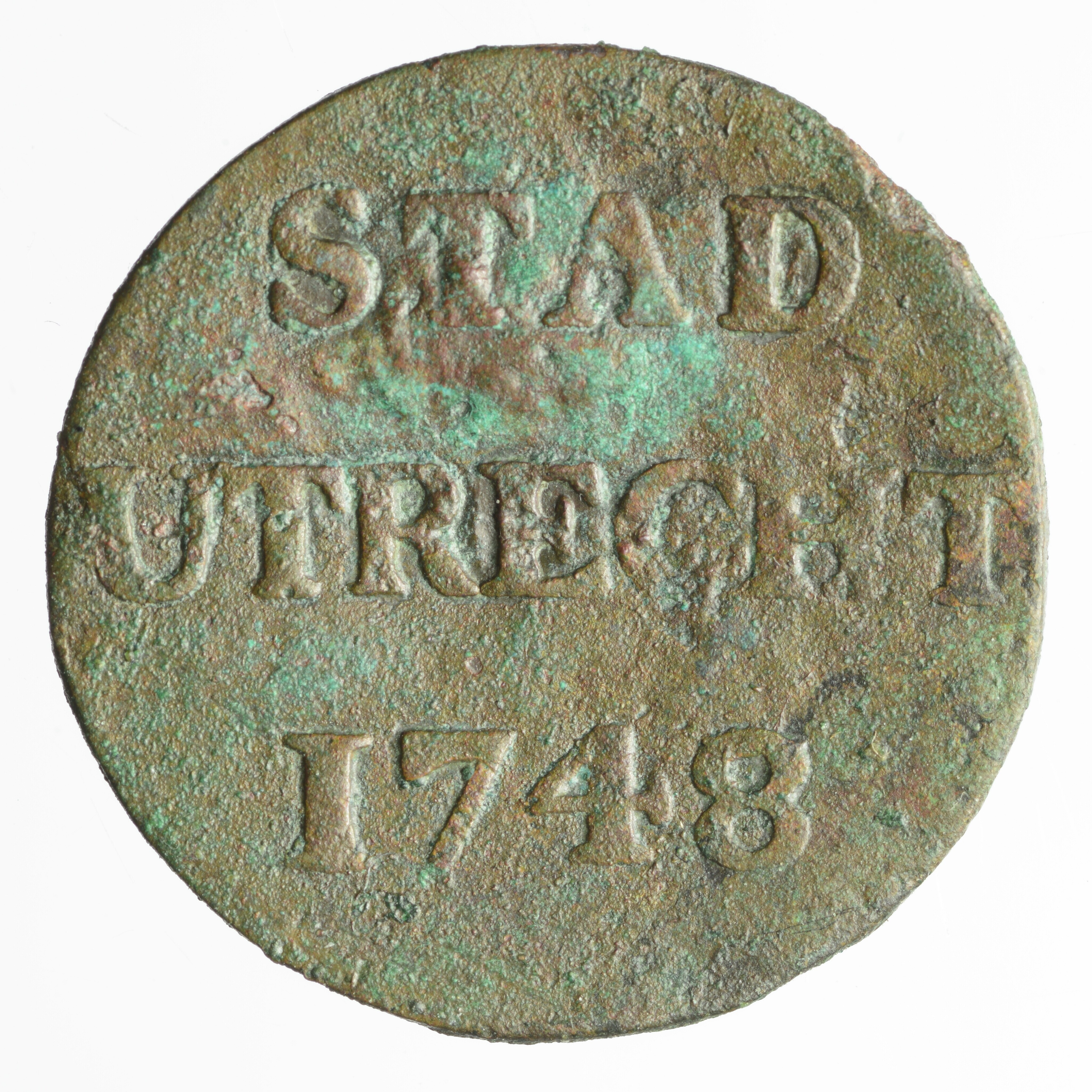 Duit; Stad Utrecht (1581-1795); vz.: in drie regels: STAD / UTRECHT / 1748; kz.: gekroond wapenschild van Utrecht gehouden door twee leeuwen; muntplaats: Utrecht; gewicht: 2.83 gram