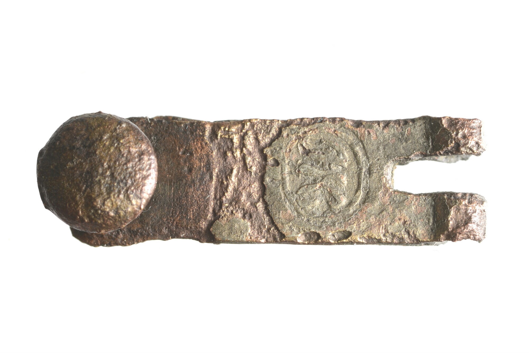 Beslag; onderdeel gesp; klemmetje met nagel, rond embleem met initialen 'A?K'; hoort bij gesp met inv.nr. 5370-19
