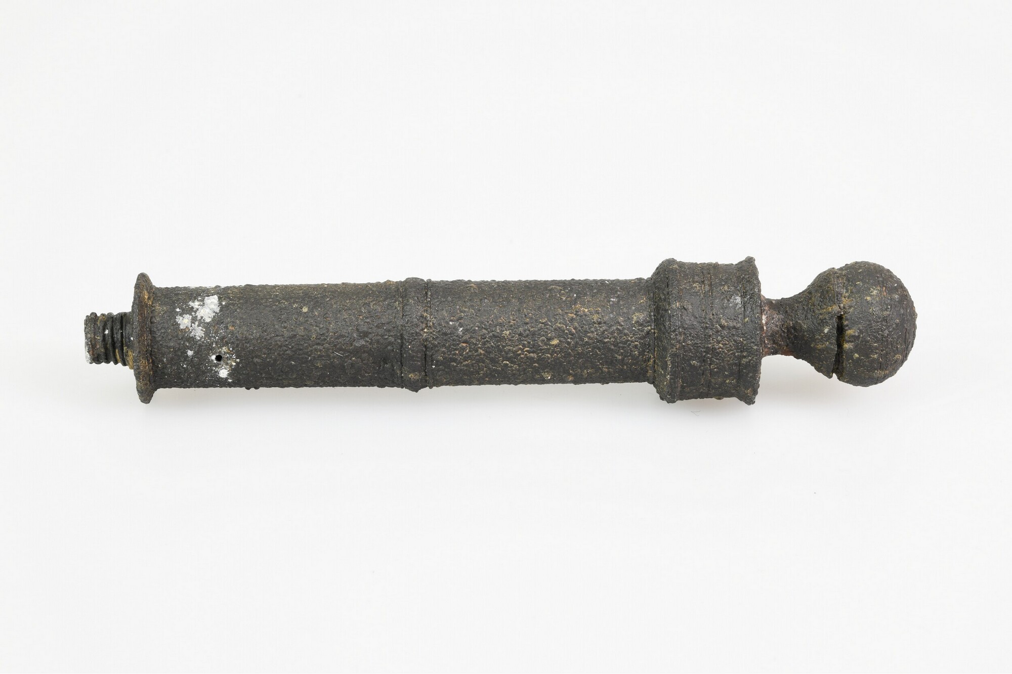 Klisteerspuit; cilindrische tinnen spuit met bolvormig handvat en schroefdraad voor een canule op het uiteinde