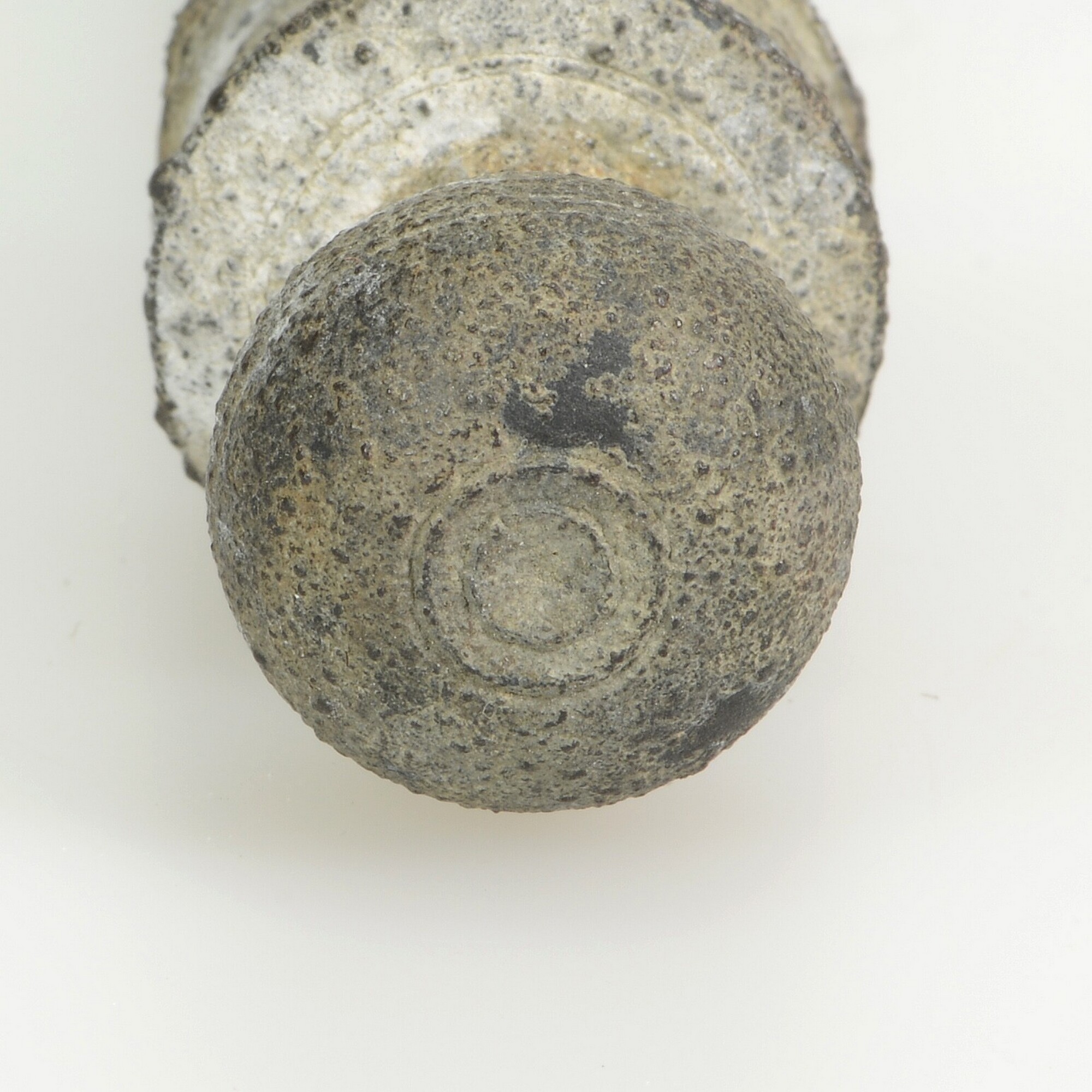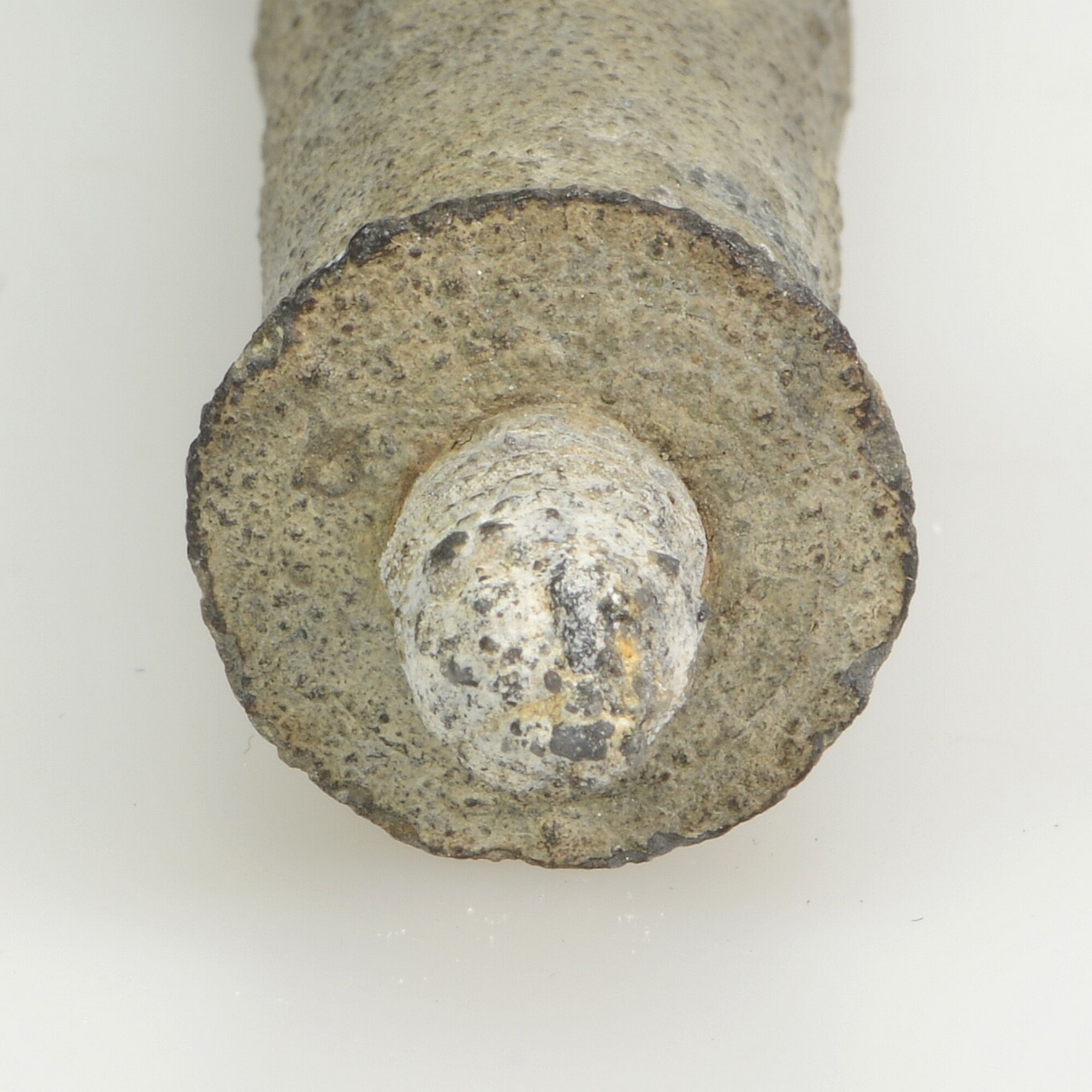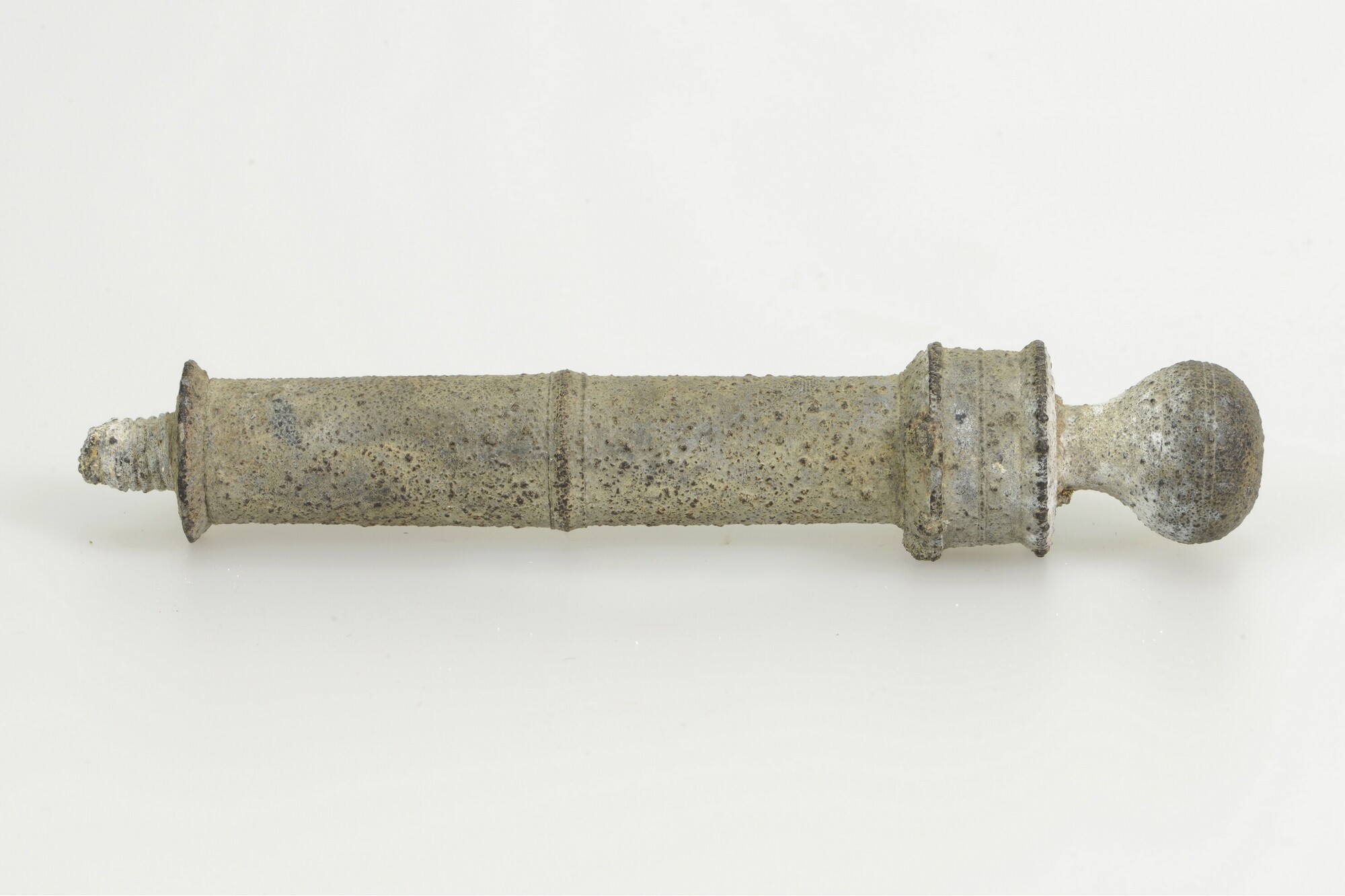 Klisteerspuit; cilindrische tinnen spuit met bolvormig handvat en schroefdraad voor een canule op het uiteinde.