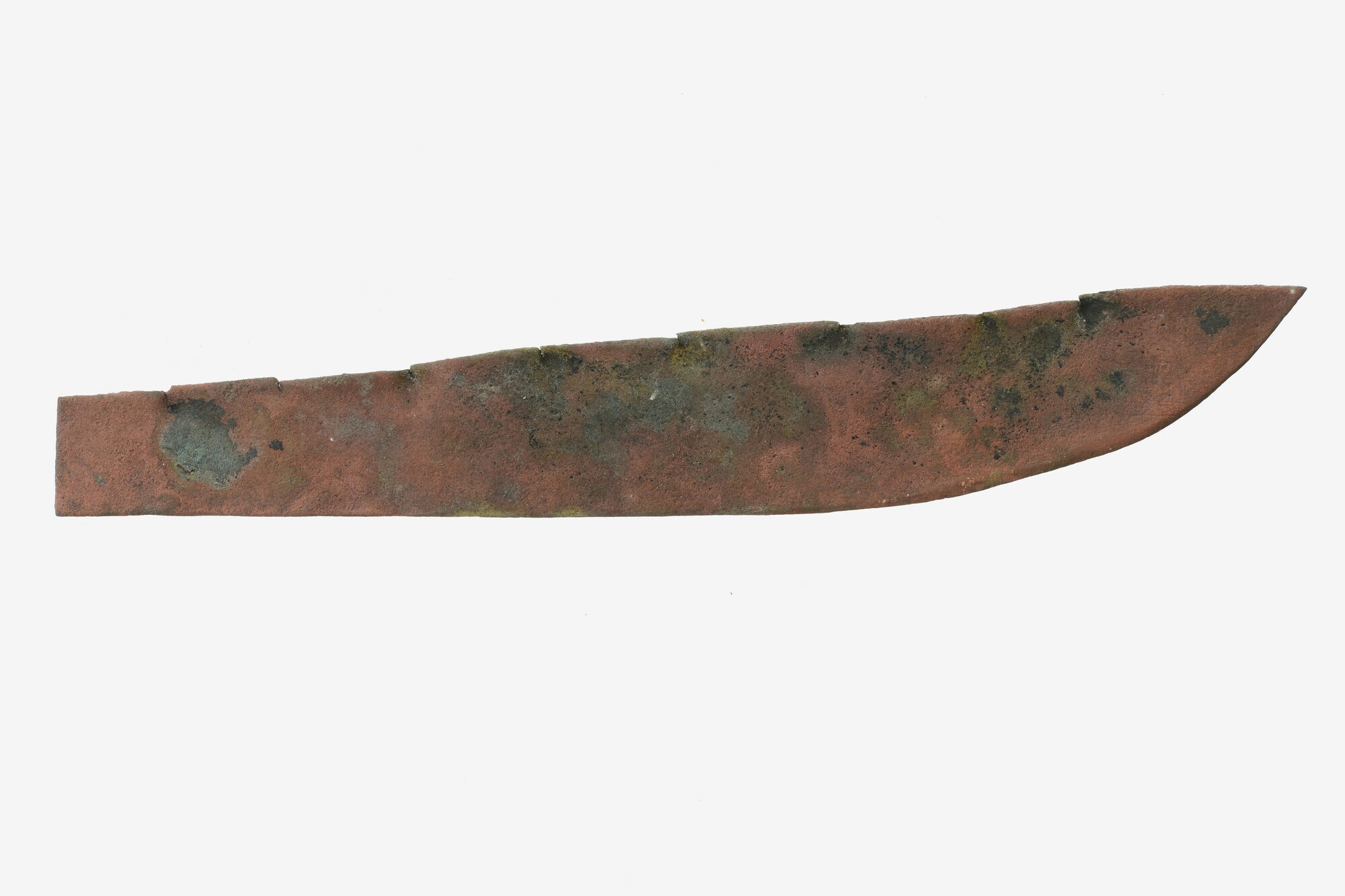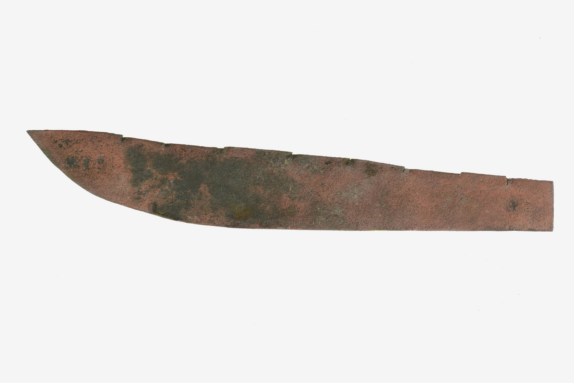 Halfrond uitgesneden fragment van plaat koper? Aan de lange rechte kant zitten 8 inkepingen, ca. 1,5 cm uit elkaar. In het korte rechte uiteinde lijken resten van een nagel te zitten. Snijvlak aan de gebogen kant?