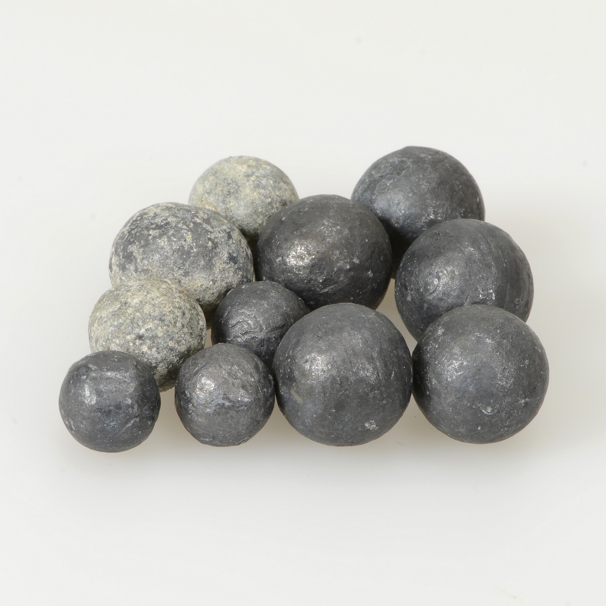 11 musketkogels; drie kleine, twee middelgrote, zes grote exemplaren