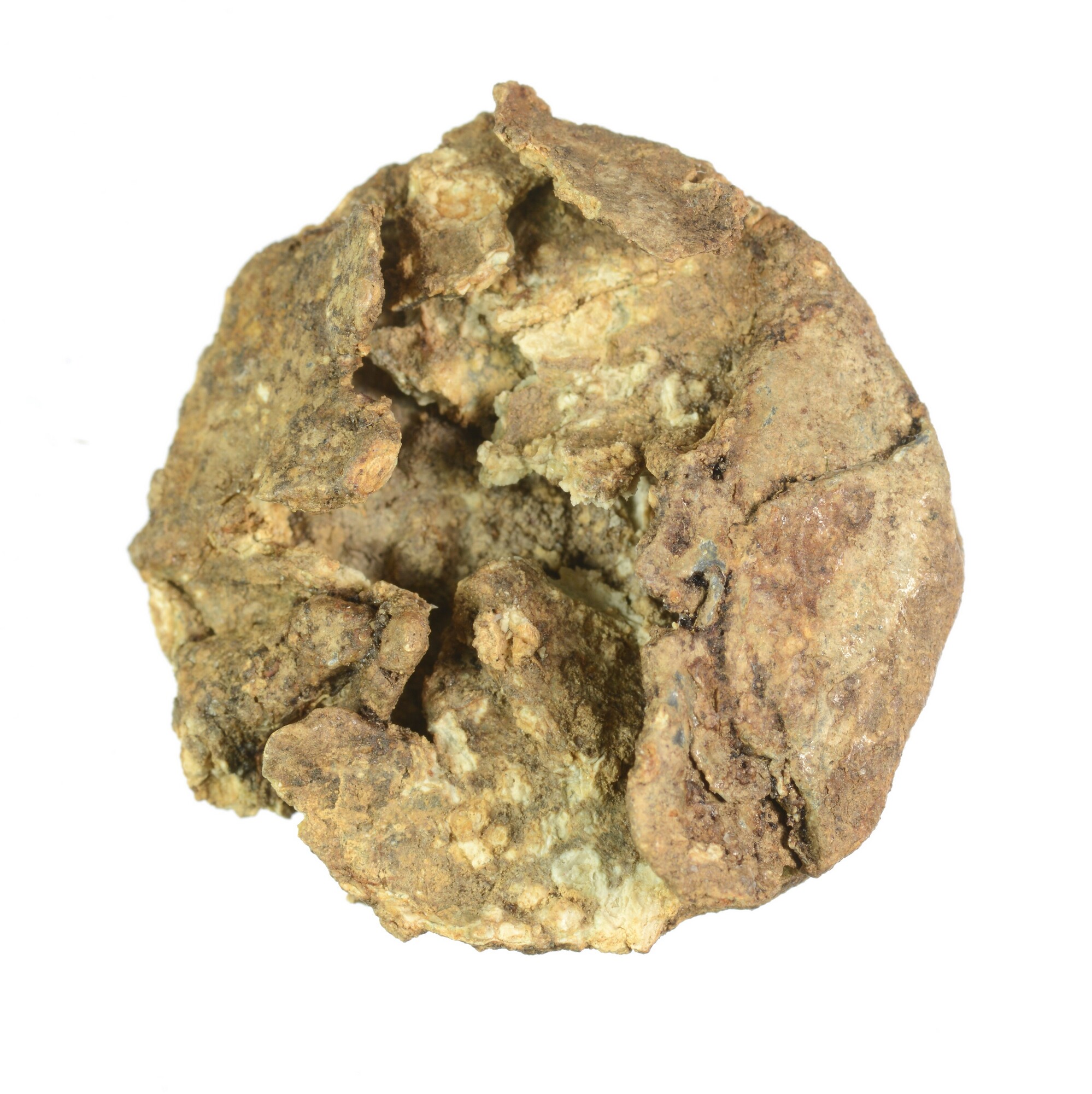 Knoop; omgevouwen (kartel?)rand en twee bevestigingsogen aan de achterzijde