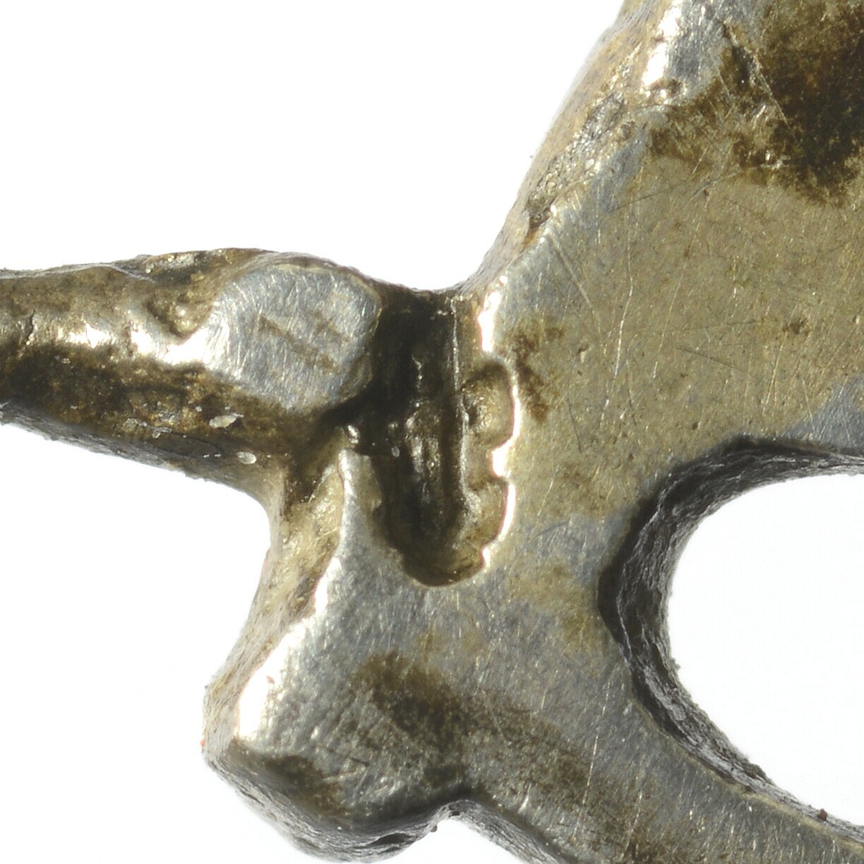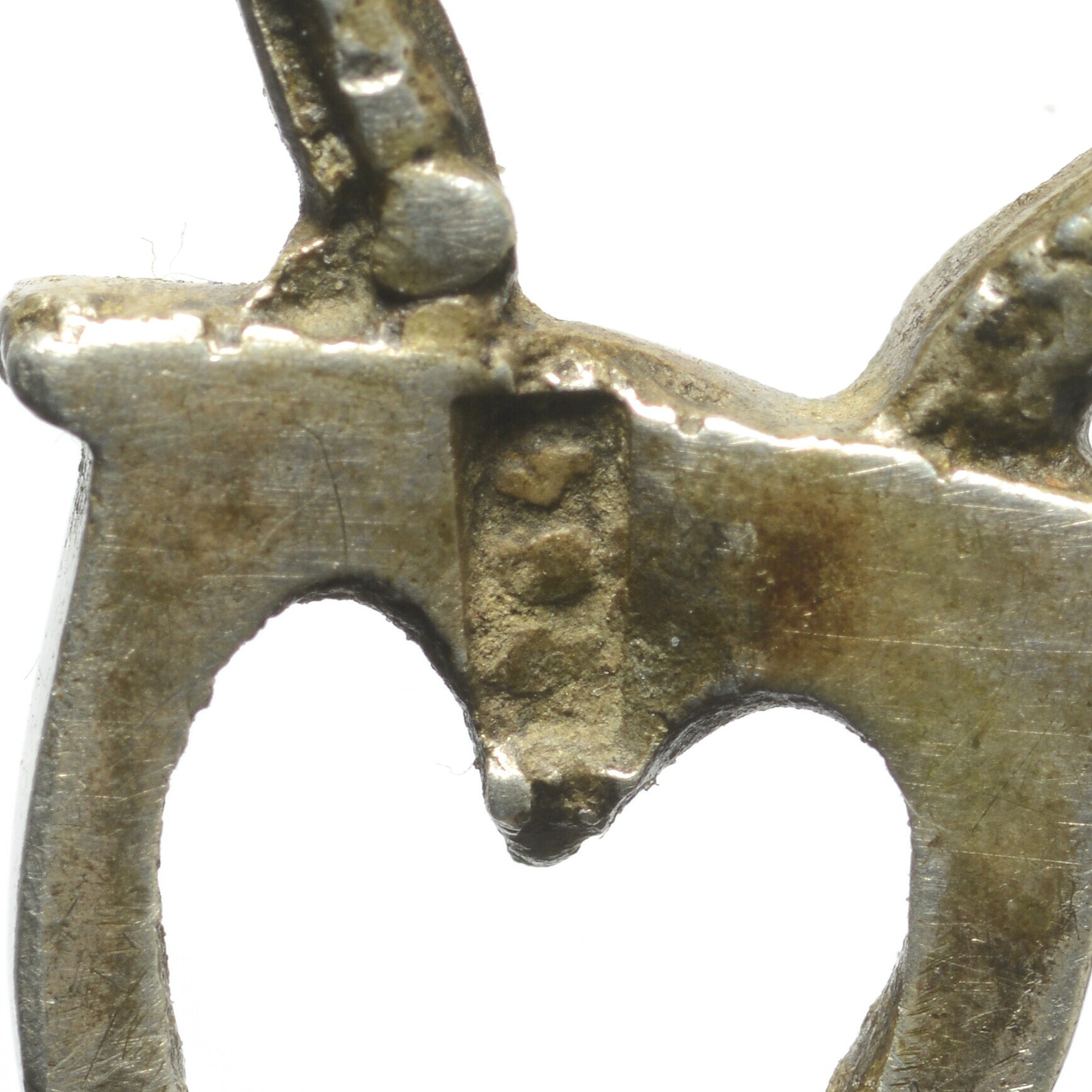 Pijpenwroeter; rechte pen (ontbreekt) met een deels afgebroken langgerekte ovaal waarop een opengezaagd hart. Als handvat een lopend paard op een grondje