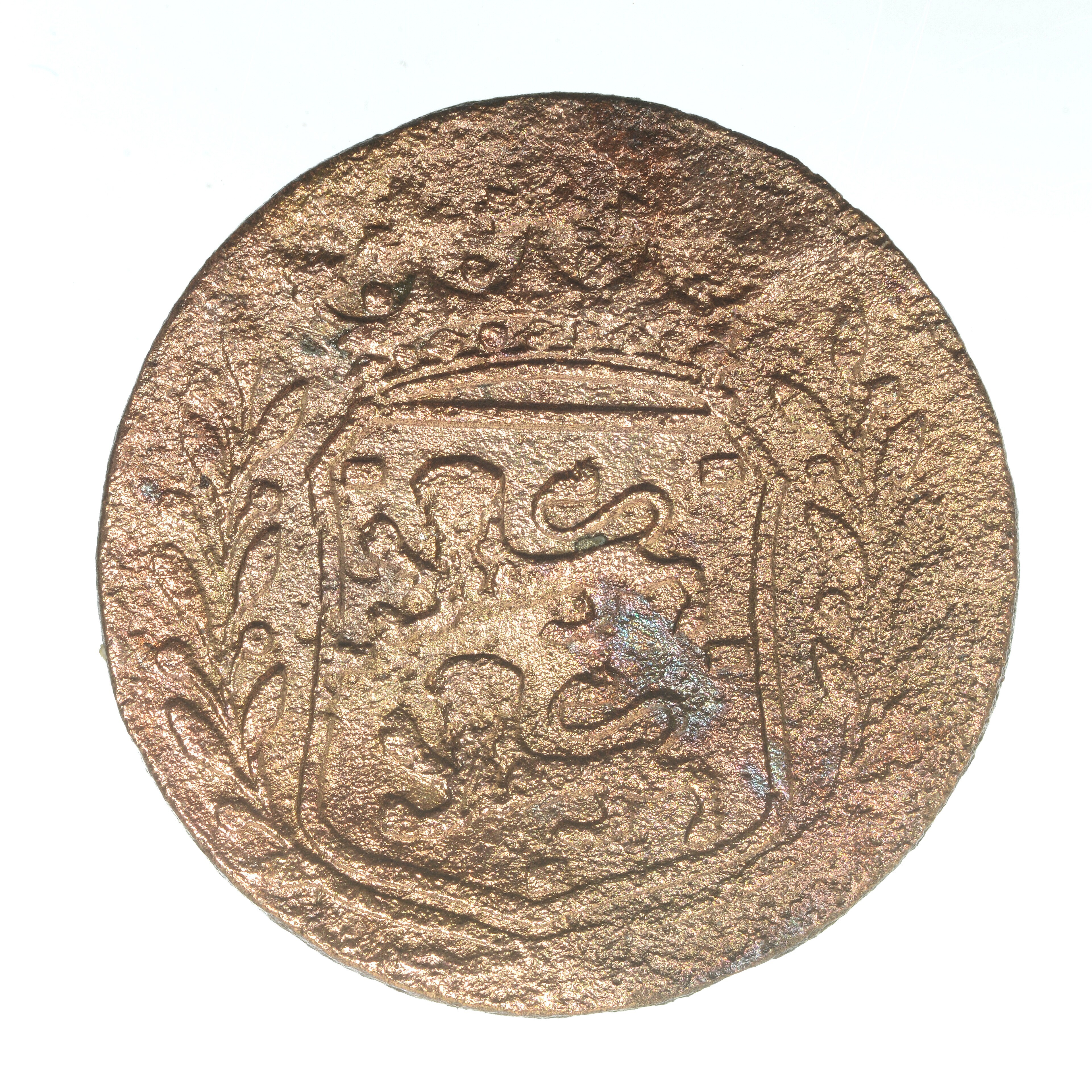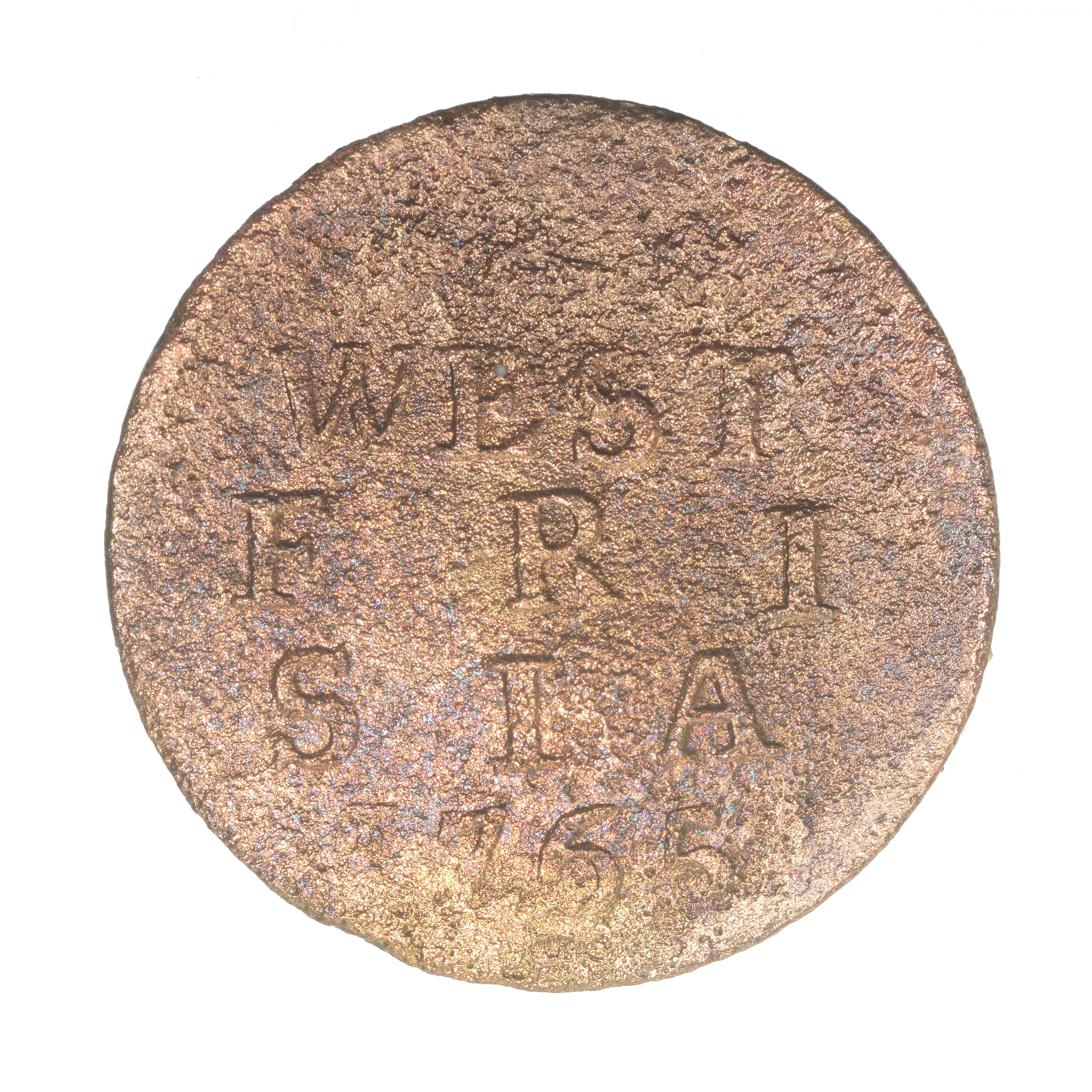 Duit; West-Friesland; vz.: in vijf regels: * haringbuis * / WEST / FRI / SIA / 1765; kz.: gekroond wapenschild met twee gaande leeuwen boven elkaar. De leeuwen hebben hun kop 'en face' gericht en het wapen is versierd met lauwertakken; muntplaats: Enkhuizen; gewicht: 3.02 gram