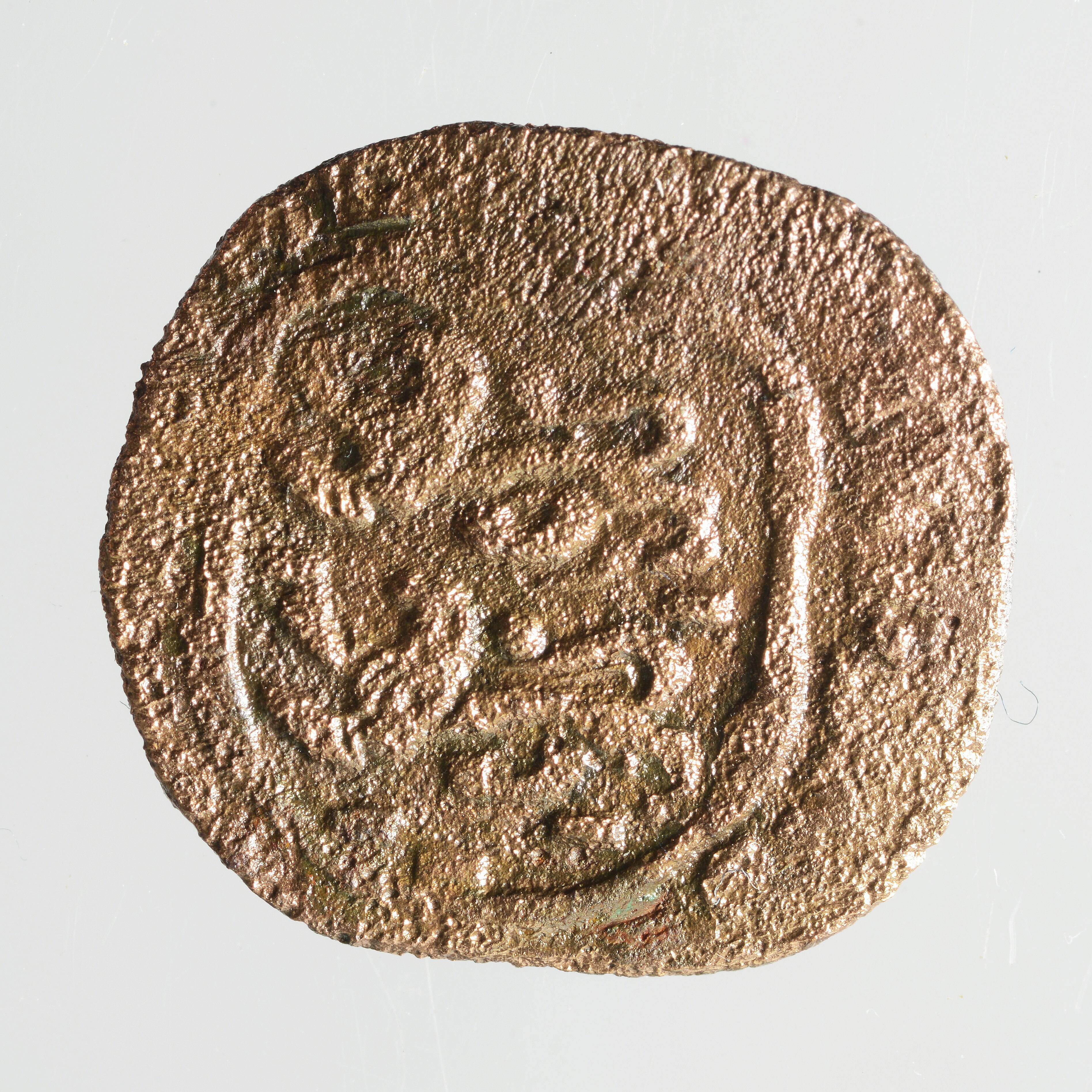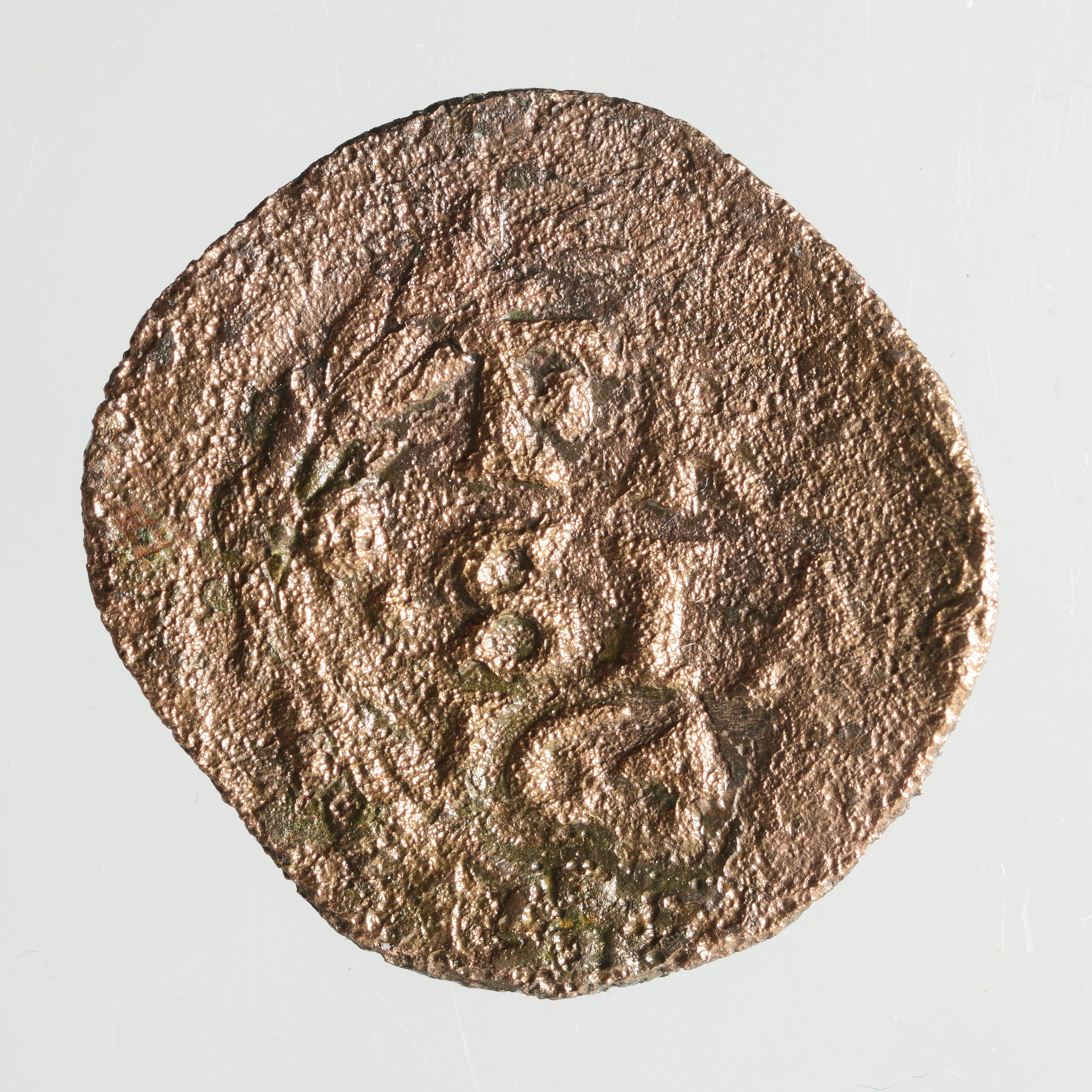Duit; Friesland Provincie (1581-1795); vz.: een tulpkrans met daarin de tekst FRI / SIA en daaronder het jaartal 164[.]; kz.: gekroond wapen van Friesland met twee gaande leeuwen boven elkaar en (niet leesbare) randtekst [.NISI. DNS. NOBISCVM]; gewicht: 1.91 gram