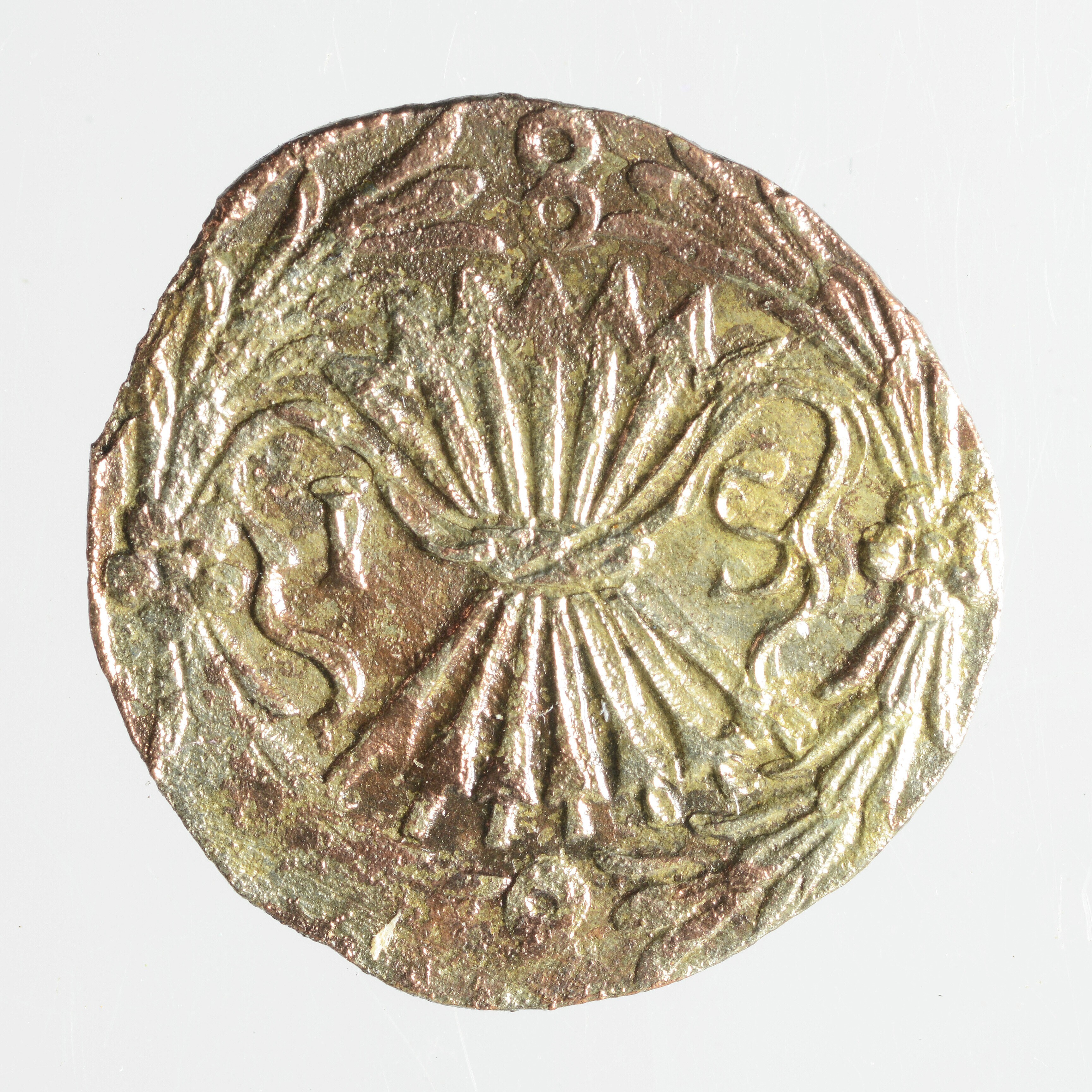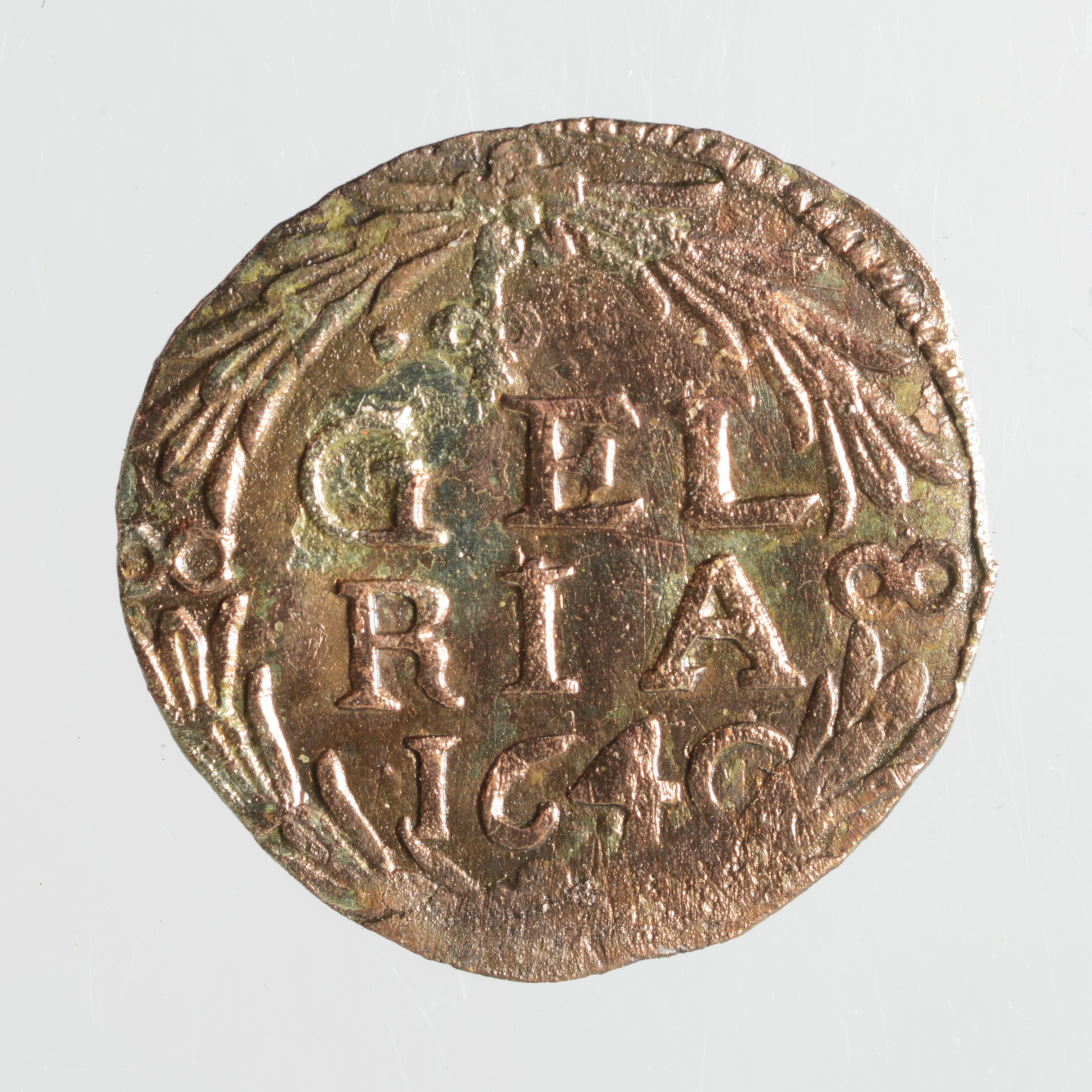 Bezemstuiver; Gelderland Provincie (1581-1795); vz.: binnen een bladerkrans in vier regels: • (lelie) • / GEL / RIA / 1640; kz.: bundel van zeven pijlen met ter weerszijden 1 – S binnen een bladerkrans; muntplaats: Harderwijk; gewicht: 1.02 gram