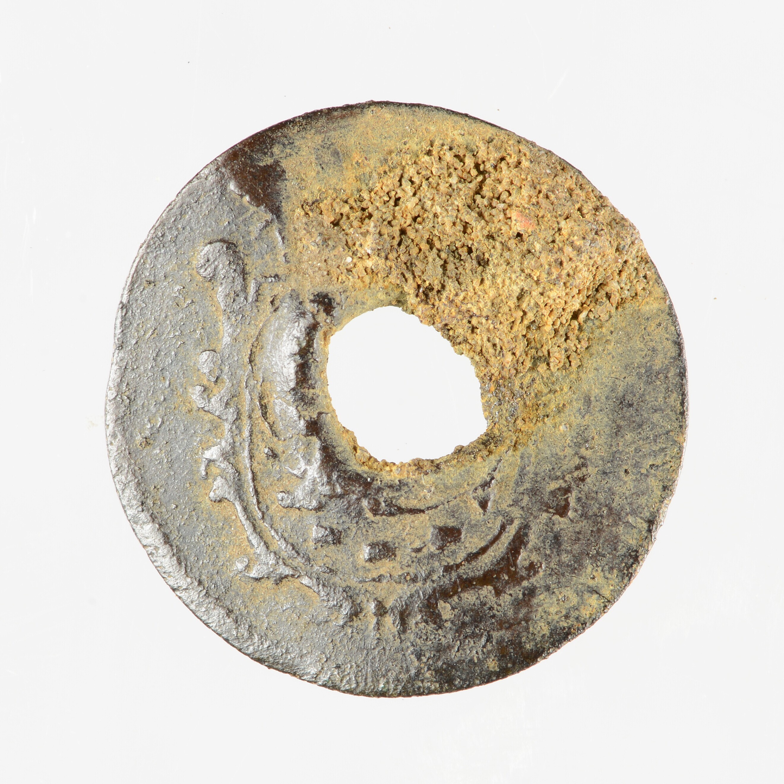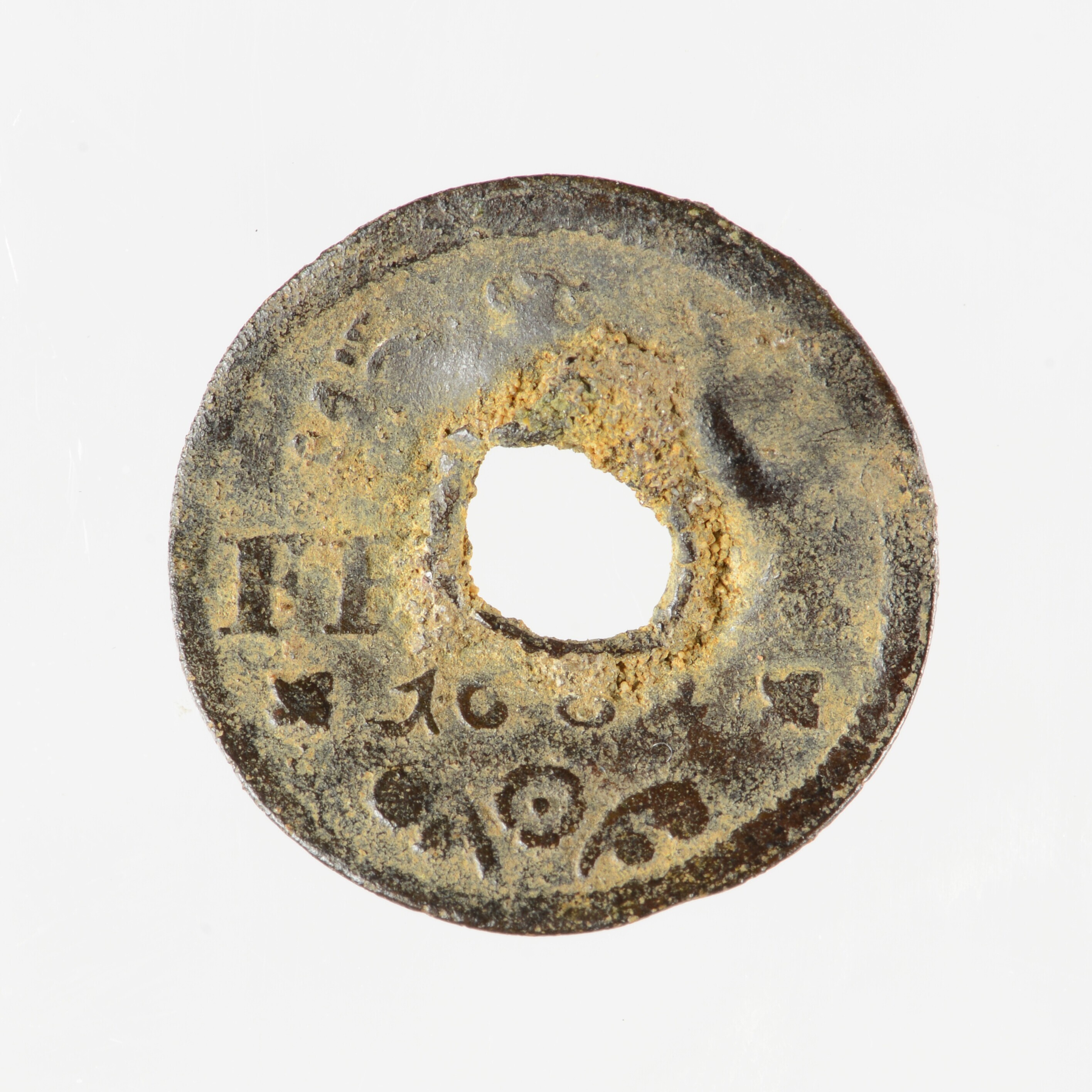 Duit; Friesland Provincie (1581-1795); vz.: in vier regels: muntteken klimmende leeuw tussen twee bladornamenten / FR[ISIA] / 1682 / een rozet tussen twee bladornamenten; kz.: met open kroon gekroond en versierd wapenschild van Friesland; muntplaats: Leeuwarden; gat in het midden; gewicht: 1.45 gram; vondstomstandigheden: losse vondst, 28-05-1987
