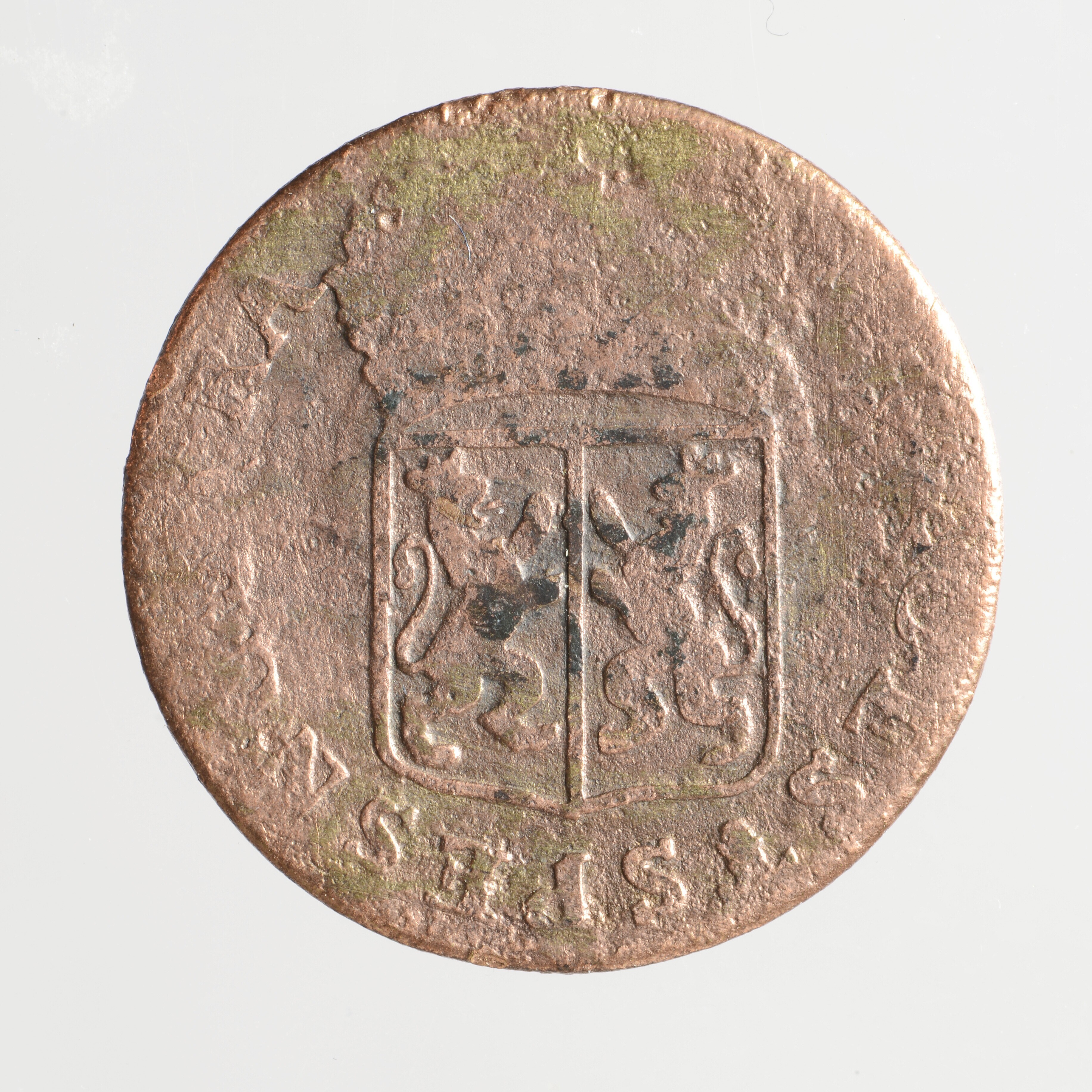 Duit; Gelderland Provincie (1581-1795); vz.: rococo-omlijsting met daarin •D• / GEL / RIAE / 1765 / (geknotte boom met loot) in vijf regels; kz.: gekroond wapen van Gelderland met omschrift [IN DEO] EST SPES [NOS]TRA; muntplaats: Harderwijk; gewicht: 2.96 gram