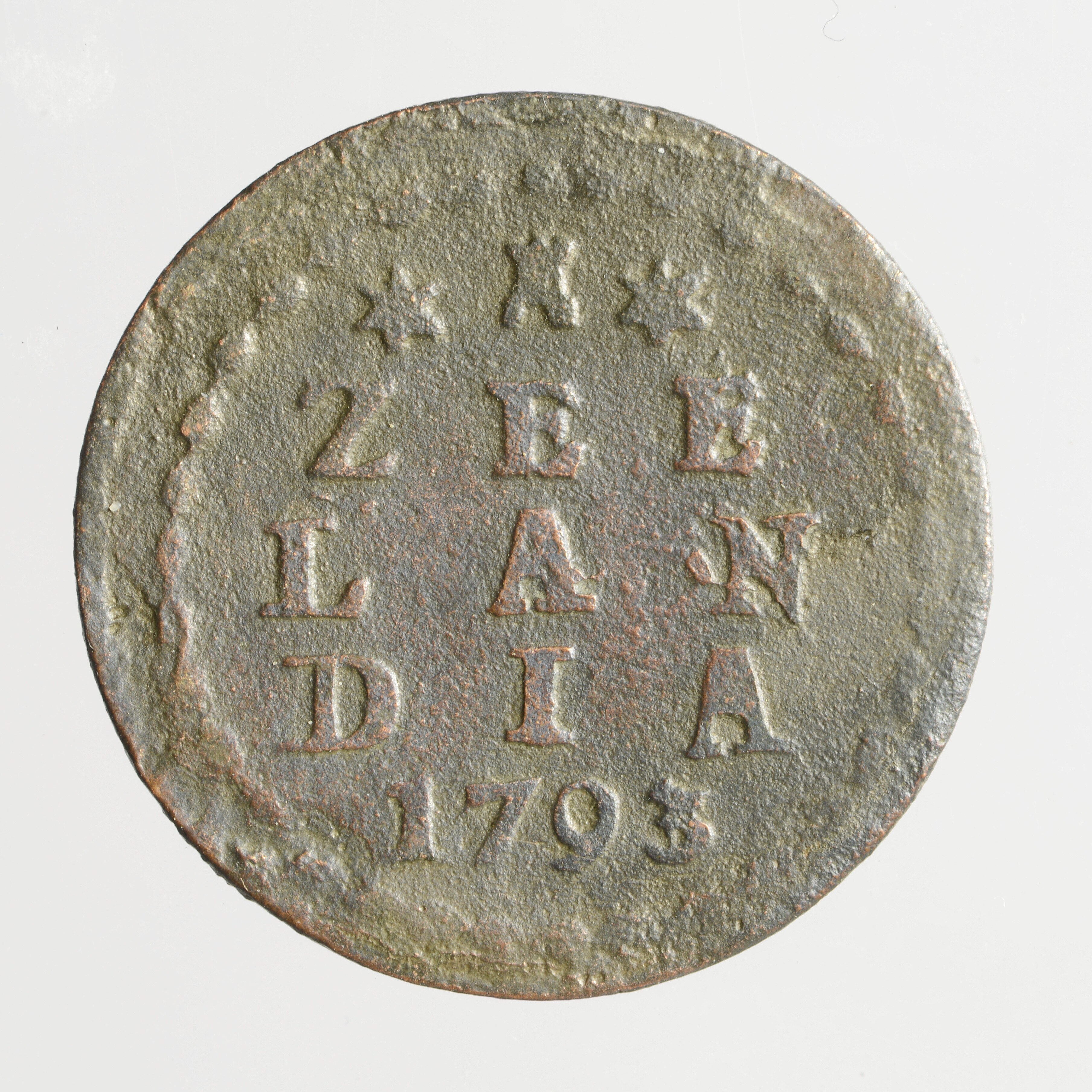 Duit; Zeeland Provincie (1581-1795); vz.: een cirkel van streepjes met daarin (burcht) / ZEE / LAN / DIA / 1793 in vijf regels; kz.: gekroond wapen van Zeeland met omschrift LUCTOR ET EMERGO; muntplaats: Middelburg; gewicht: 2.64 gram
