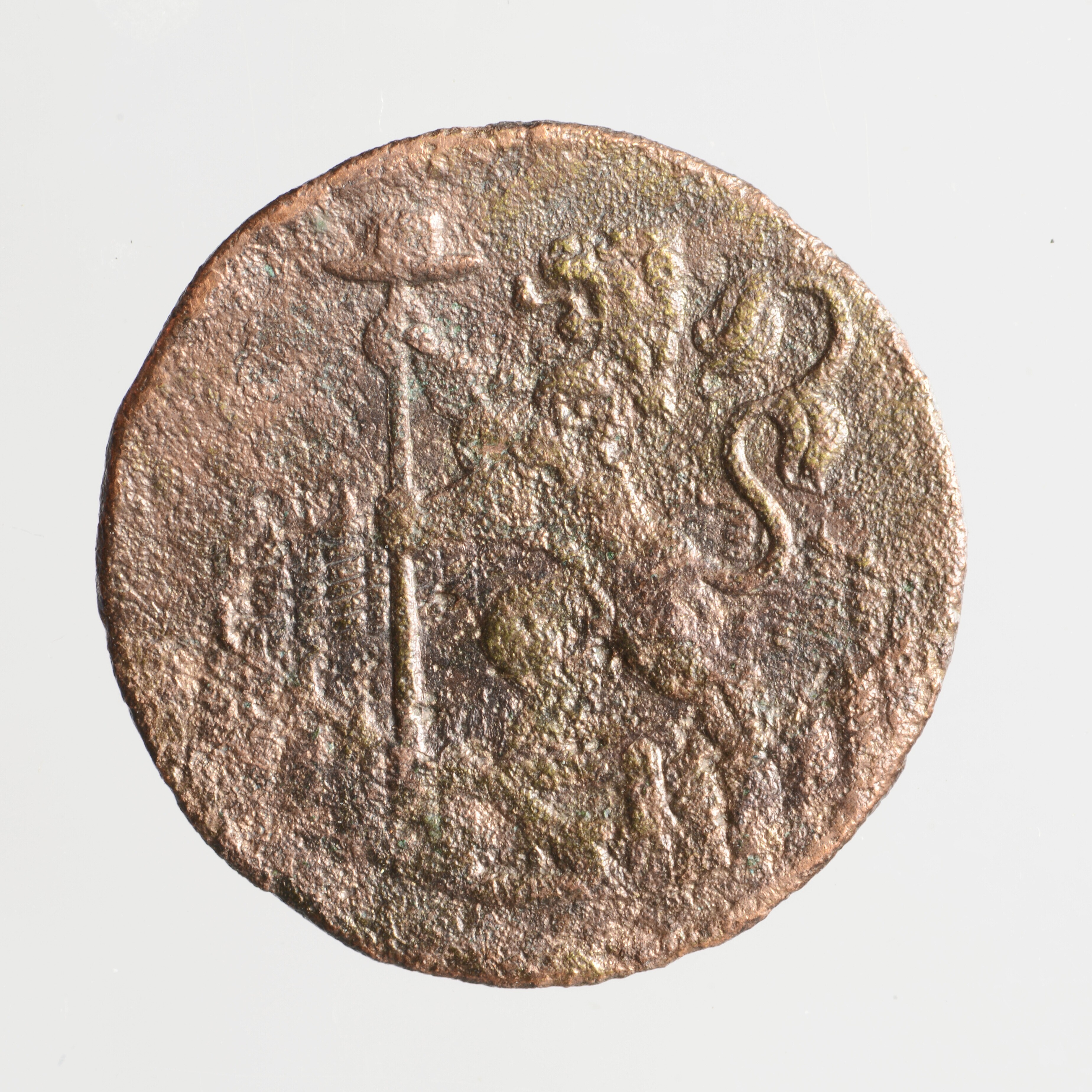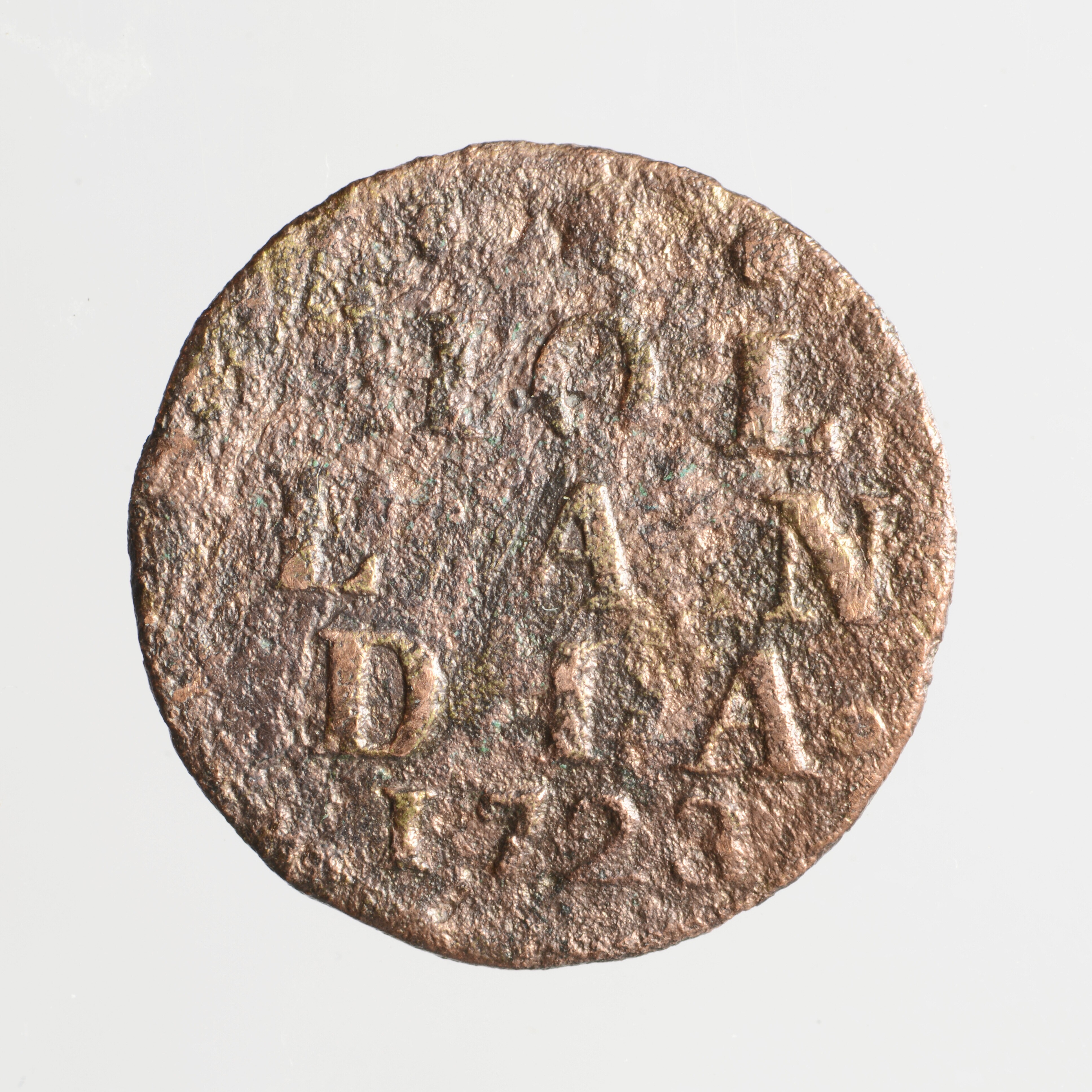 Duit; Holland Provincie (1581-1795); vz.: (rozet) / HOL / LAN / DIA / 1723 in vijf regels; kz.: leeuw naar links met vrijheidshoed op speer in een gesloten Hollandse tuin; muntplaats: Dordrecht; gewicht: 2.49 gram
