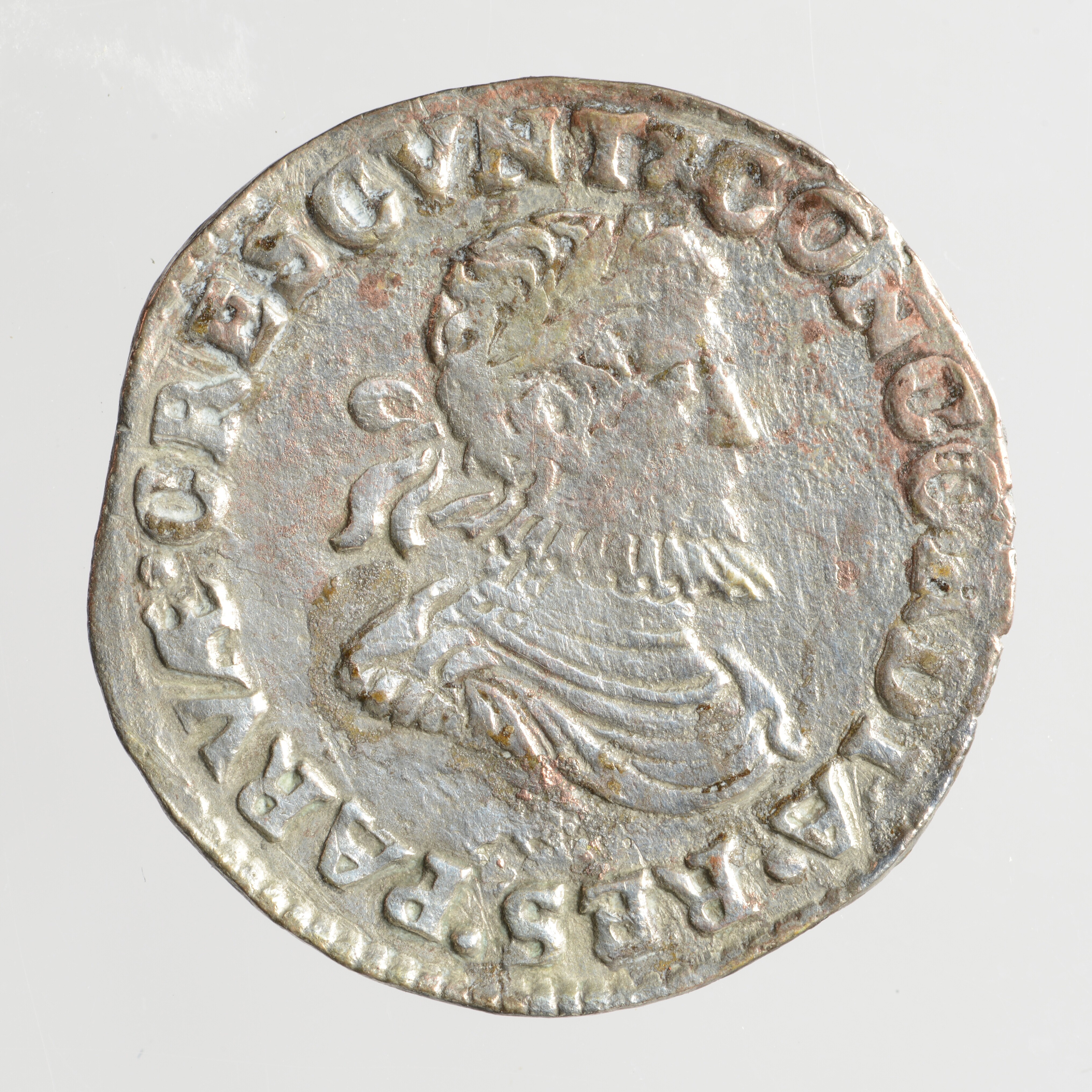 Twintigste Reaal; Overijssel Provincie (1581-1795); vz.: borstbeeld van landvoogd Leicester met lauwerkrans naar rechts met omschrift CONCORDIA • RES • PARVAE • CRESCVNT; kz.: pijlbundel binnen een versiering met omschrift MONE BELGI ORD TRANSISV[L] 1595; muntplaats: Kampen; gewicht: 2.99 gram