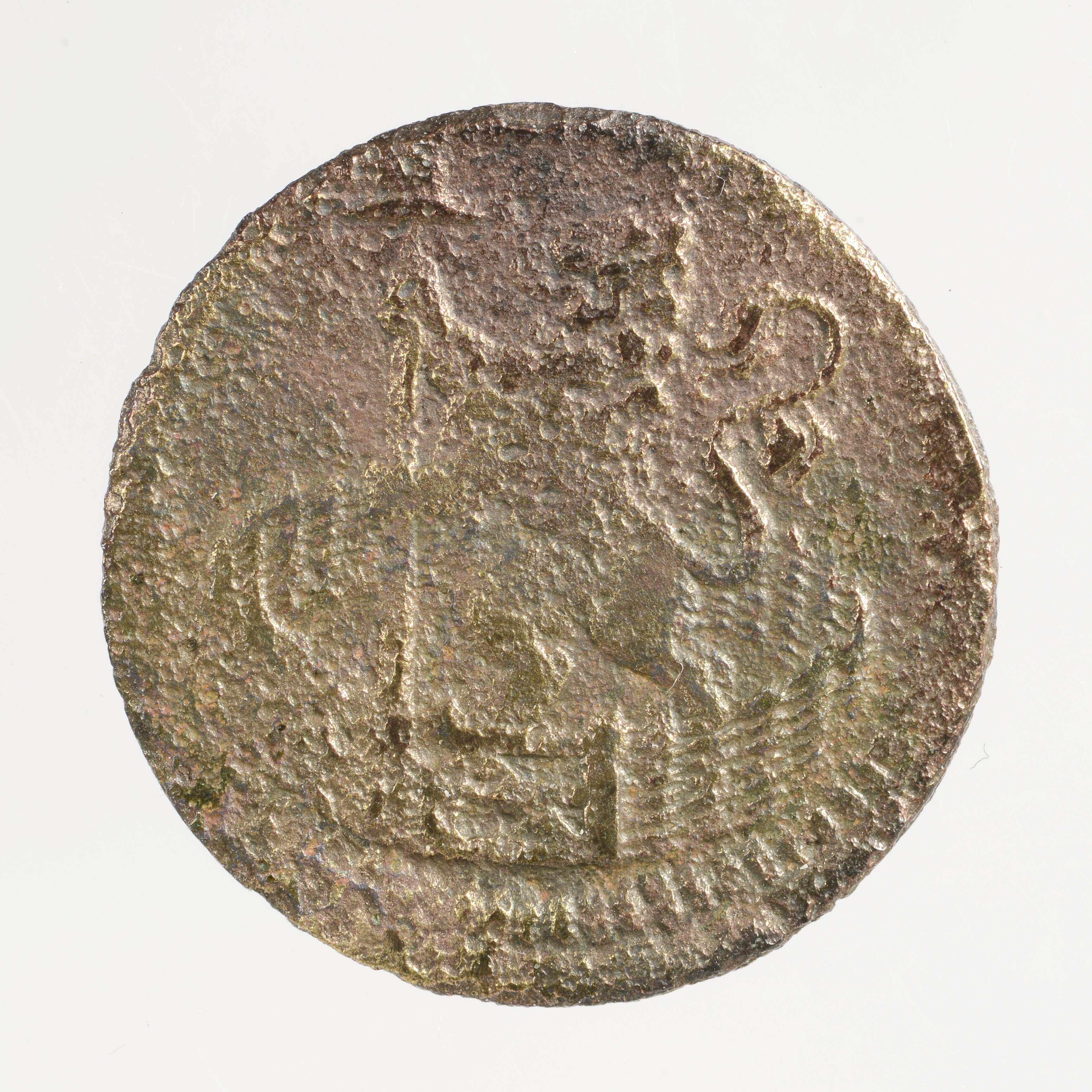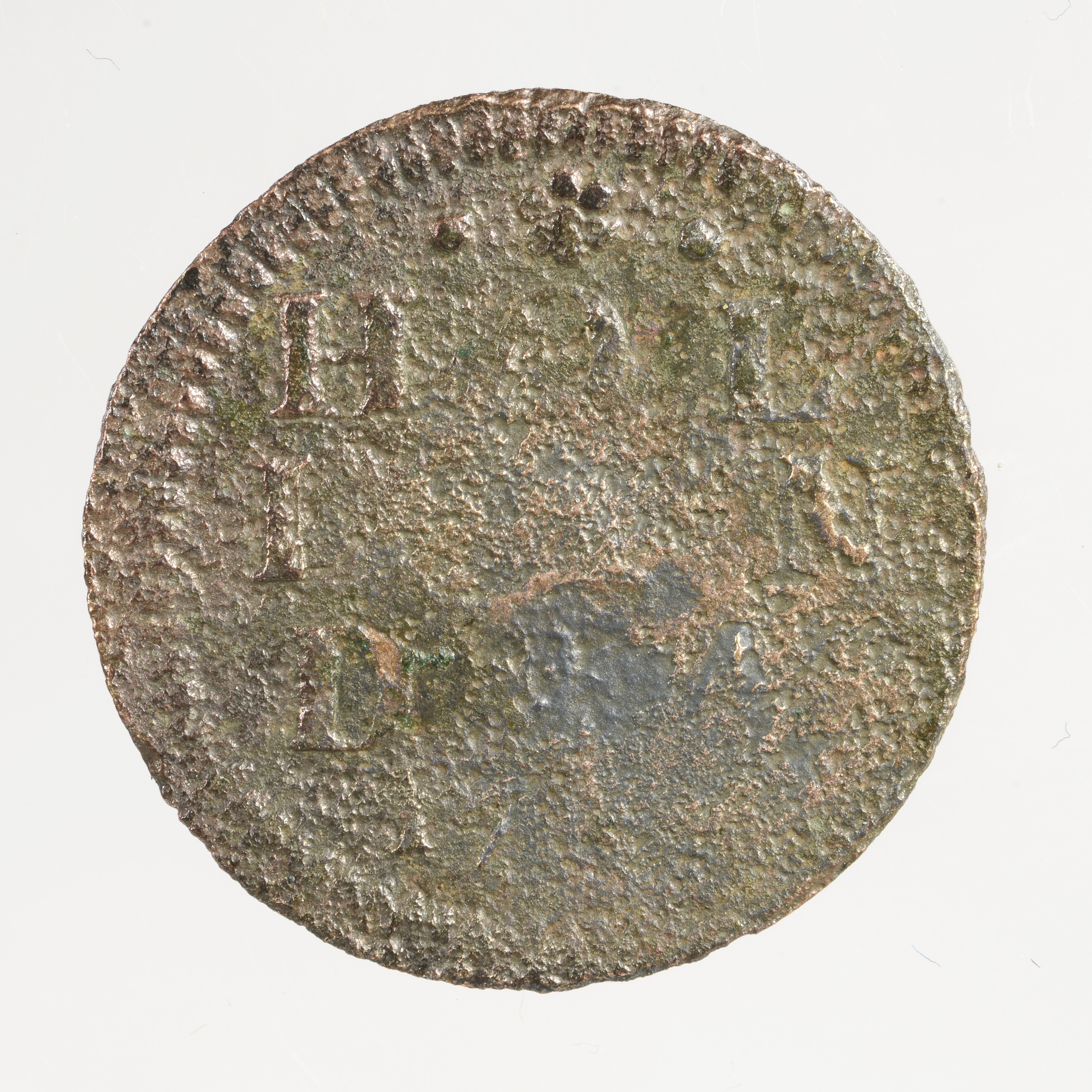 Duit; Holland Provincie (1581-1795); vz.: in vijf regels: •(rozet)• / H[O]L / L[A]N / D[IA]• / [....]; kz.:klimmende leeuw naar links met vrijheidshoed en een lans binnen de Hollandse tuin; muntplaats: Dordrecht; gewicht: 3.02 gram