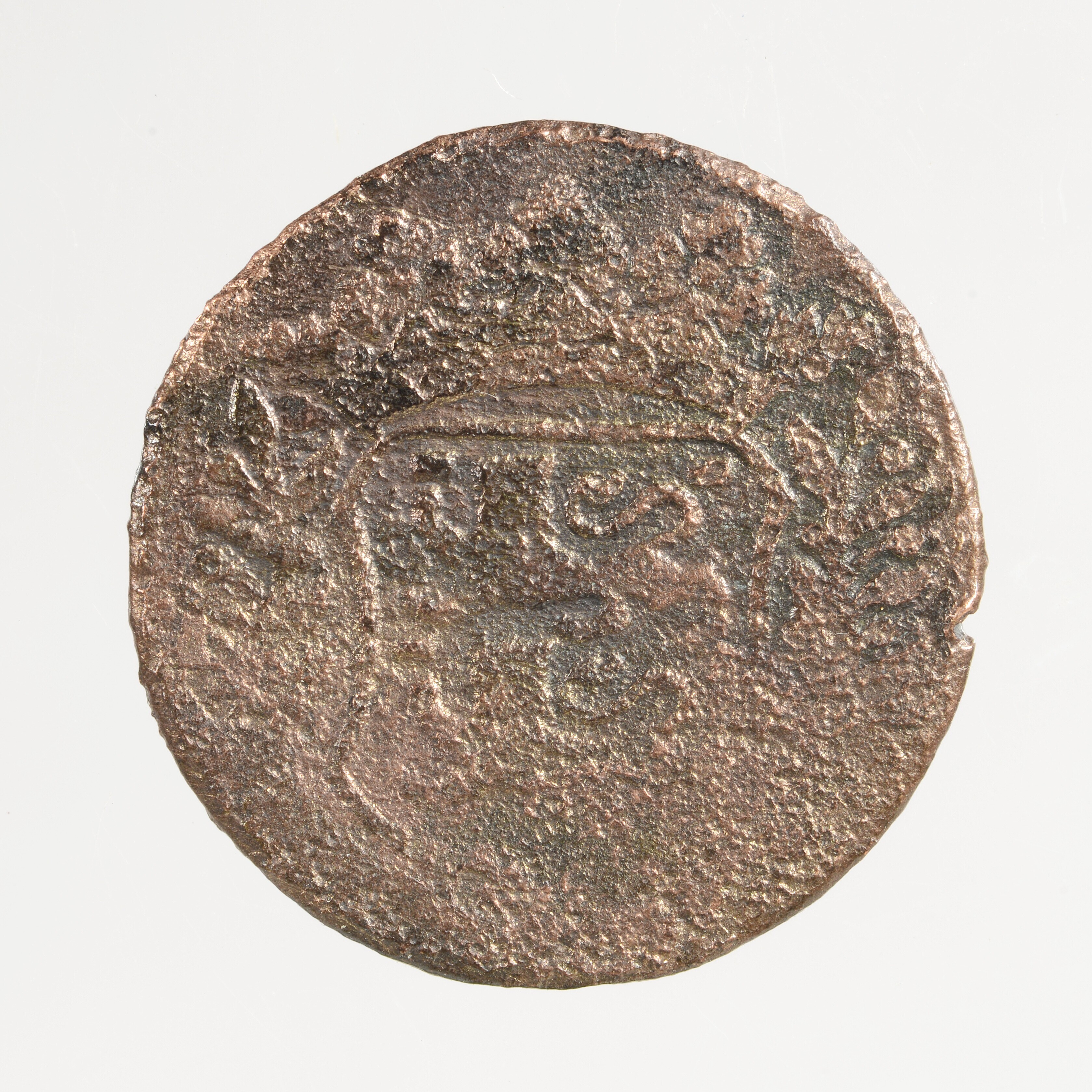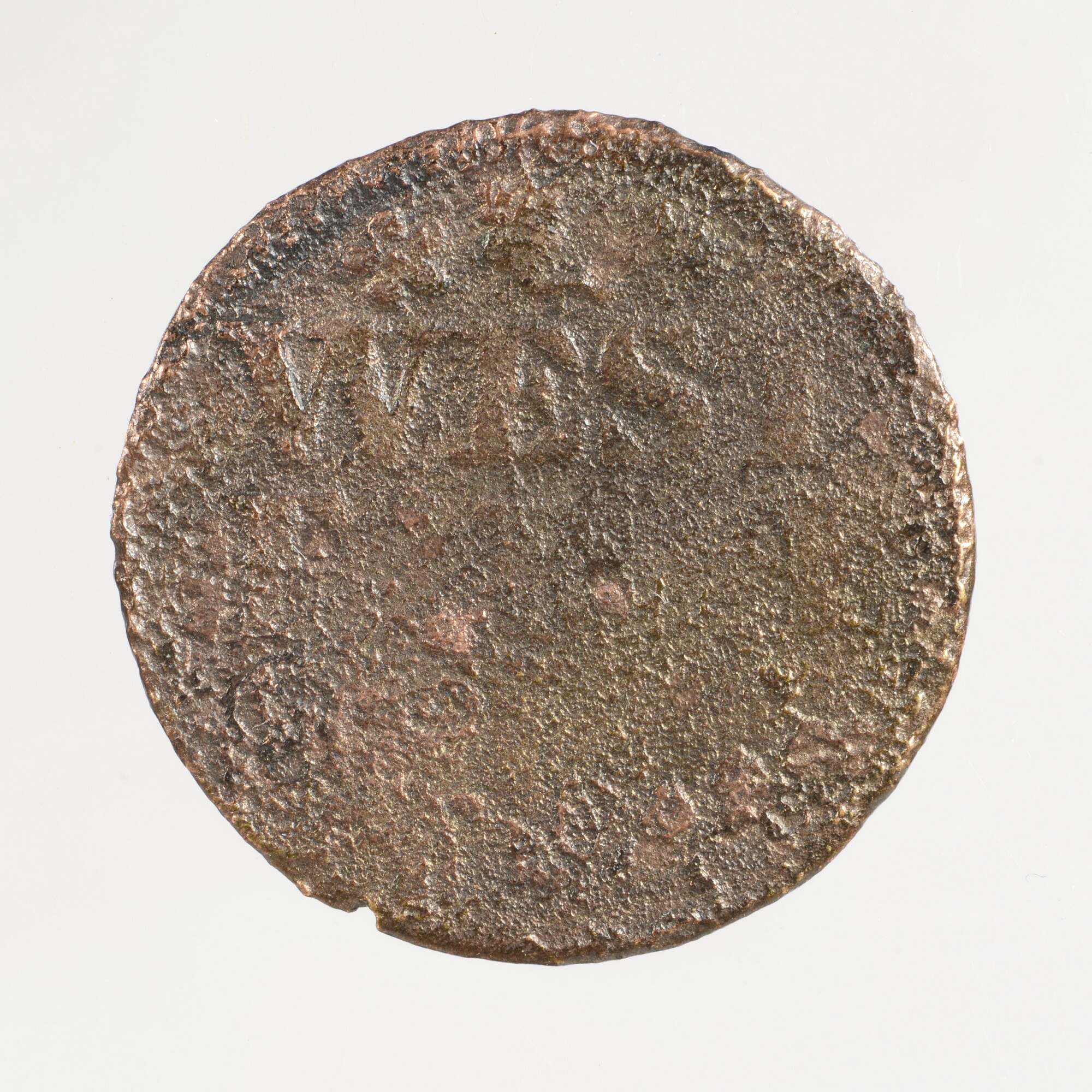 Duit; West-Friesland; vz.: in vijf regels: (knolraap) / WEST / FRI / [SIAE] / (onleesbaar jaartal); kz.: gekroond wapenschild van West-Friesland met boven elkaar twee gaande leeuwen en face, aan beide zijden versierd met lauwertakken; gewicht: 2.21 gram
