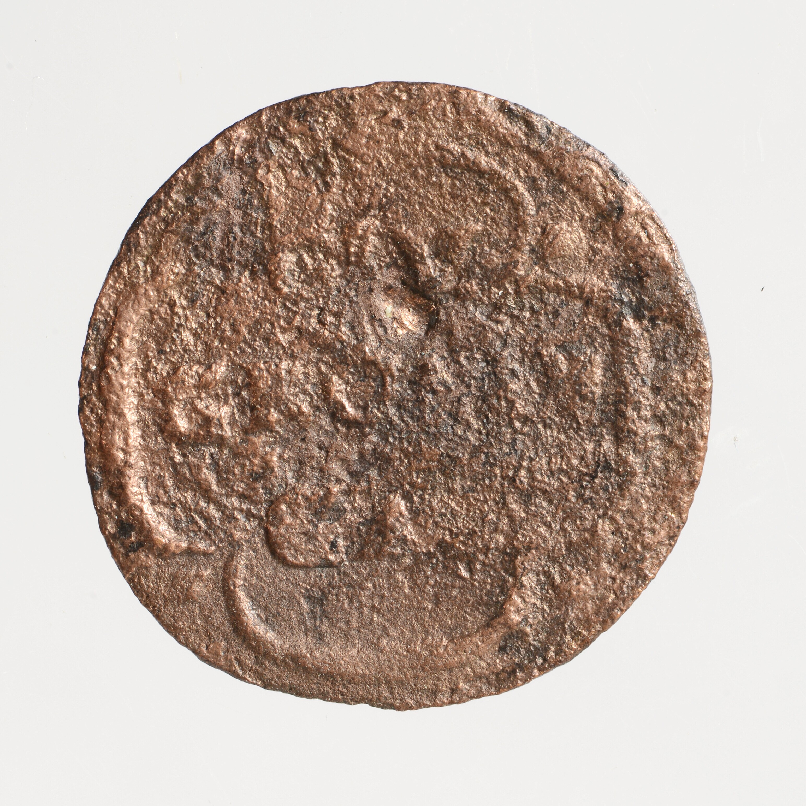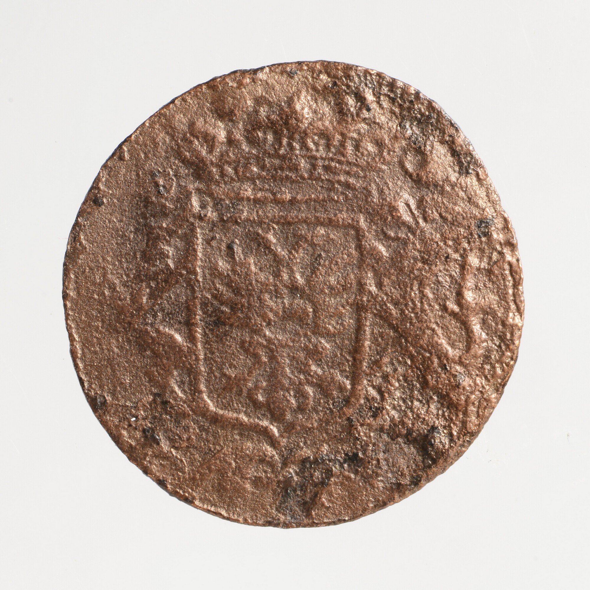 Duit; Groningen stad; vz.: een vierpas met daarin in drie regels CIV. / GRONIN / GA; kz.: gekroond een door twee leeuwen vastgehouden wapenschild met de Duitse rijksadelaar die het stadswapen van Groningen op de borst heeft, onder het wapen een versiering, boven de kroon het jaartal (niet leesbaar); muntmeester: Egbertus Marinus; muntplaats: Groningen; gewicht: ...