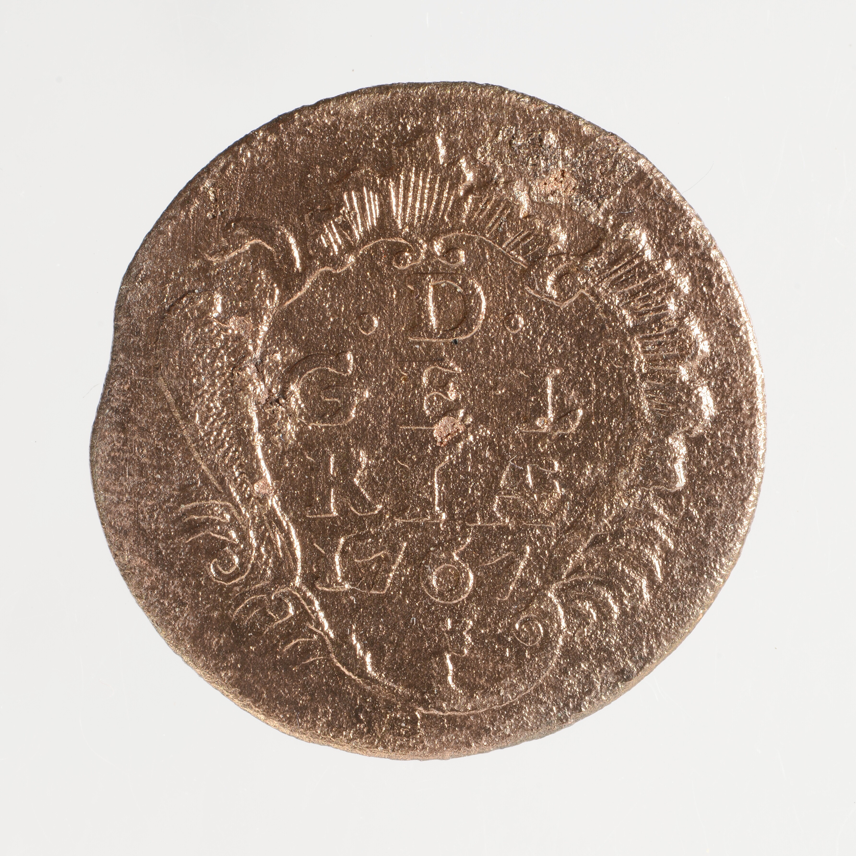 Duit; Gelderland Provincie (1581-1795); vz.: in vijf regels: •D• / GEL / RIAE / 1767 / (geknotte boom met loot) in rococo-versiering; kz.: gekroond wapenschild van Gelderland, met omschrift IN DEO EST SPES NOSTRA; muntplaats: Harderwijk; gewicht: 2.55 gram