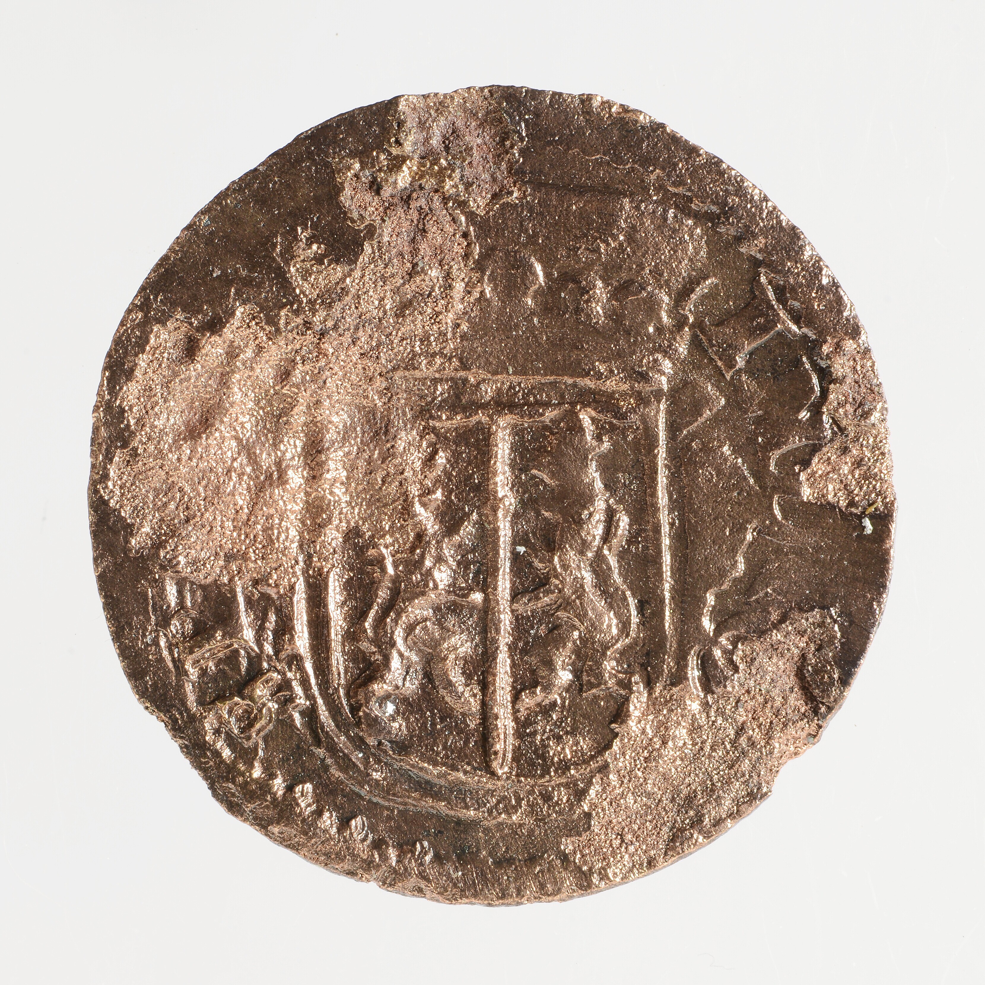 Duit; Gelderland Provincie (1581-1795); vz.: binnen een bladerkrans in vier regels: •D• / GEL / RIAE / 1690; kz.: gekroond wapenschild van Gelderland met omschrift IN•DEO• •SP•NOS•; muntplaats: Harderwijk; gewicht: 2.41 gram