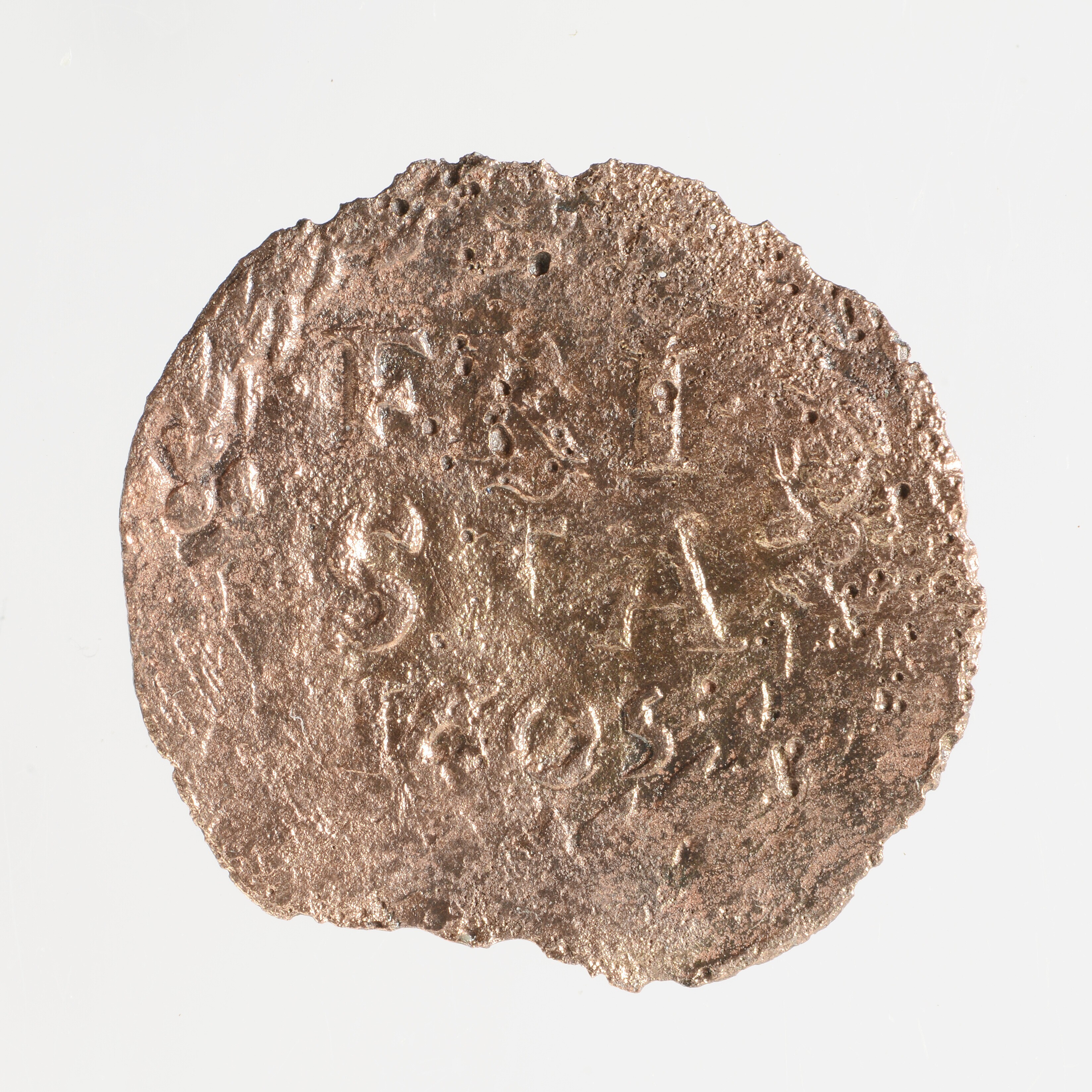 Duit; Friesland Provincie (1581-1795); vz.: Tulpkrans met daarin in drie regels FRI / SIA / 1605; kz.: Gekroond wapen van Friesland met twee gaande leeuwen boven elkaar, omschrift: NISI • [DNS • NOBISCV •];muntplaats: Leeuwarden; gewicht: 0.77 gram