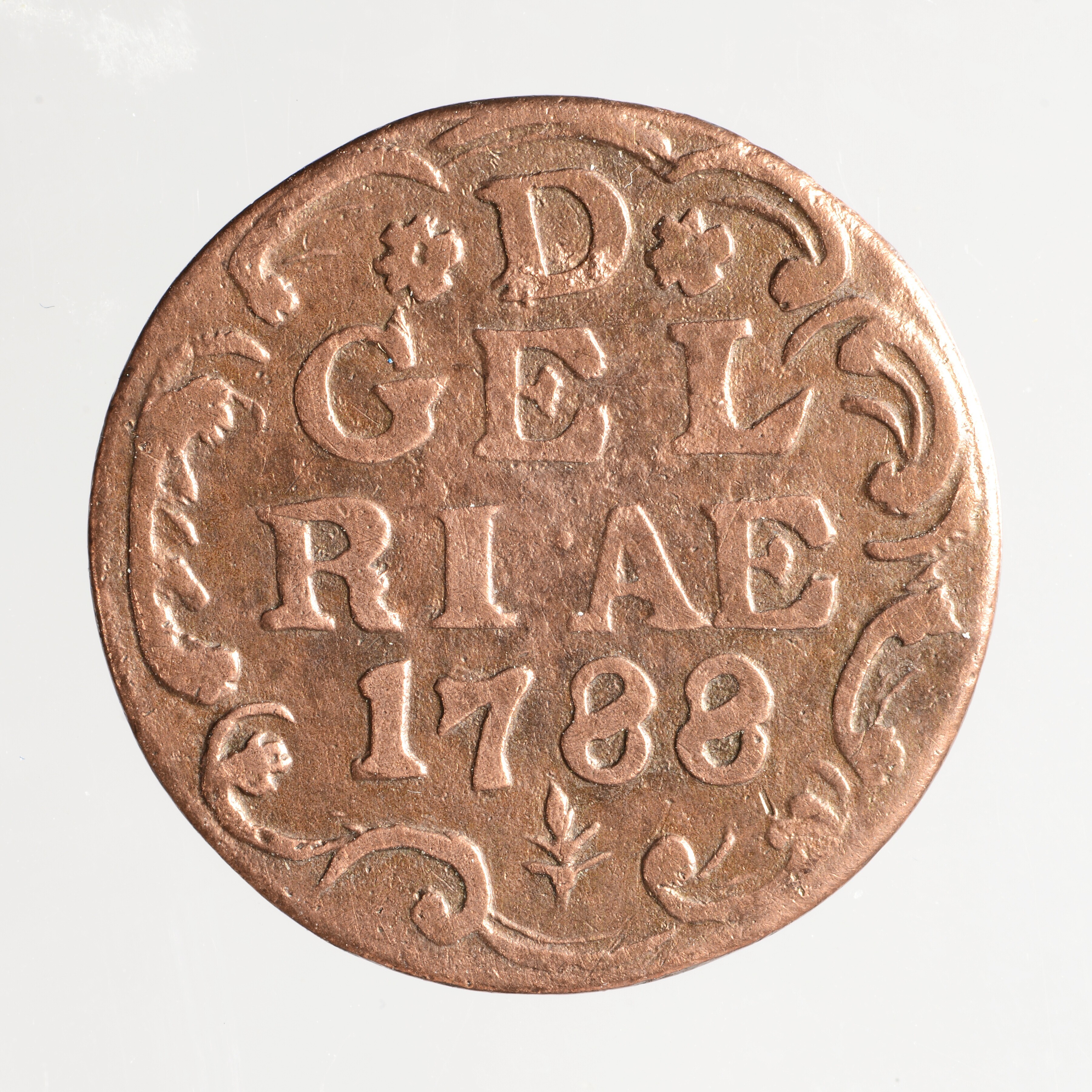 Duit; Gelderland Provincie (1581-1795); vz.: in vijf regels: (rozet) D (rozet) / GEL / RIAE / 1788 / (korenaar); kz.: gekroond wapenschild van Gelderland, met omschrift IN•DEO•EST•SPES•[NOSTRA]; muntplaats: Harderwijk; gewicht: 2.85 gram