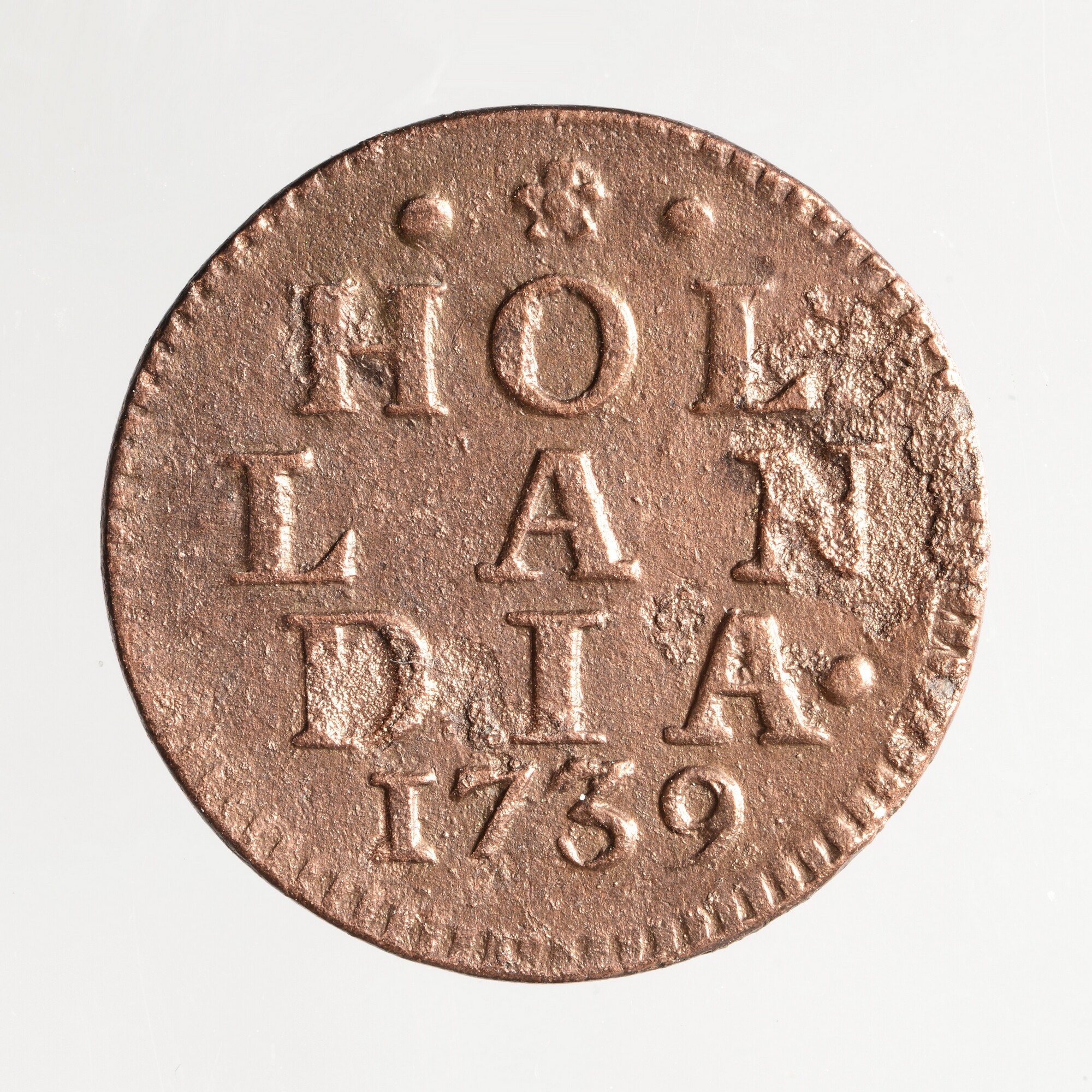 Duit; Holland Provincie (1581-1795); vz.: in vijf regels: •(rozet)• / HOL / LAN / DIA• / 1739; kz.: klimmende leeuw naar links met vrijheidshoed en een lans binnen de Hollandse tuin; muntplaats: Dordrecht; gewicht: 3,29 gram