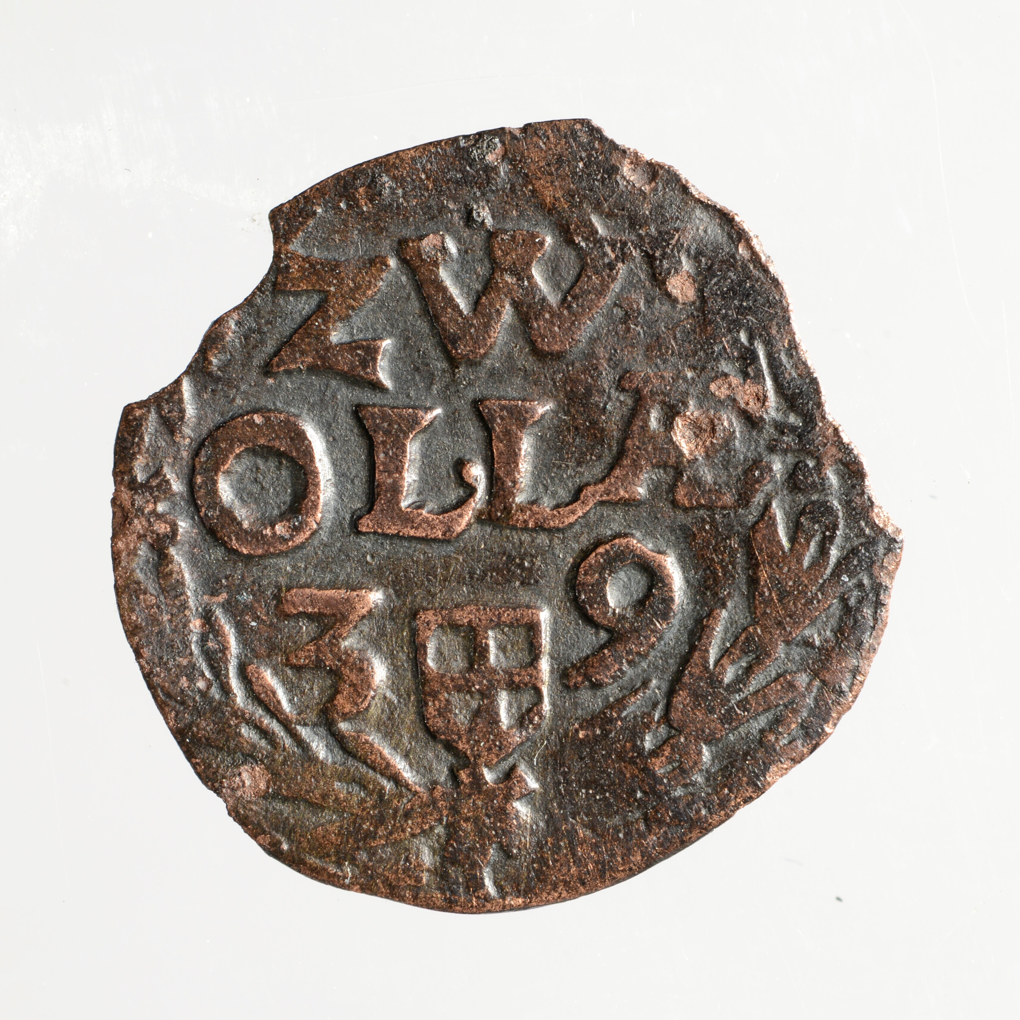 Duit; Zwolle Stad; vz.: tulpkrans met daarin in drie regels ZW / OLLA / 3 (wapenschild) 9; kz.: stadswapen van Zwolle met de heilige Sint Michael die een draak bevecht en omschrift DEVS R[EF]GIV[M NOSTR]; gewicht: 1.23 gram