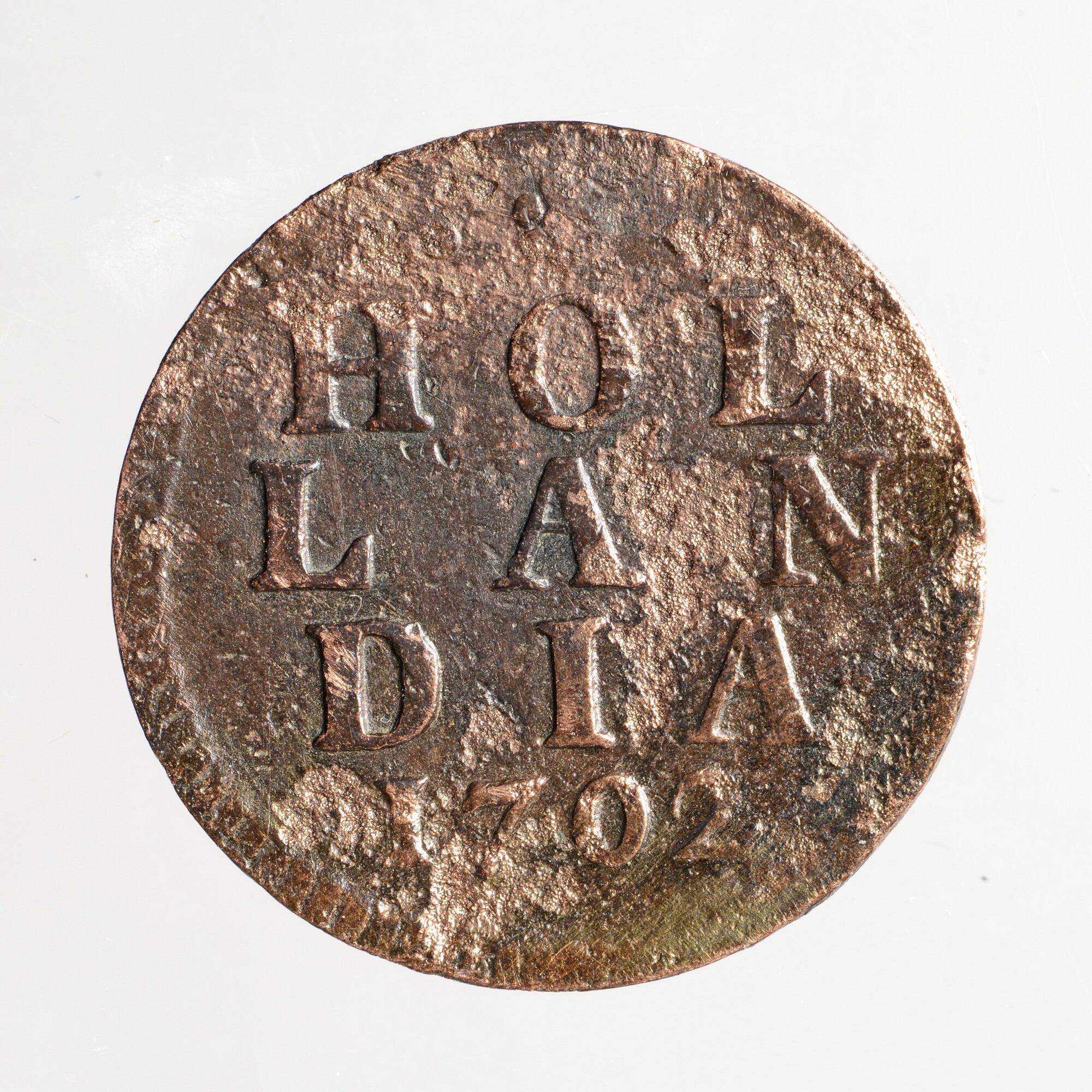Duit; Holland Provincie (1581-1795); vz.: in vijf regels: • (rozet) • / HOL / LAN / DIA • / 1702; kz.: klimmende leeuw naar links met lans en vrijheidshoed binnen een gesloten Hollandse tuin; muntplaats: Dordrecht; gewicht: 4.28 gram
