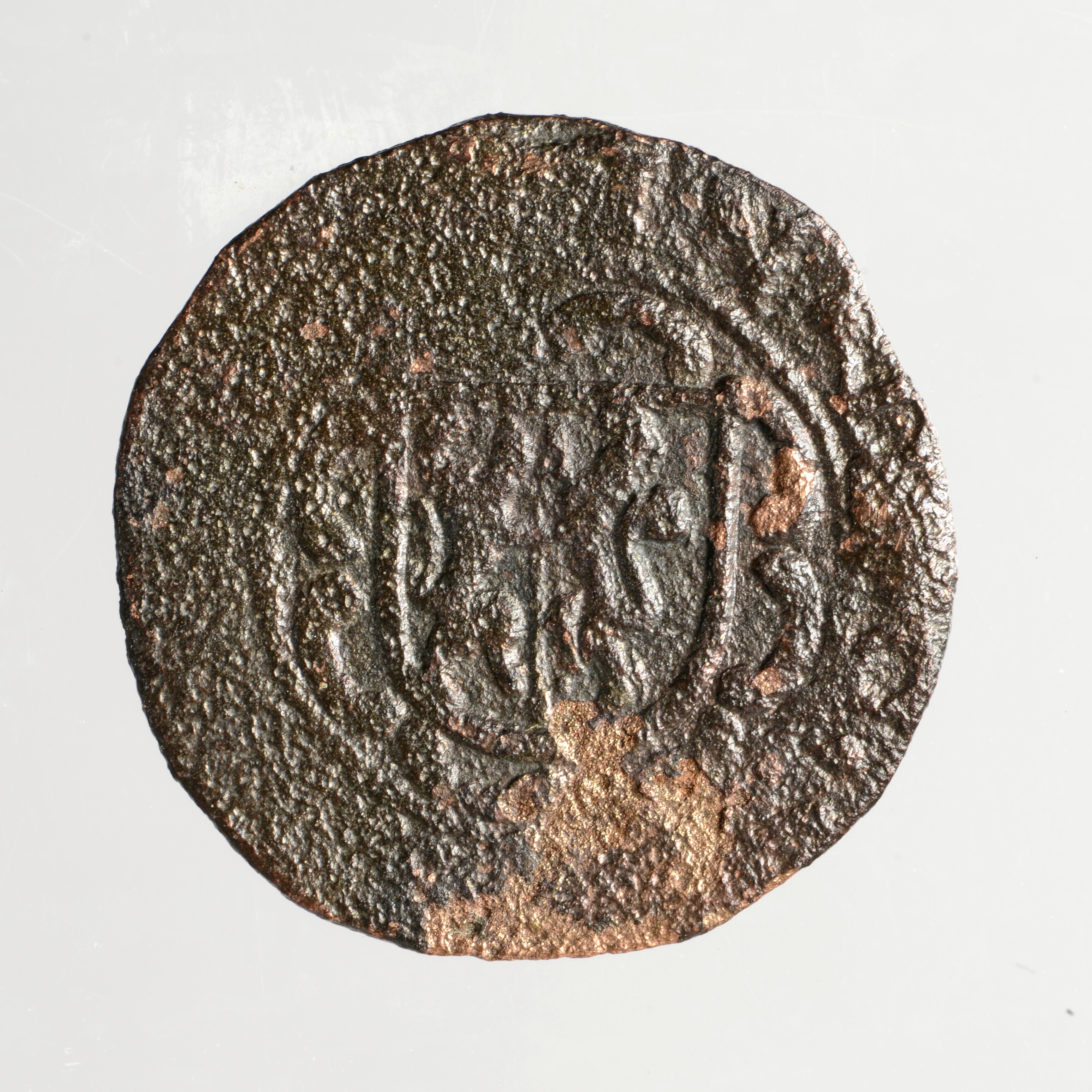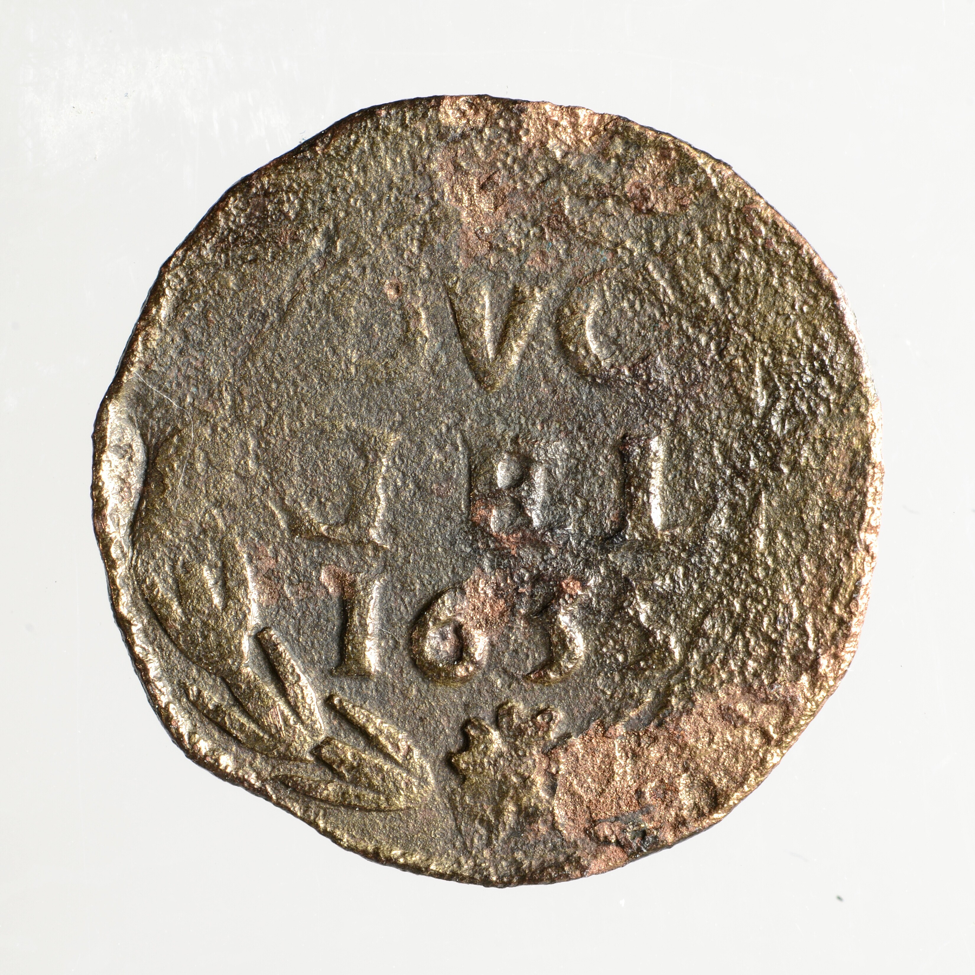 Duit; Gelderland Provincie (1581-1795); vz.: in drie regels: DVC / GEL / 1635; kz.: wapenschild van Gelderland in achtpas met omschrift IN • DEO • [SPES • NOSTRA]; muntplaats: Harderwijk; gewicht: 1.45 gram