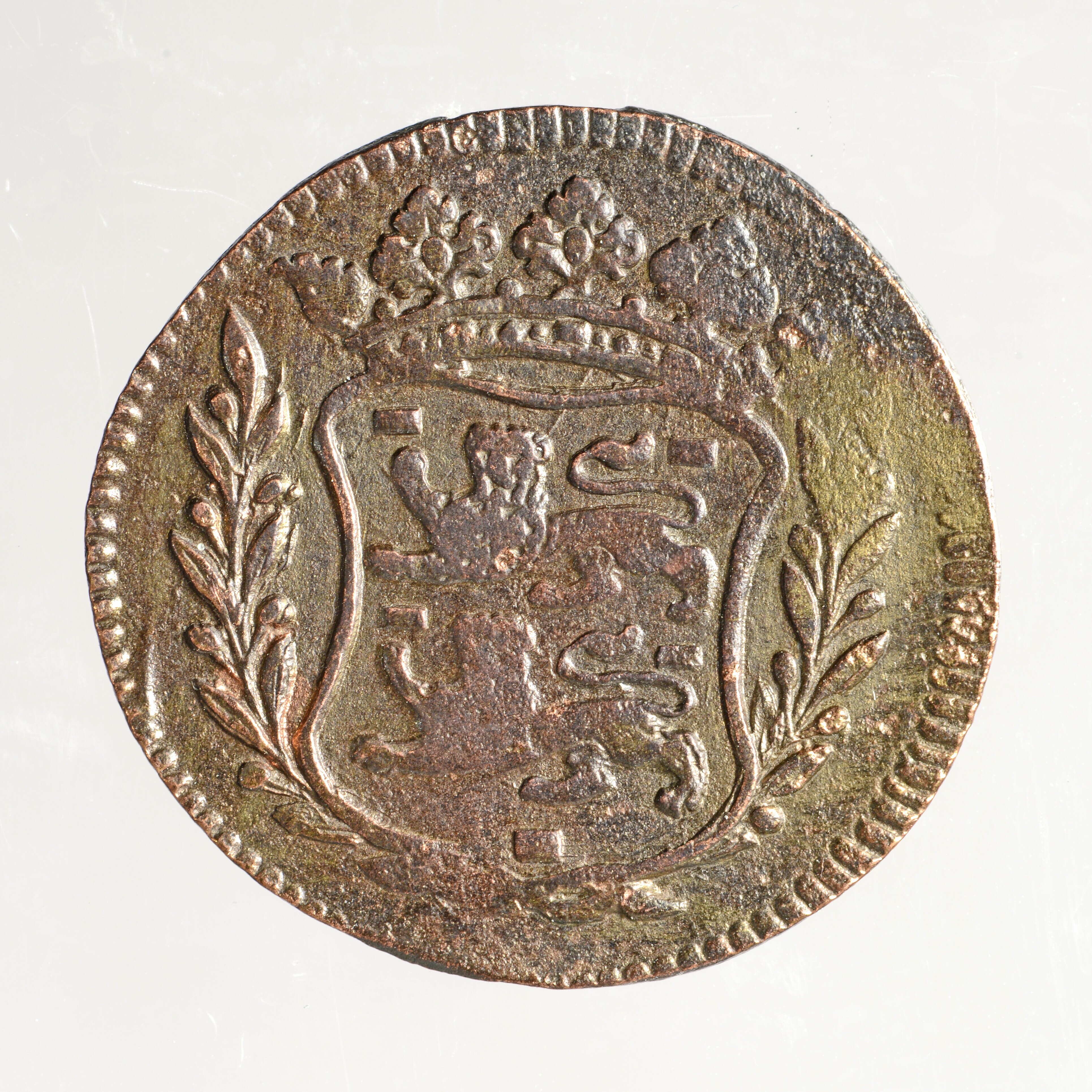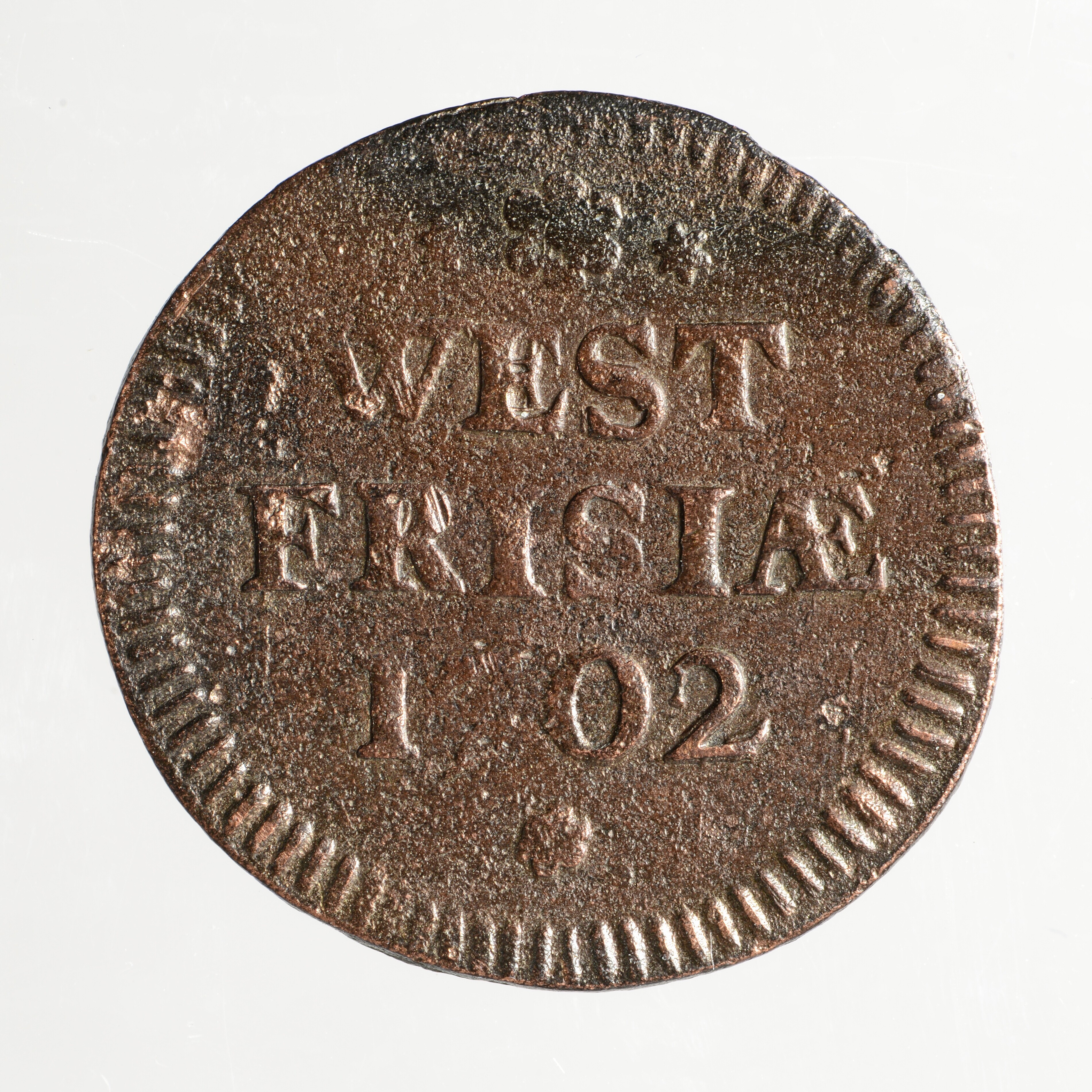 Duit; West-Friesland; vz.: in zes regels rozet (knol) rozet / WEST / FRI / SIAE / 1702 / rozet; kz.: gekroond en aan beide zijden met lauwertakken versierd wapenschild van West-Friesland; muntplaats: Enkhuizen; gewicht: 3.37 gram