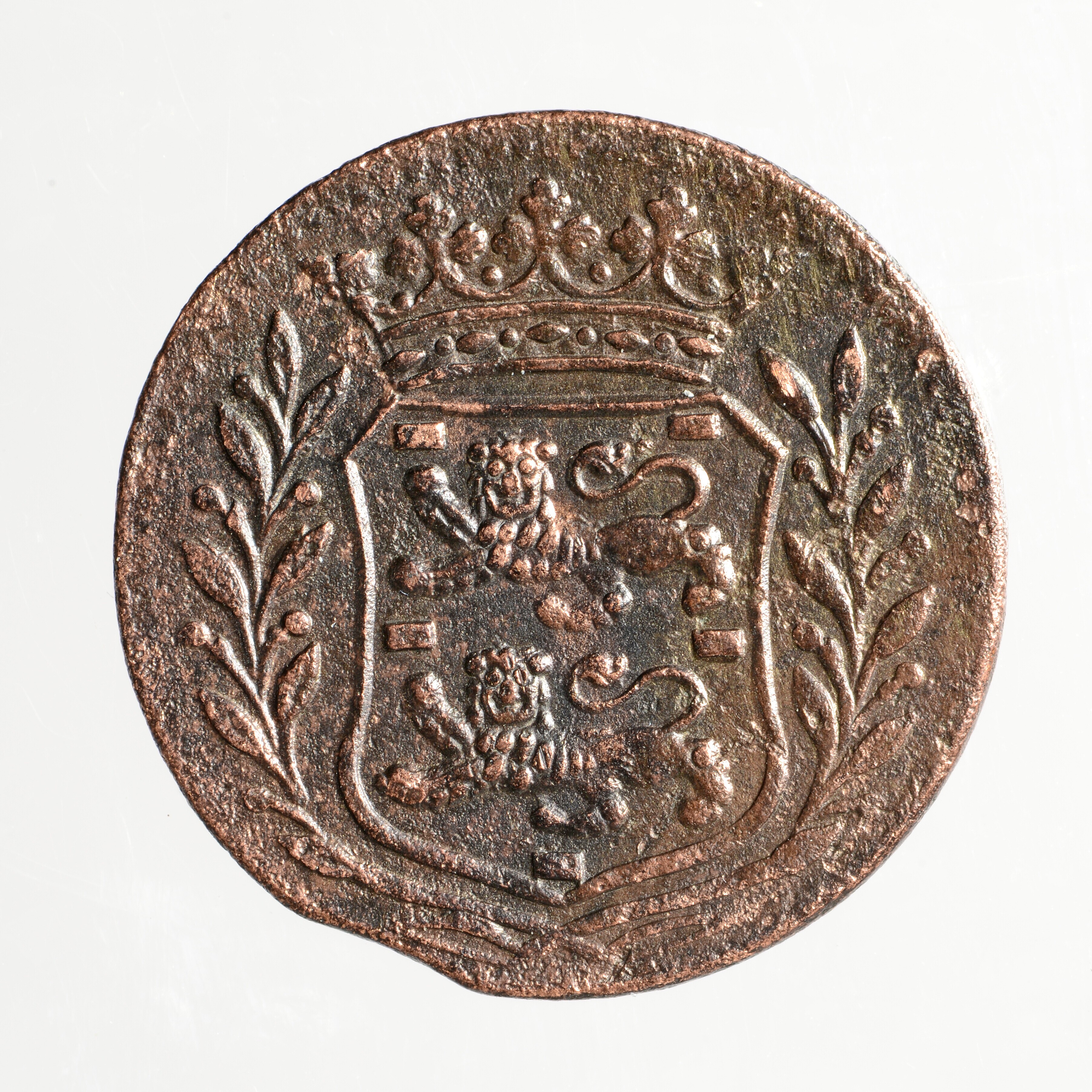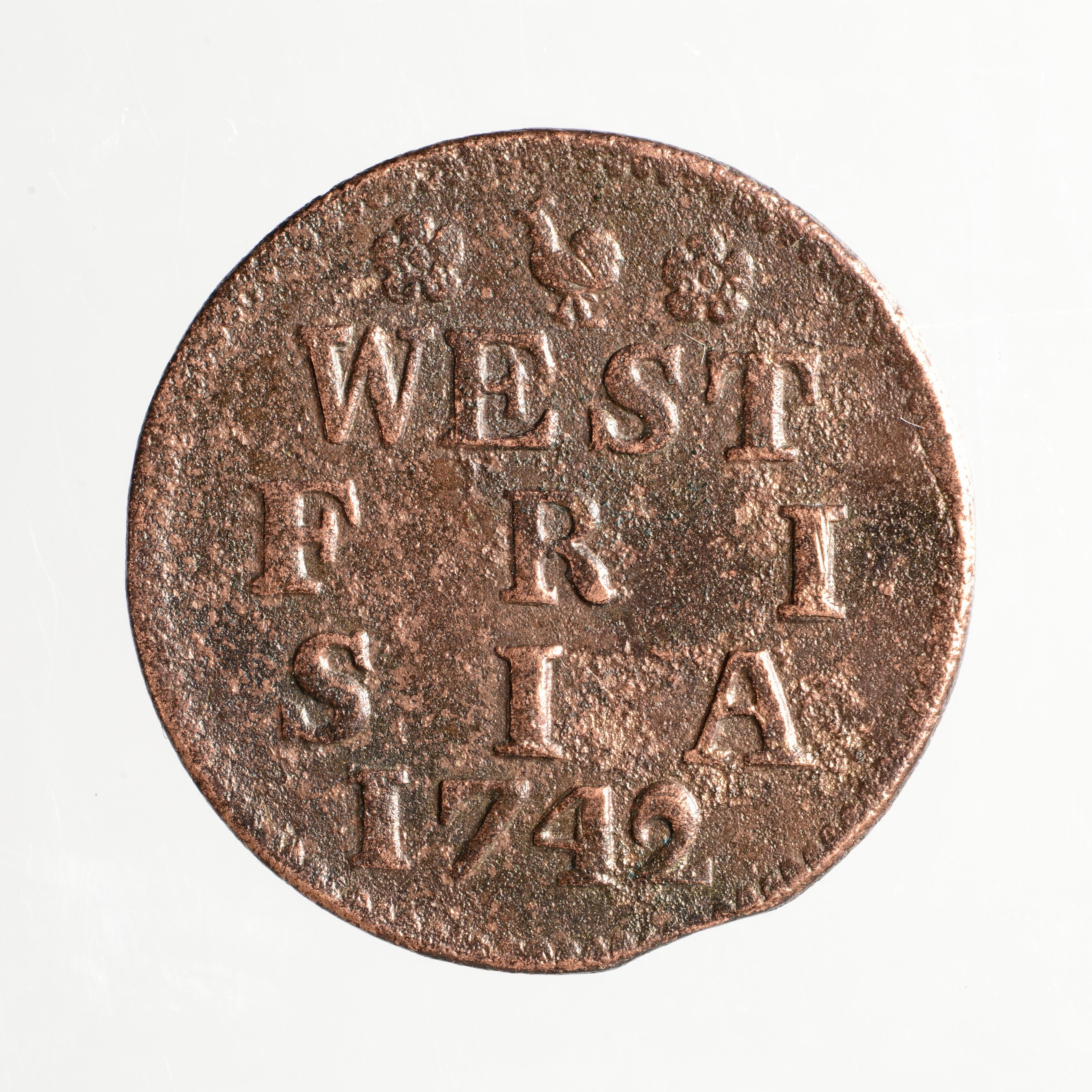 Duit; West-Friesland; vz.: in vijf regels rozet (haan) rozet / WEST / FRI / SIA / 1742; kz.: gekroond en aan beide zijden met lauwertakken versierd wapenschild van West-Friesland; muntplaats: Medemblik; gewicht: 3.37 gram