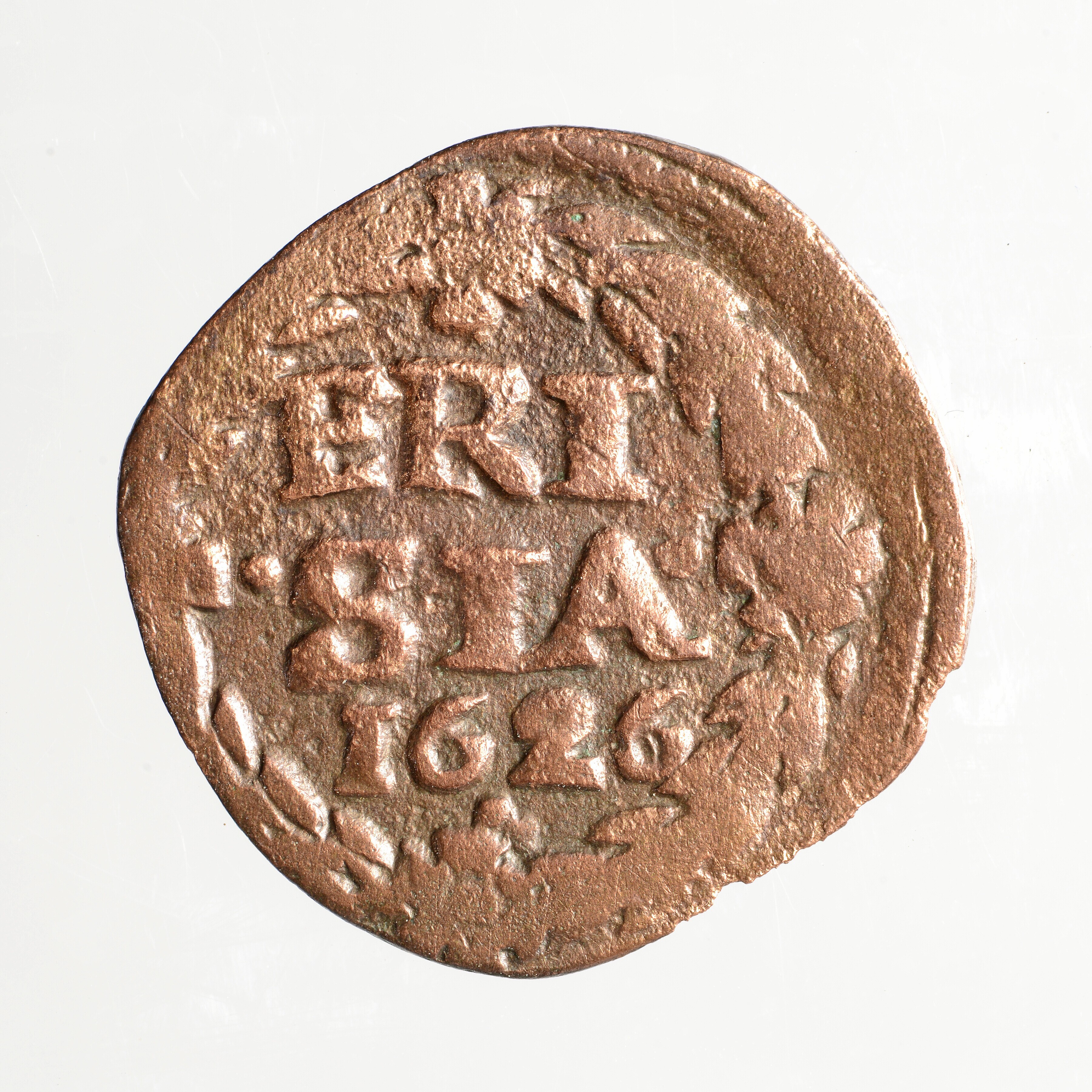 Duit; Friesland Provincie (1581-1795); vz.: binnen een bladerkrans in drie regels FRI / SIA / 1626; kz.: gekroond wapenschild van Friesland, met omschrift NISI • DNS • NOBISCVM; muntplaats: Leeuwarden; gewicht: 1.93 gram