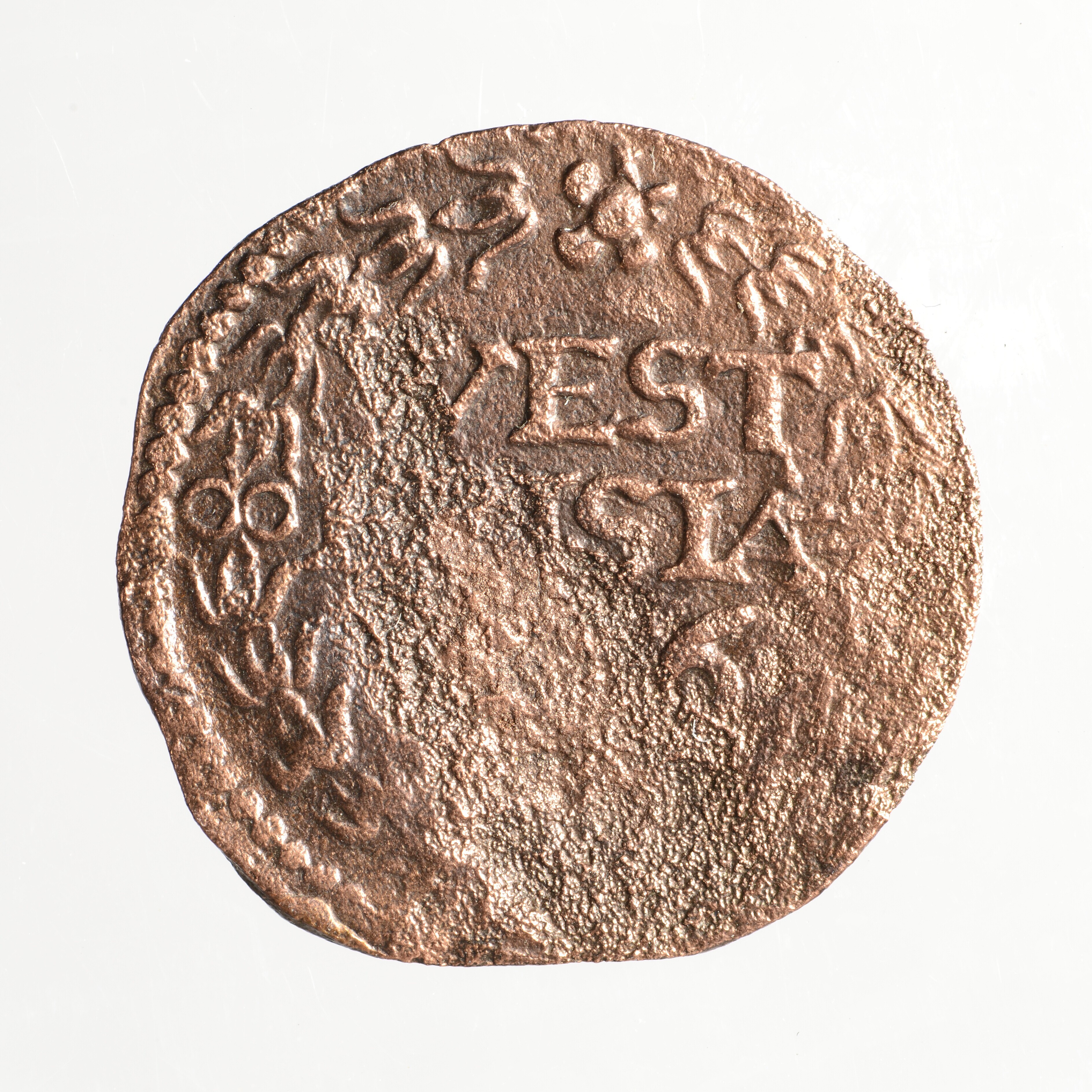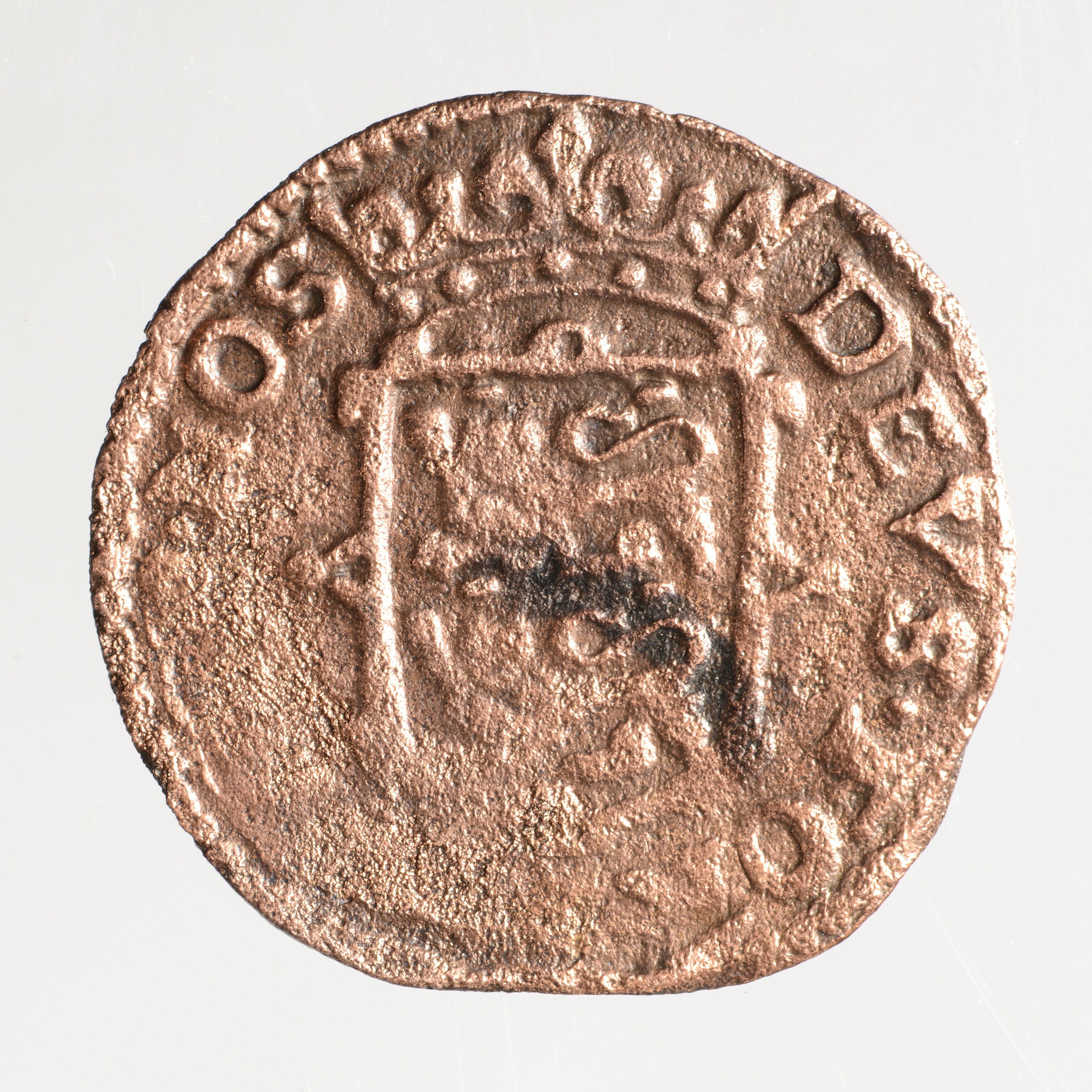 Duit; West-Friesland; vz.: binnen tulpkrans in drie regels WEST / FRISIAE / [....]; kz.: gekroond wapenschild van West-Friesland, omschrift: DEVS • FORTI • ET • SPES • NOS; gewicht: 1.79 gram