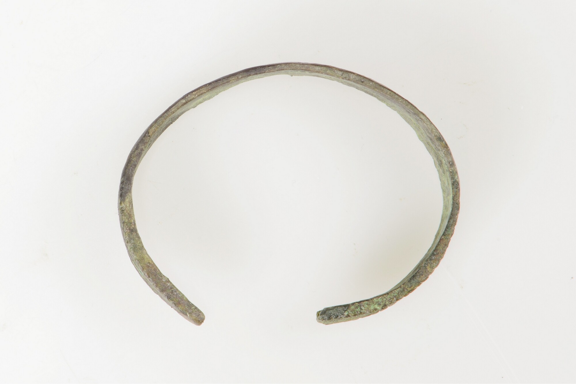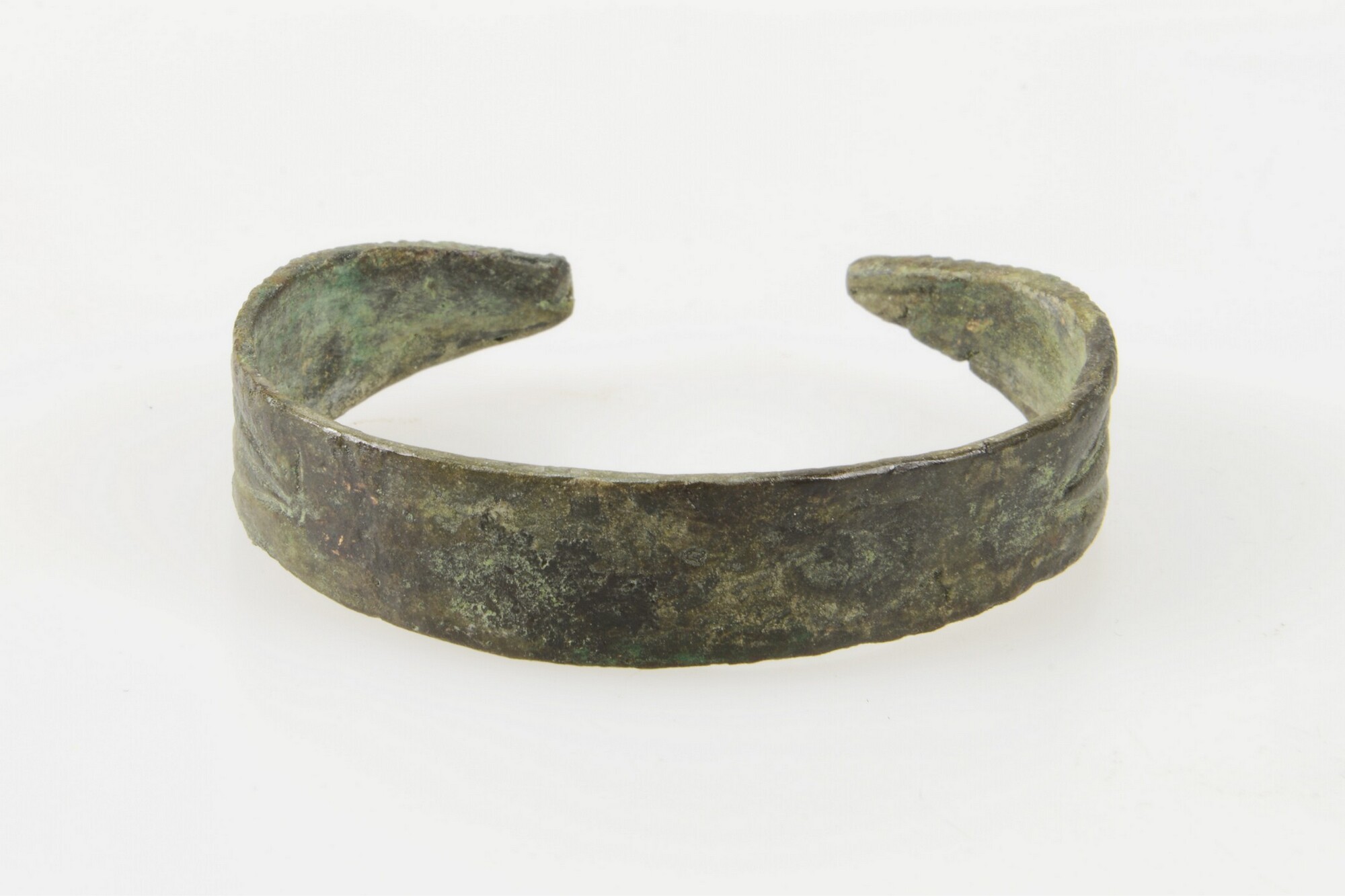 Armband; bandvormig; de uiteinden van de armband zijn verbreed en lopen uit in een punt; versierd met een bladvormig reliëf van lijnen; parelrand langs de uiteinden