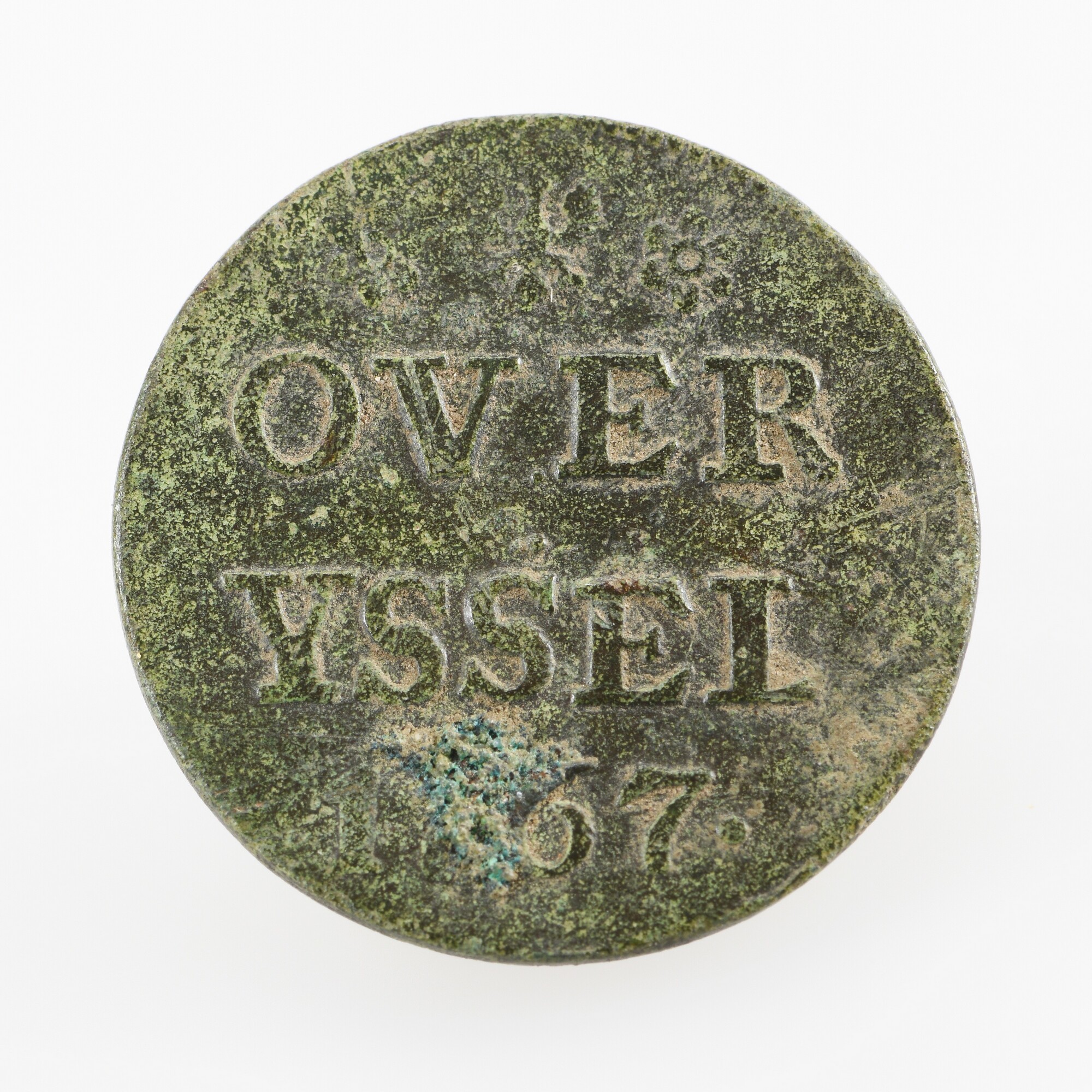 Duit; Overijssel Provincie (1581-1795); vz.: in vier regels: rozet (adelaar) rozet / OVER / YSSEL / 1765; kz.: gekroond wapenschild van Overijssel, met omschrift VIGILATE – ET ORATE; muntplaats: Kampen; gewicht: 2.96 gram